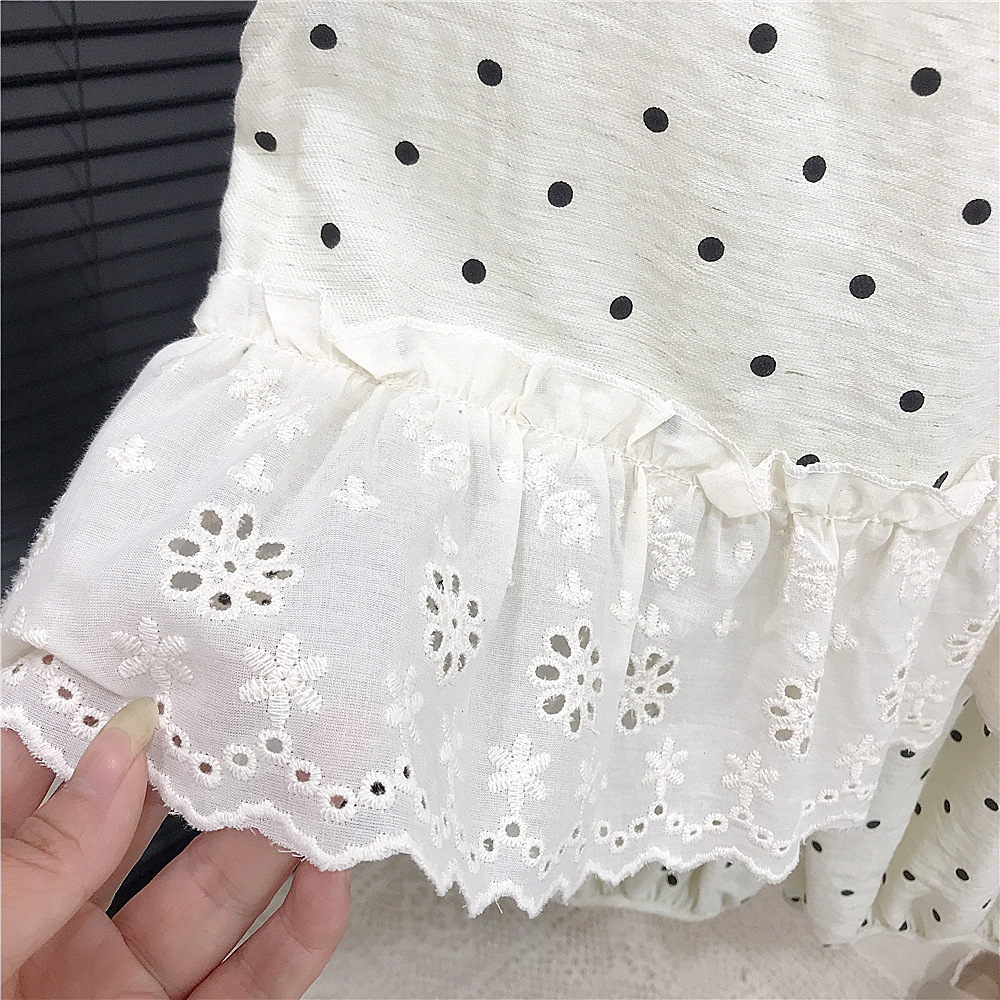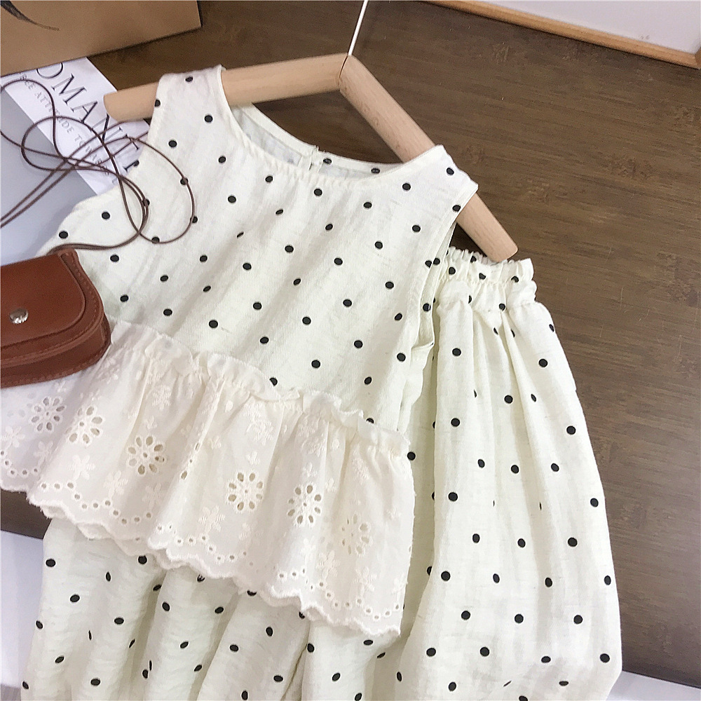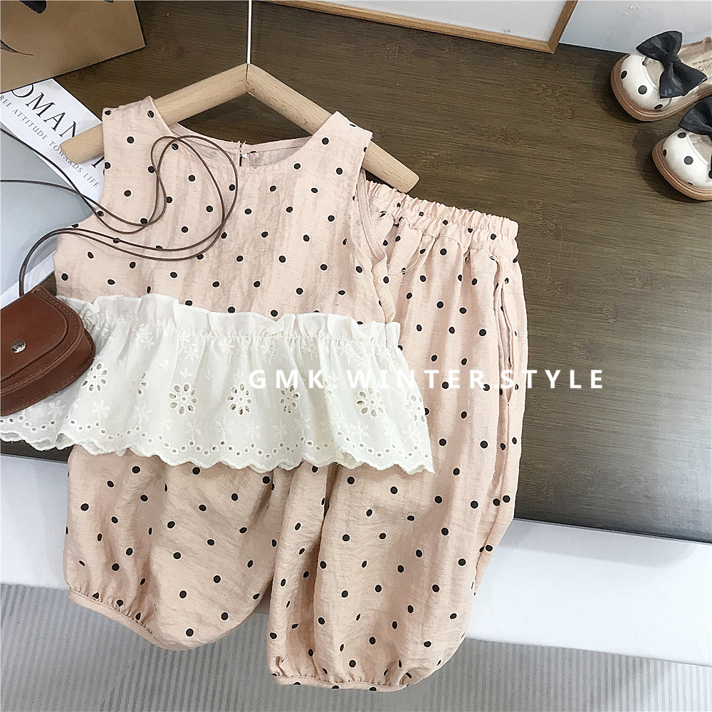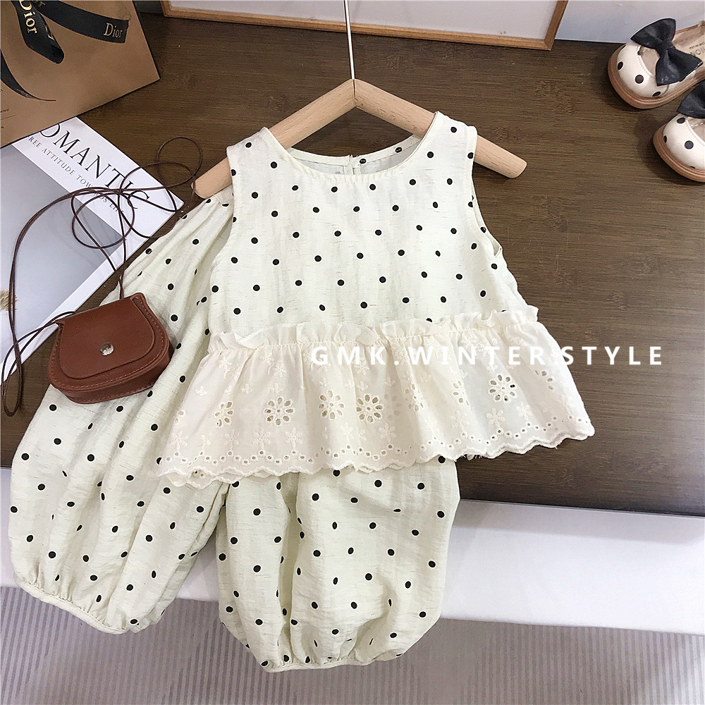 여자 아동복 여름 새로운 여성의 보물 패션 폴로 도트 레이스 민소매 조끼 최고 세련된 바지 세트 대외 무역스토어 가기
