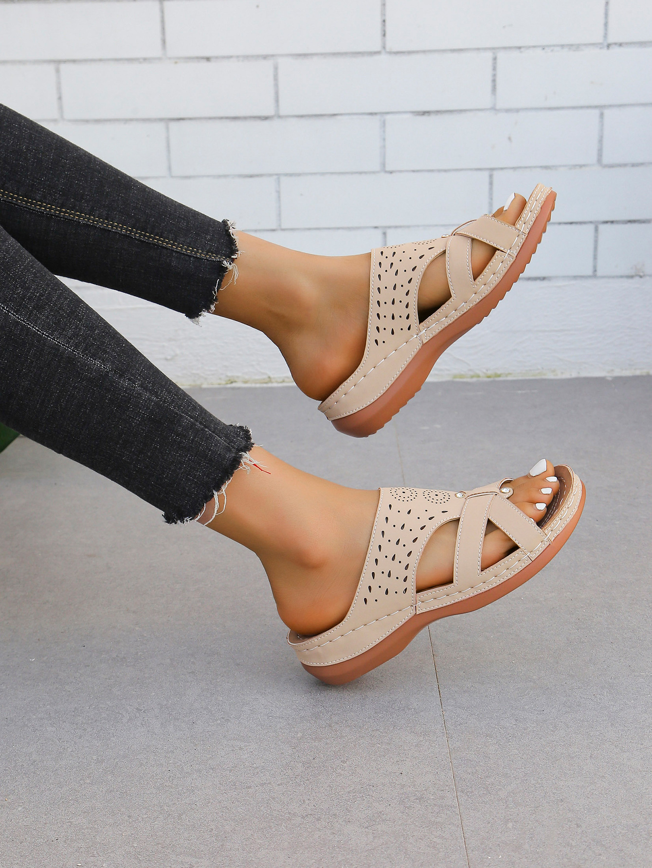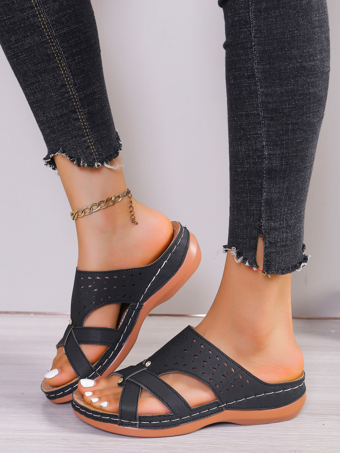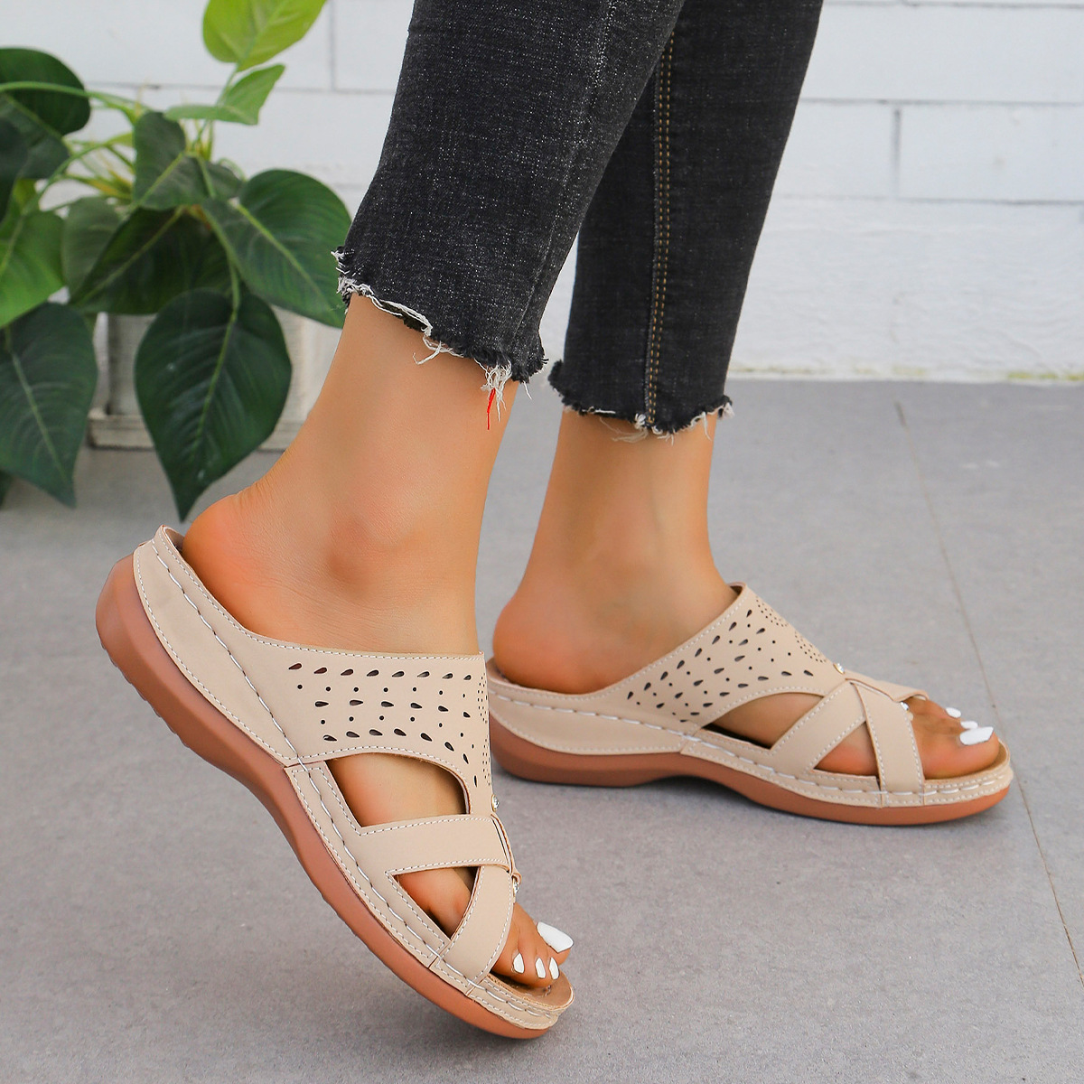 유럽과 미국의 웨지 슬리퍼 2025 여름 둥근 발가락 두꺼운 밑창 패션 캐주얼 겉옷 여성이 밖에서 신을 수 있는 한 줄 샌들스토어 가기