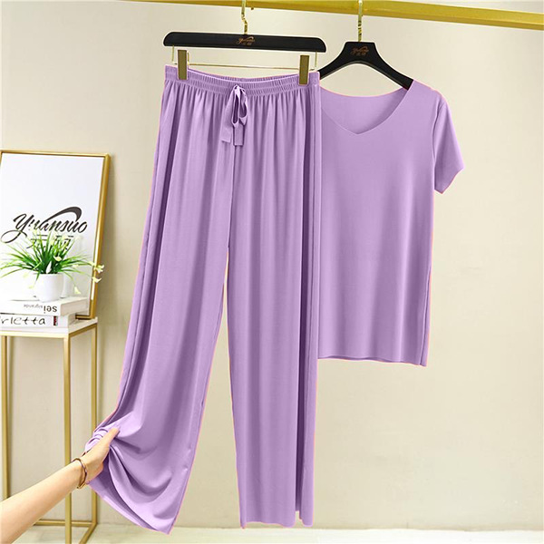 여성용 아이스 실크 잠옷 여름 투피스 슈트 브이넥 반팔 티셔츠 얇은 홈웨어 루즈 와이드 레그 팬츠 드롭쉬핑