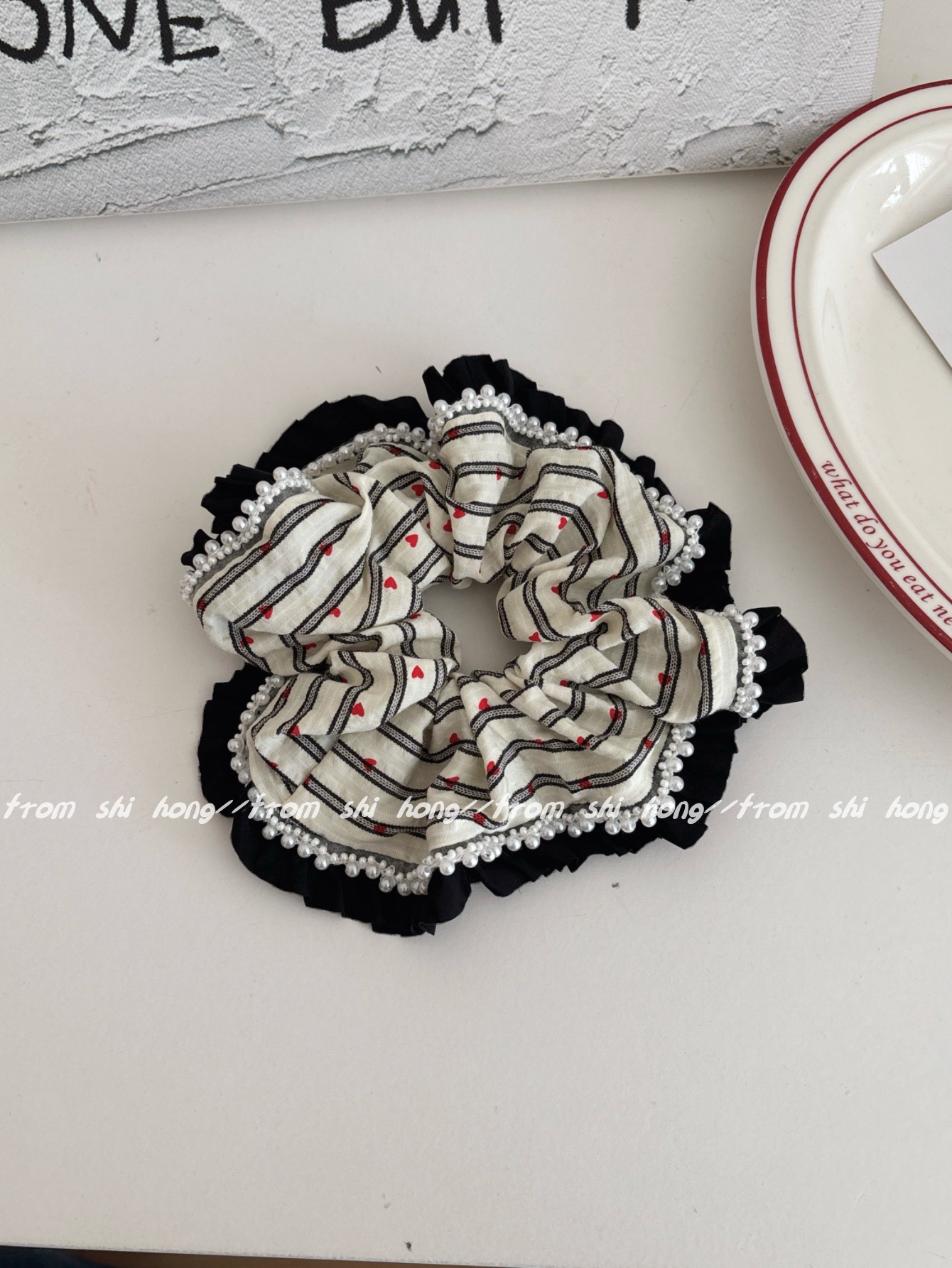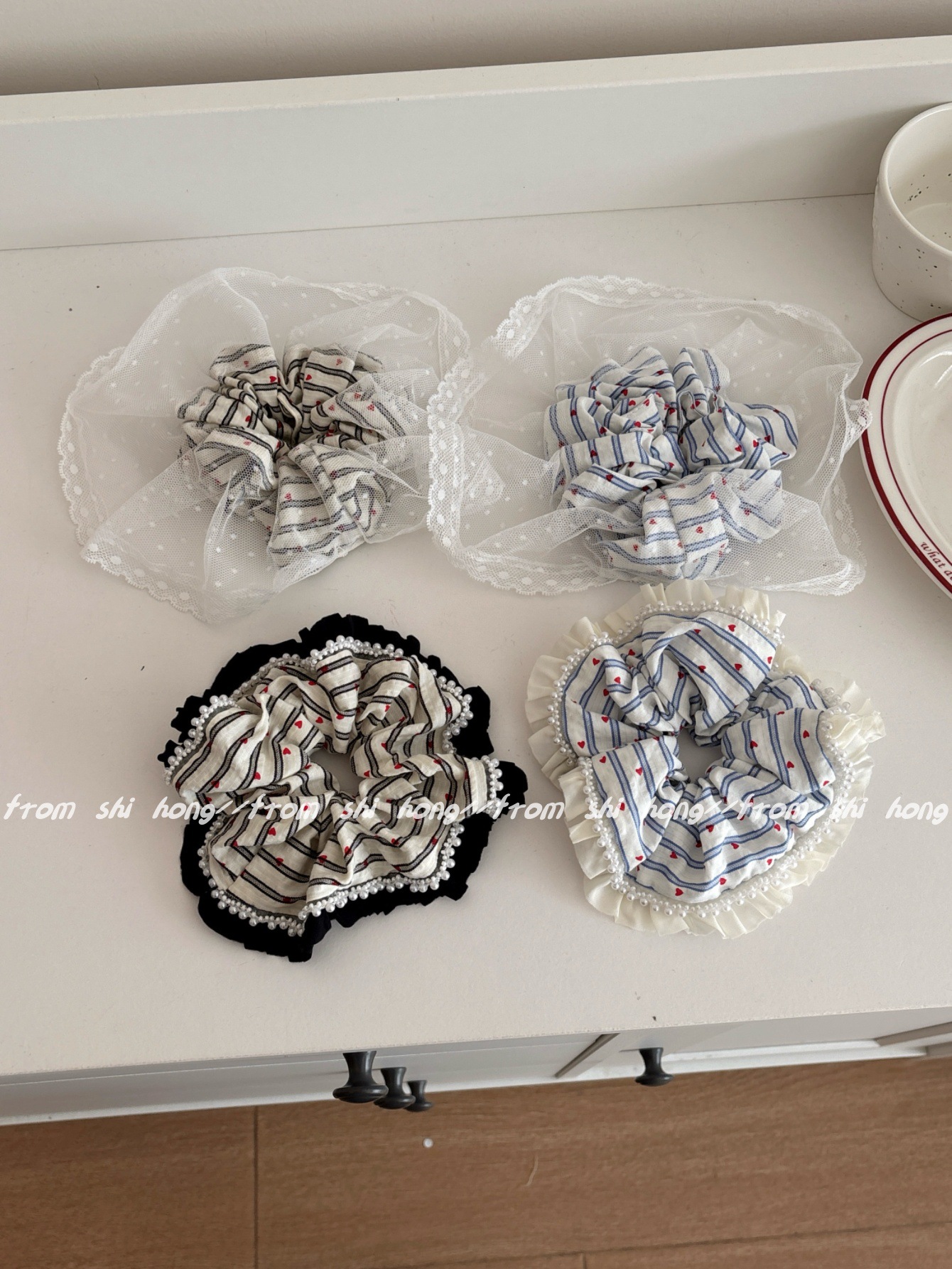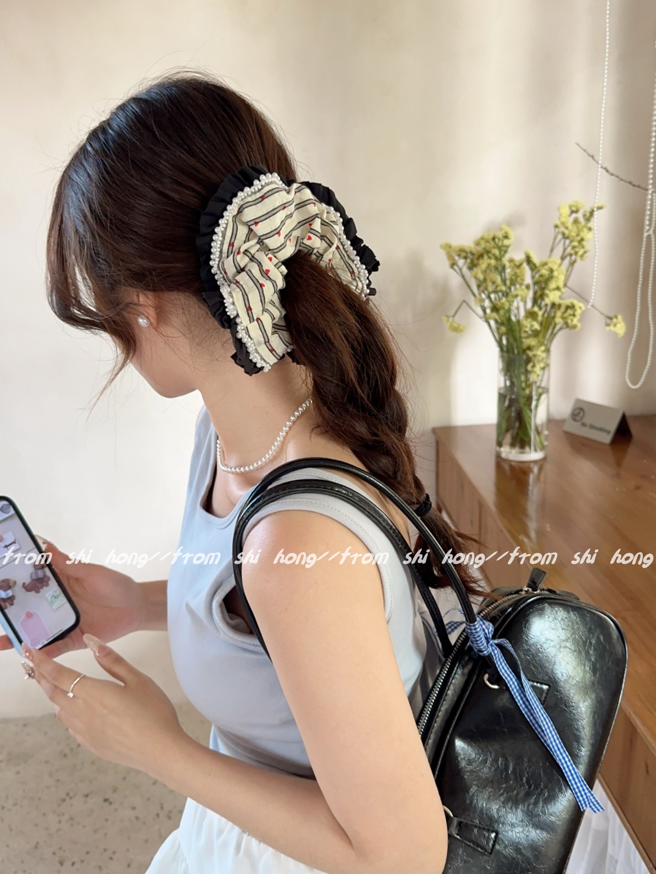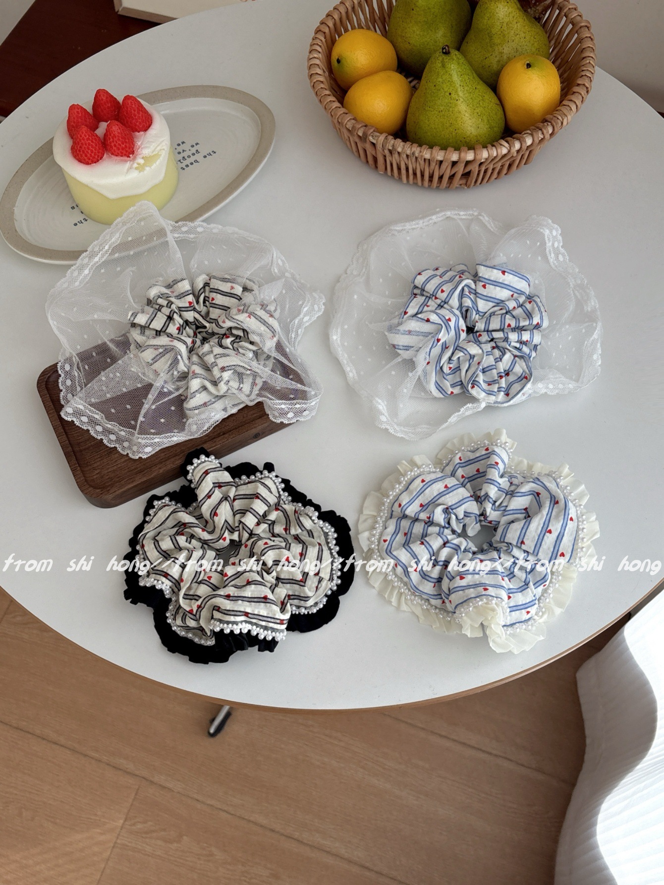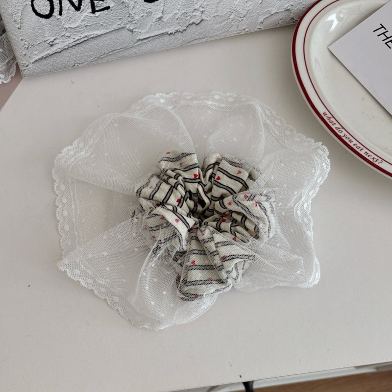 프랑스 발레 스타일 레드 하트 스트라이프 레이스 대형 장내 헤어 링 2025 새로운 봄과 여름 달콤하고 부드러운 헤어 로프스토어 가기