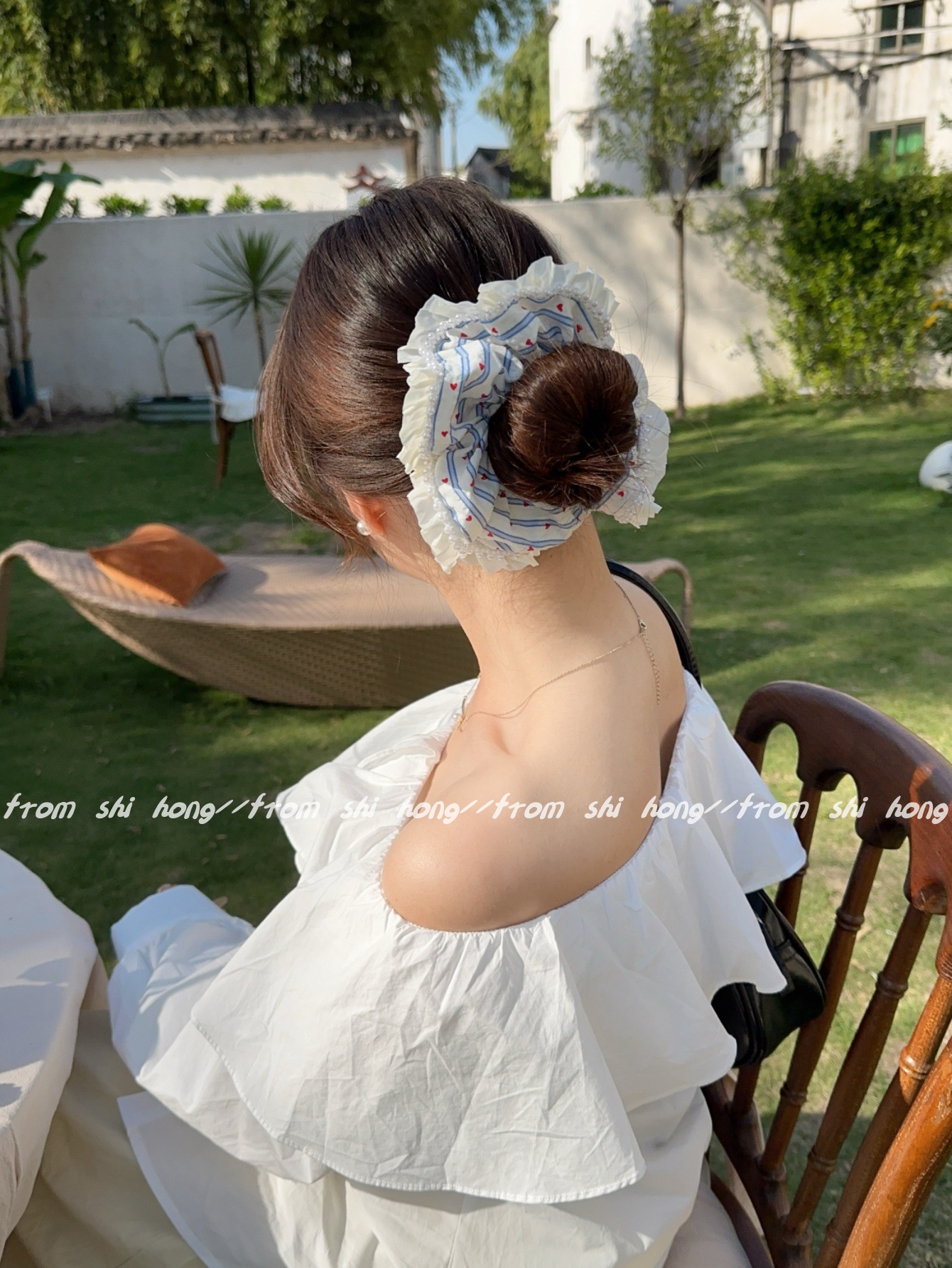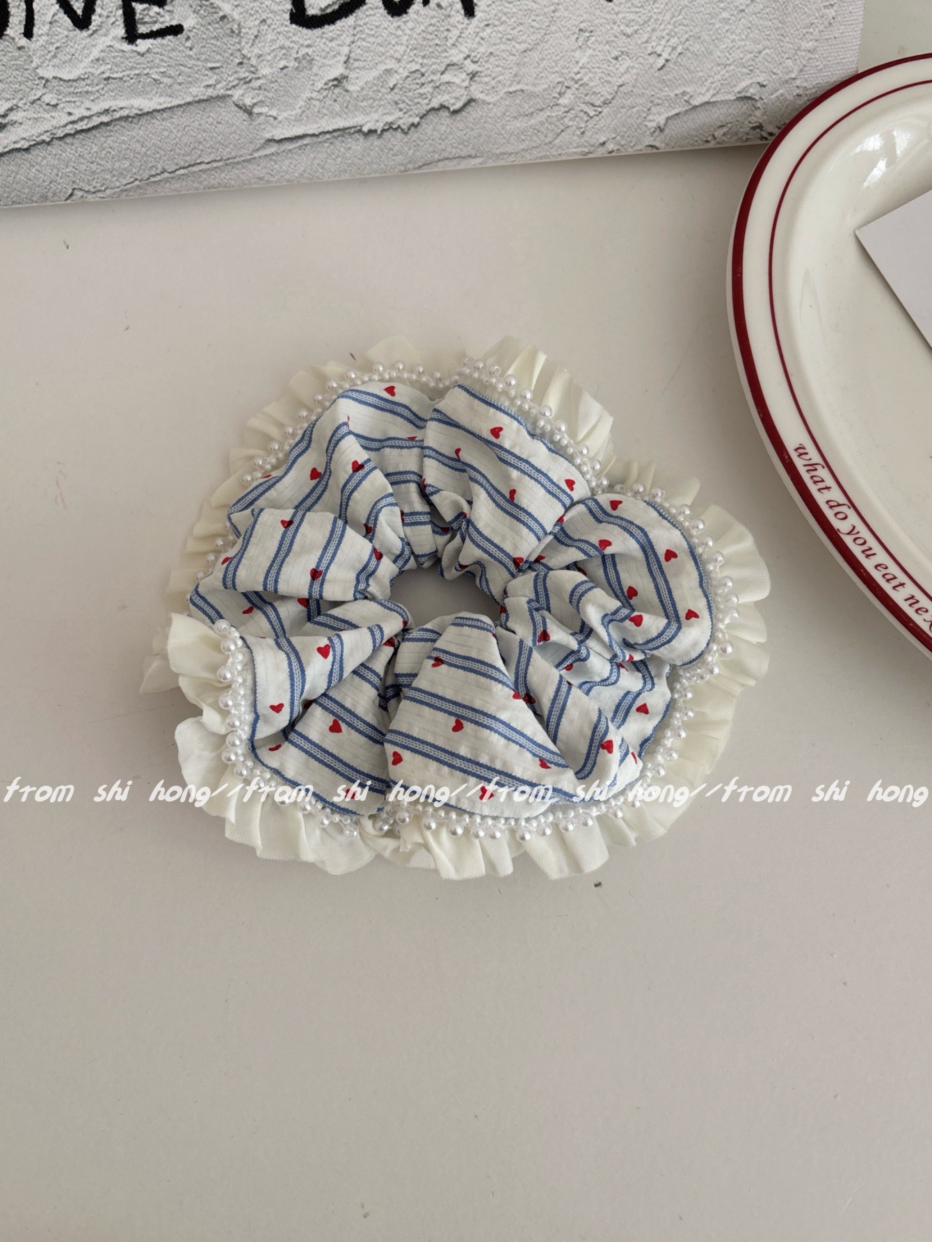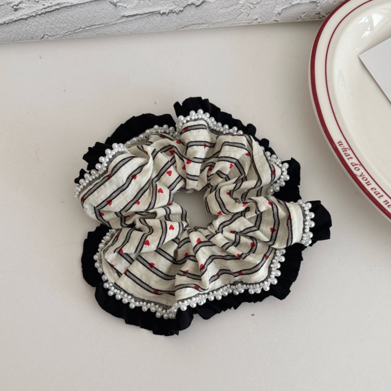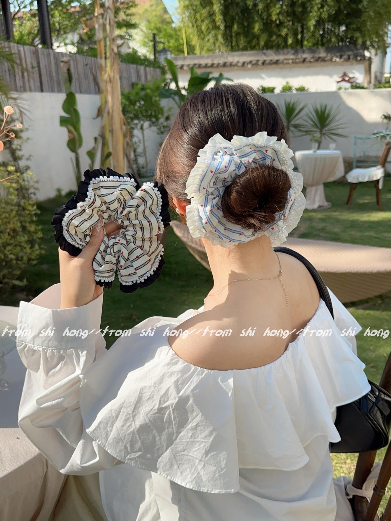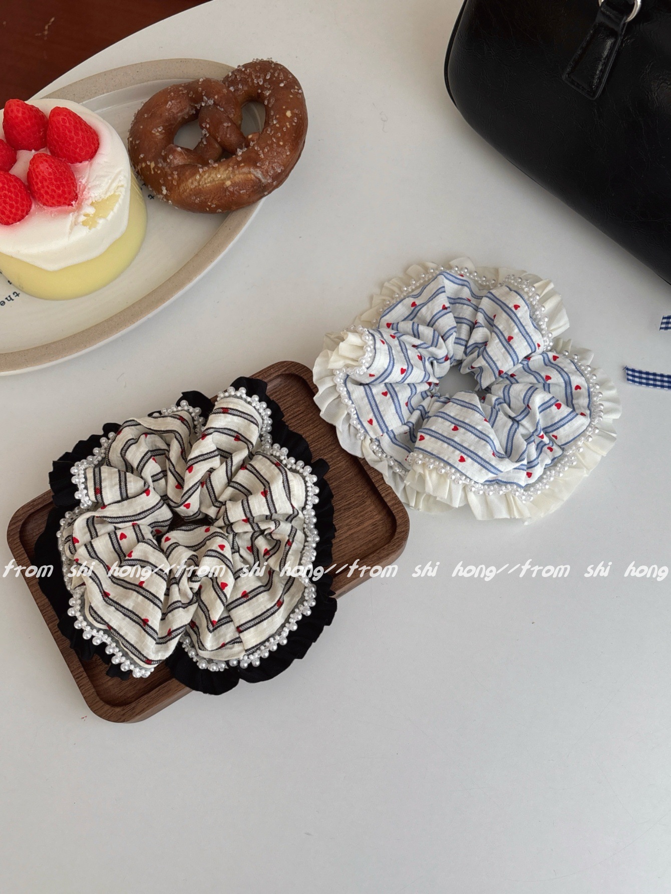 프랑스 발레 스타일 레드 하트 스트라이프 레이스 대형 장내 헤어 링 2025 새로운 봄과 여름 달콤하고 부드러운 헤어 로프스토어 가기