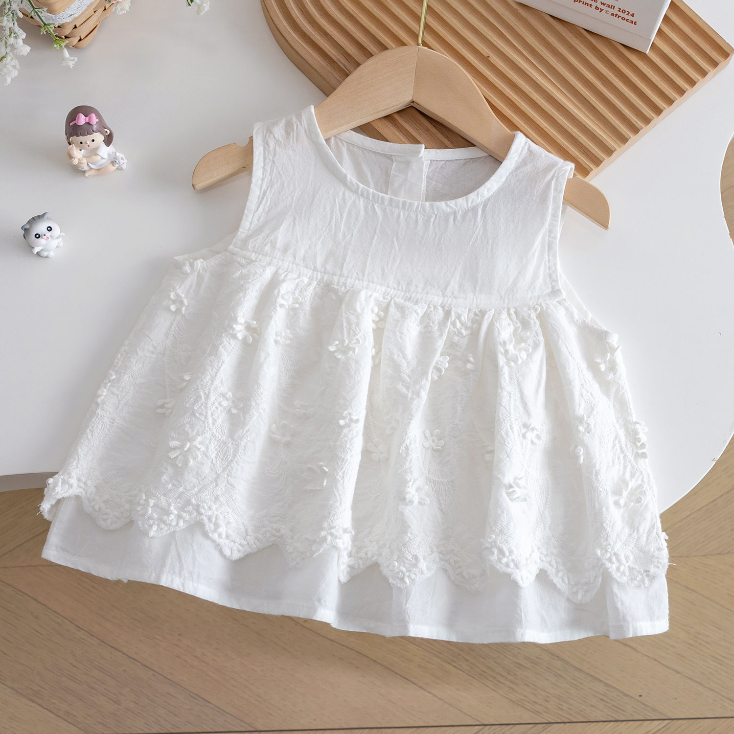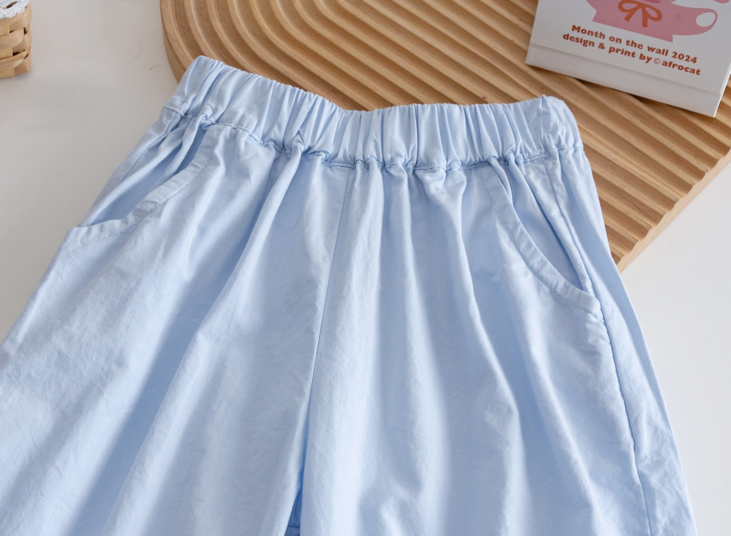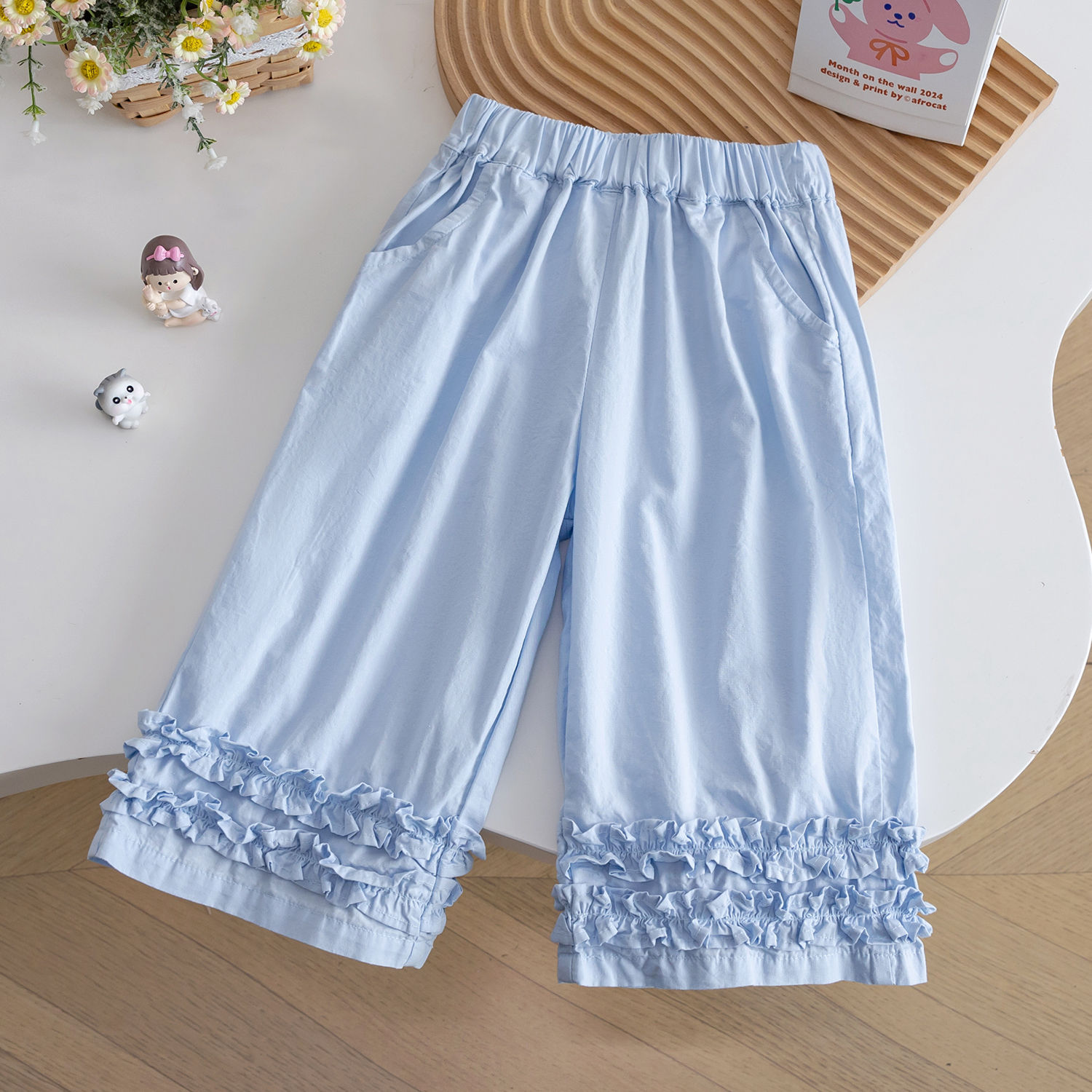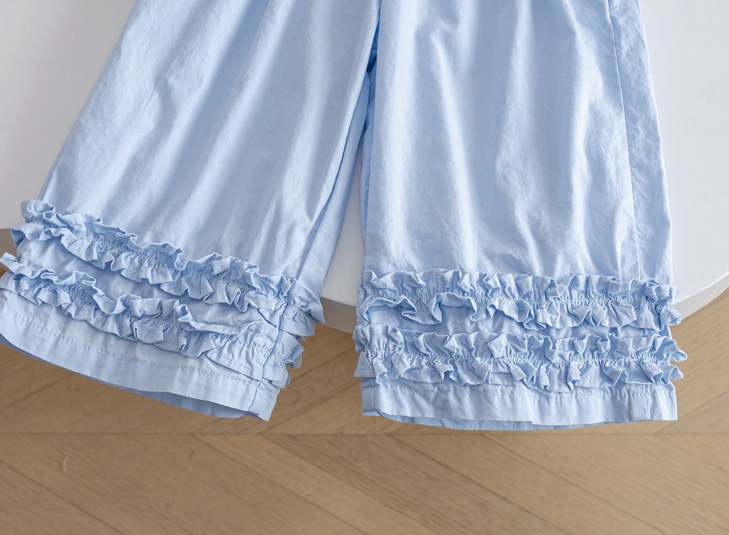 한국 걸스 여름 샤넬 스타일 세트 2025 새로운 도착 화이트 레이스 베델 셔츠 올 매치 로터스 리프 와이드 레그 바지스토어 가기