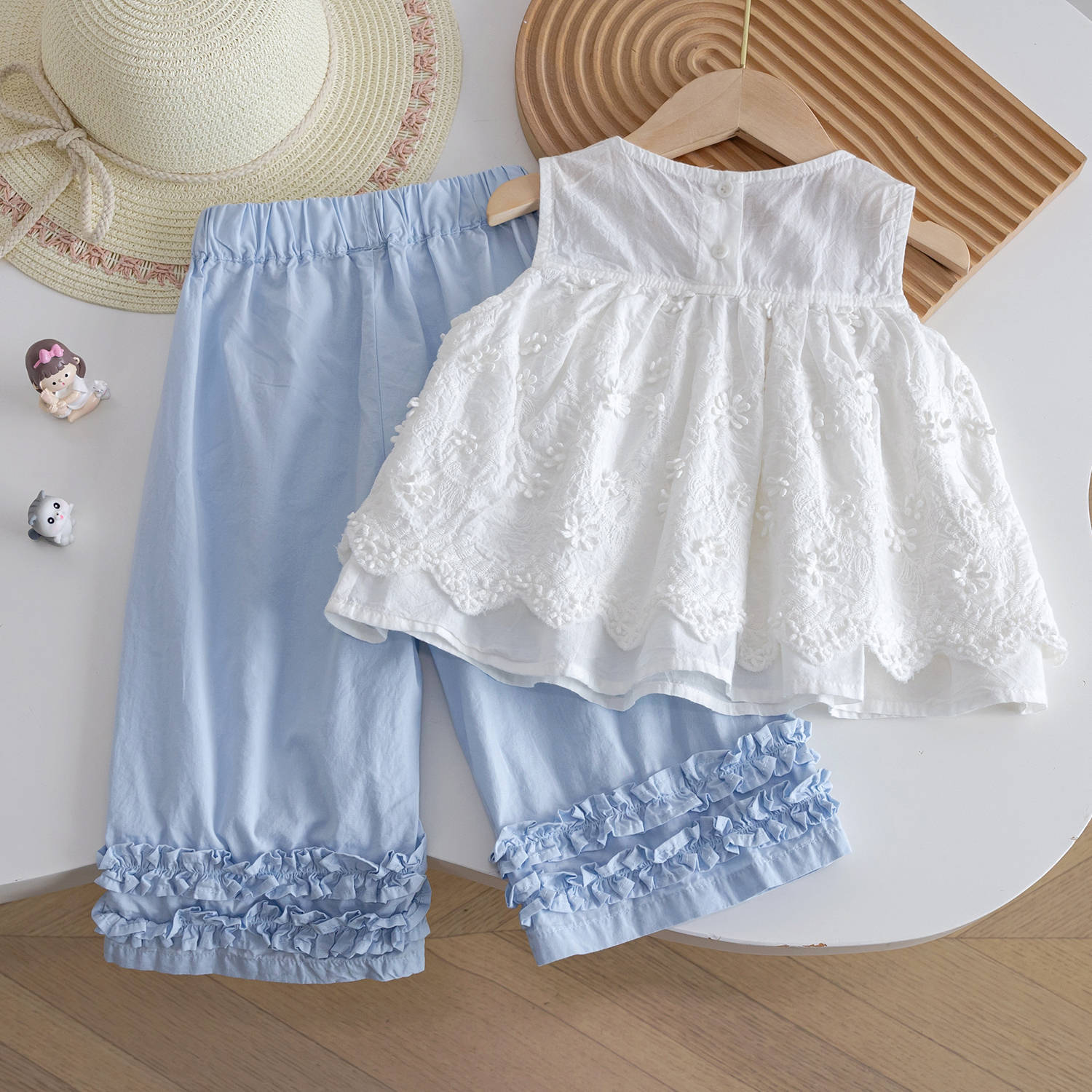 한국 걸스 여름 샤넬 스타일 세트 2025 새로운 도착 화이트 레이스 베델 셔츠 올 매치 로터스 리프 와이드 레그 바지