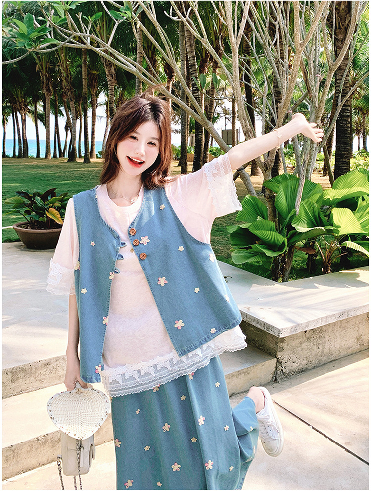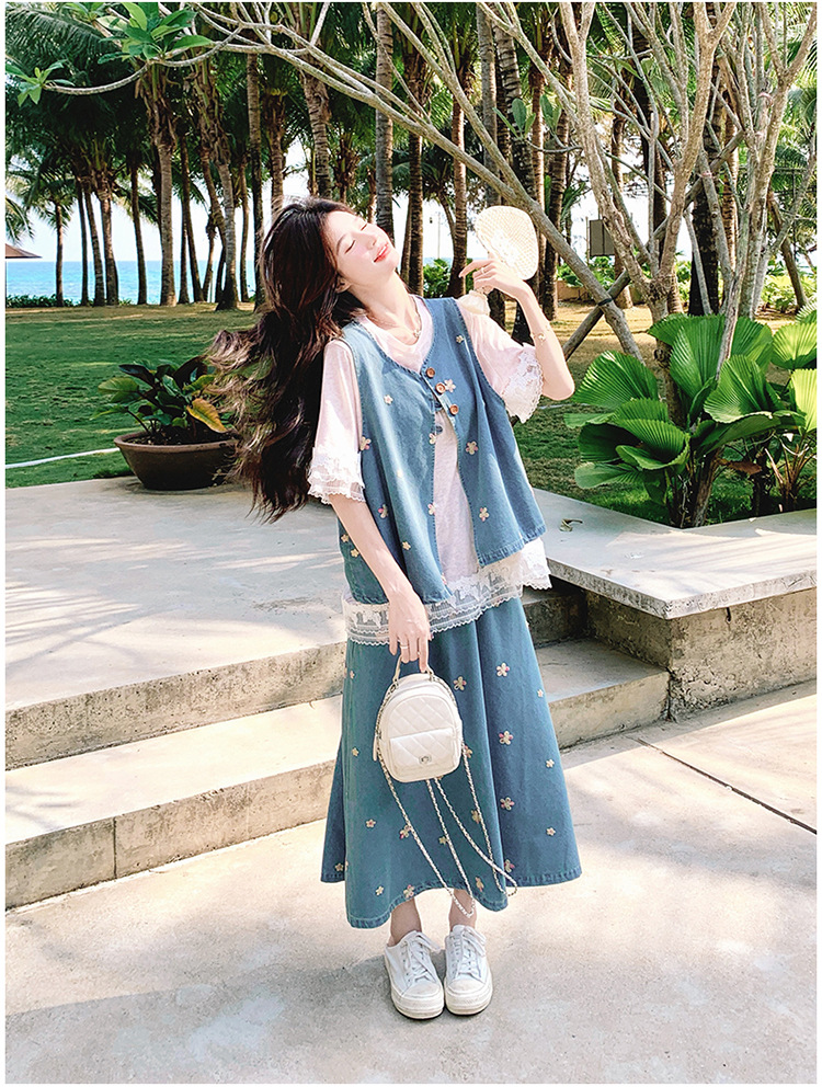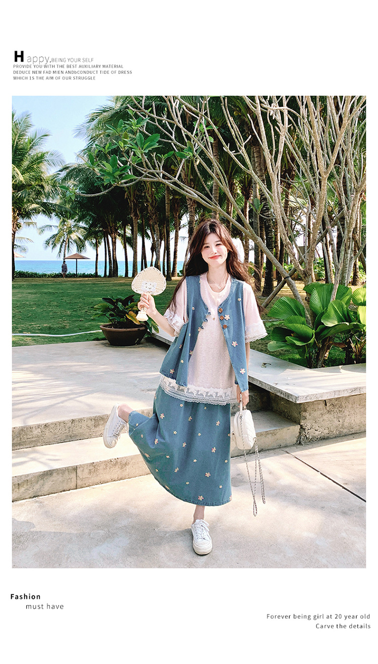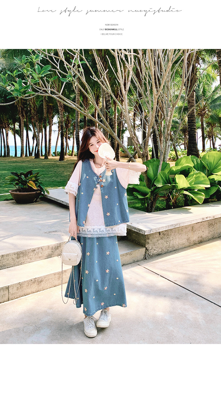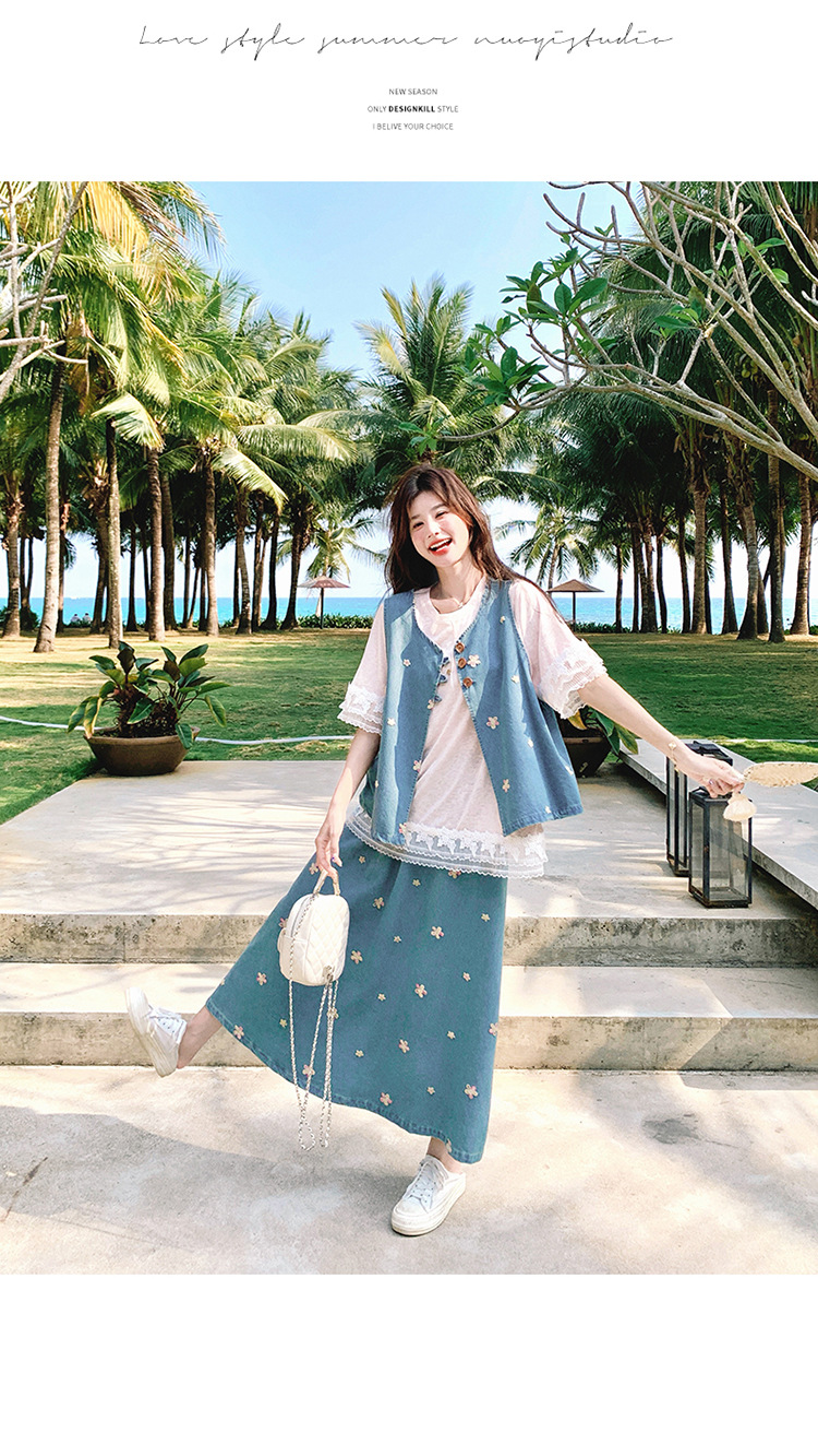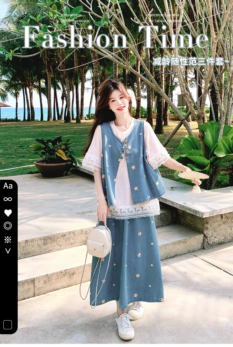 리얼 샷 소금 달콤한 데님 자수 조끼 3 피스 세트 여성 여름 새로운 레이스 티셔츠 스커트 세트 원피스