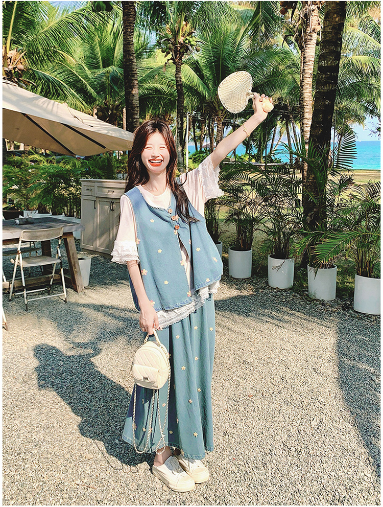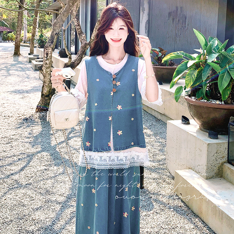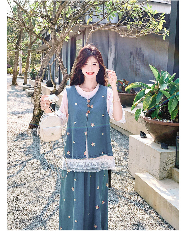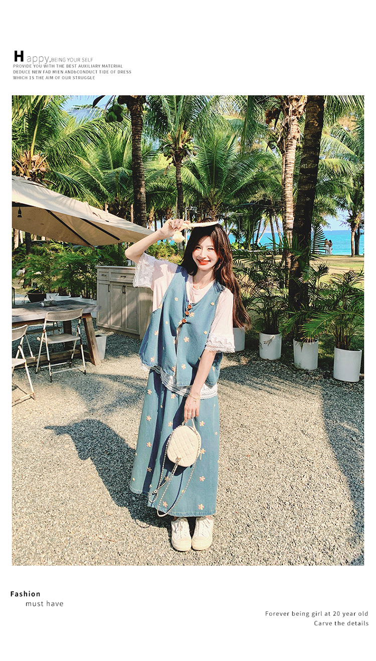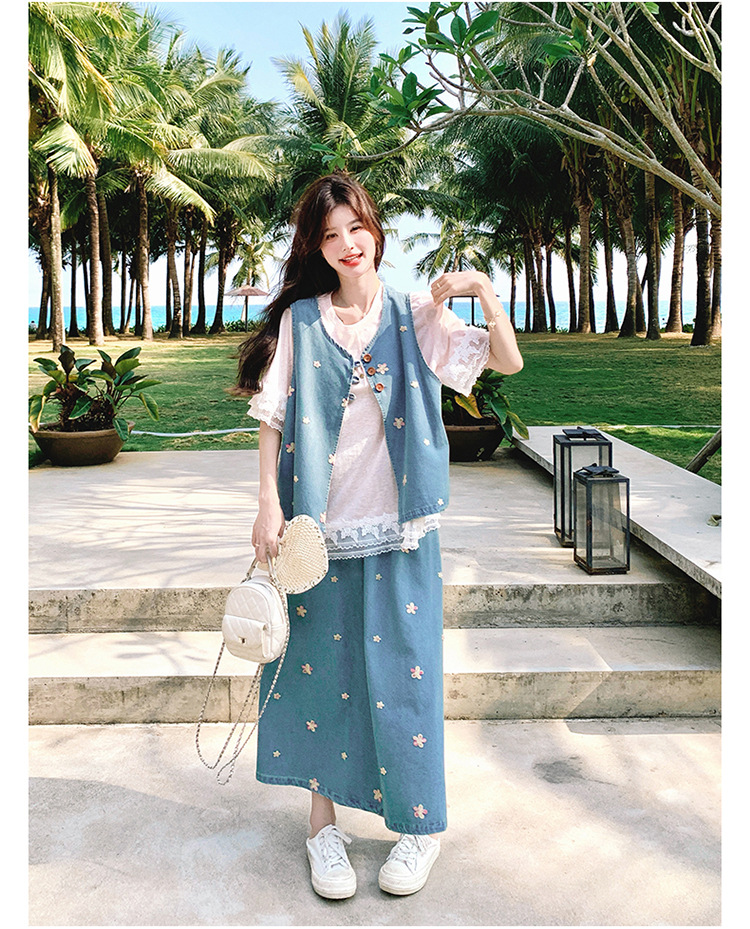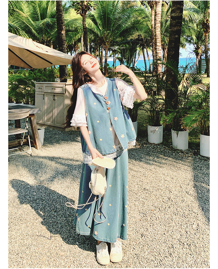리얼 샷 소금 달콤한 데님 자수 조끼 3 피스 세트 여성 여름 새로운 레이스 티셔츠 스커트 세트 원피스