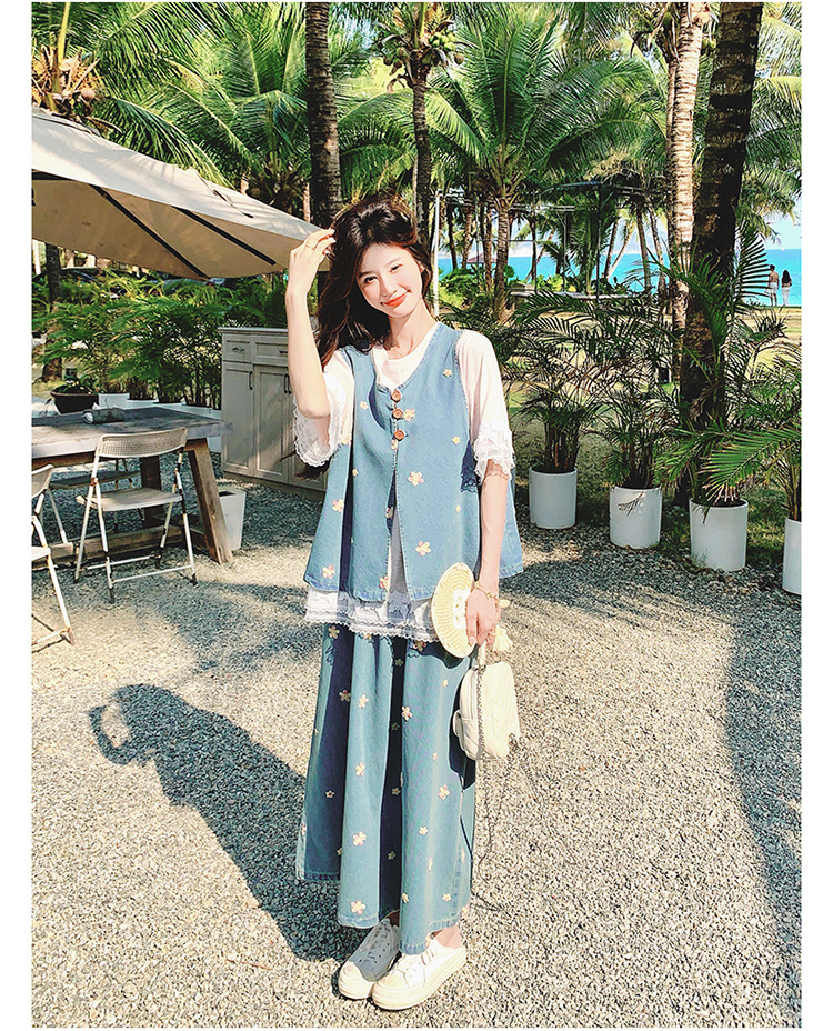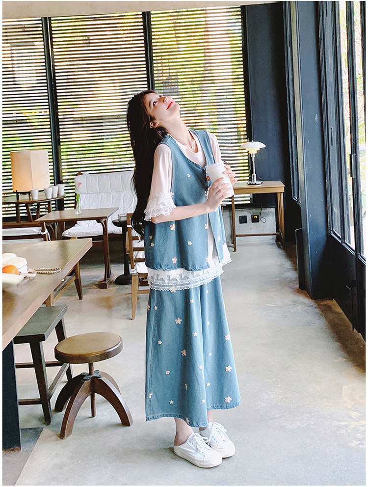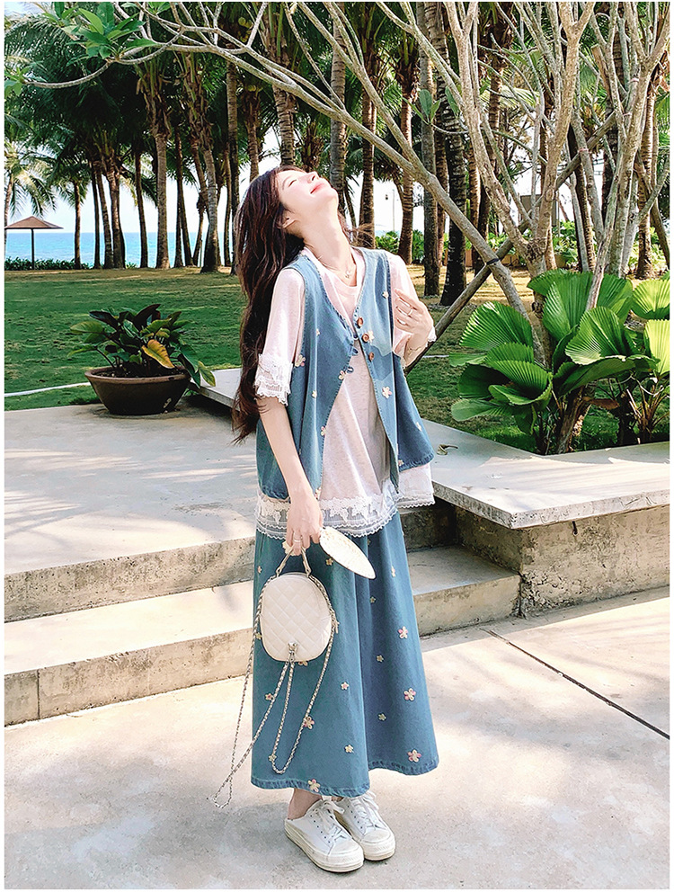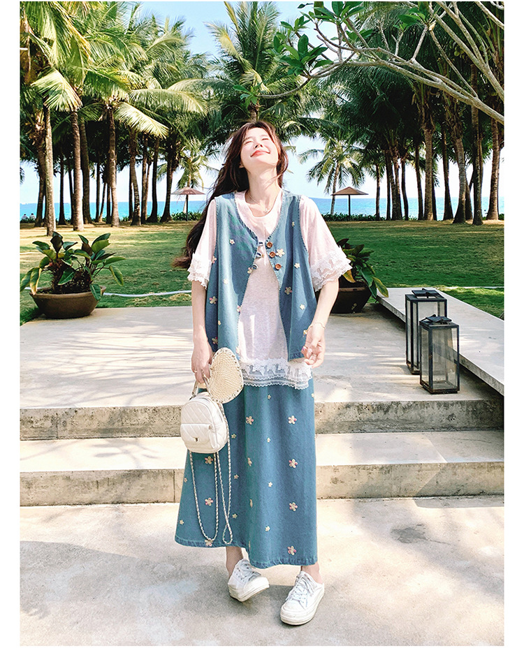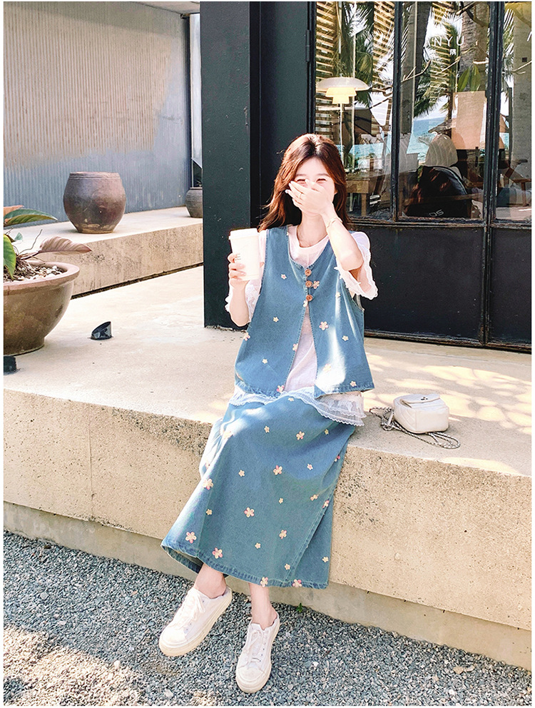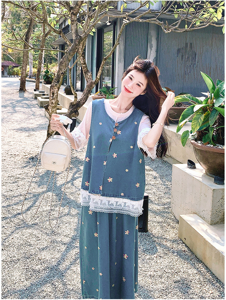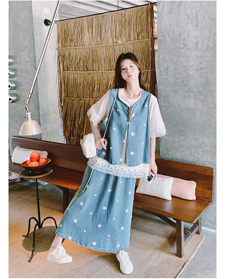 리얼 샷 소금 달콤한 데님 자수 조끼 3 피스 세트 여성 여름 새로운 레이스 티셔츠 스커트 세트 원피스