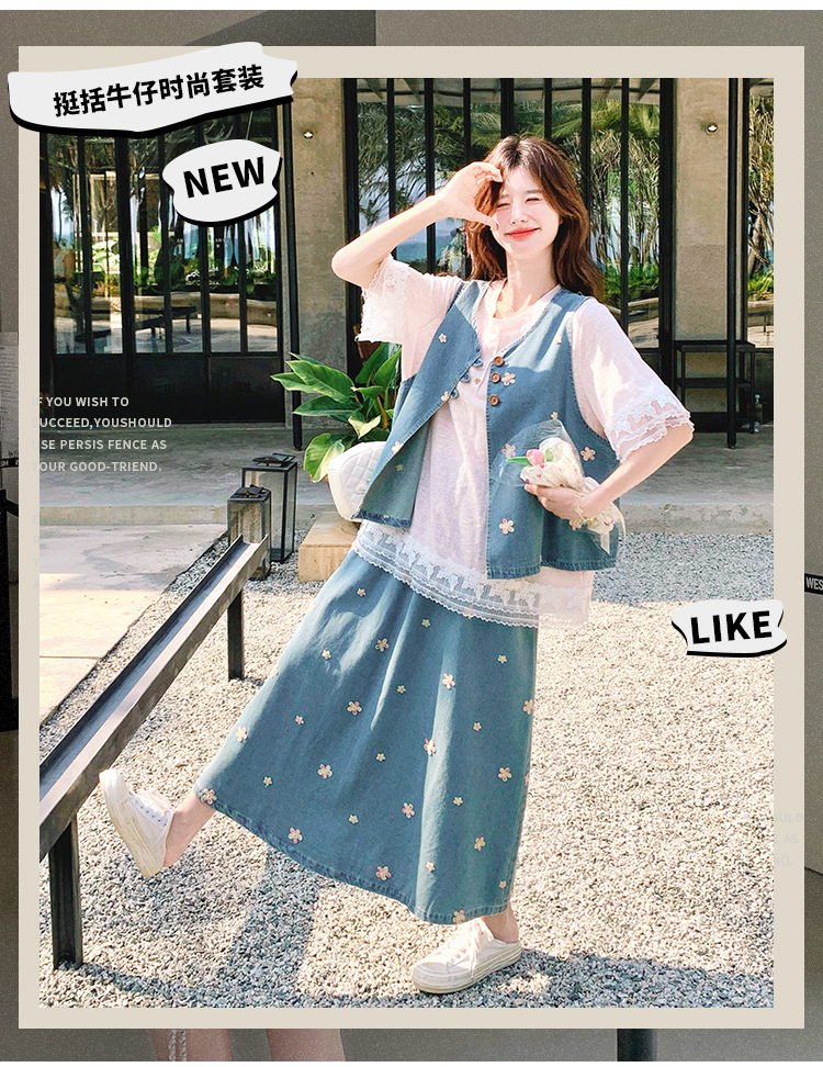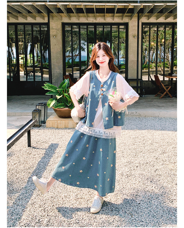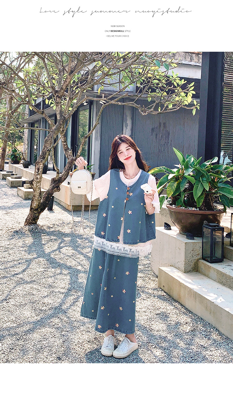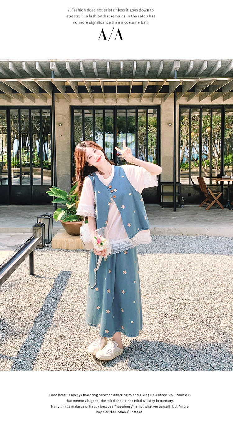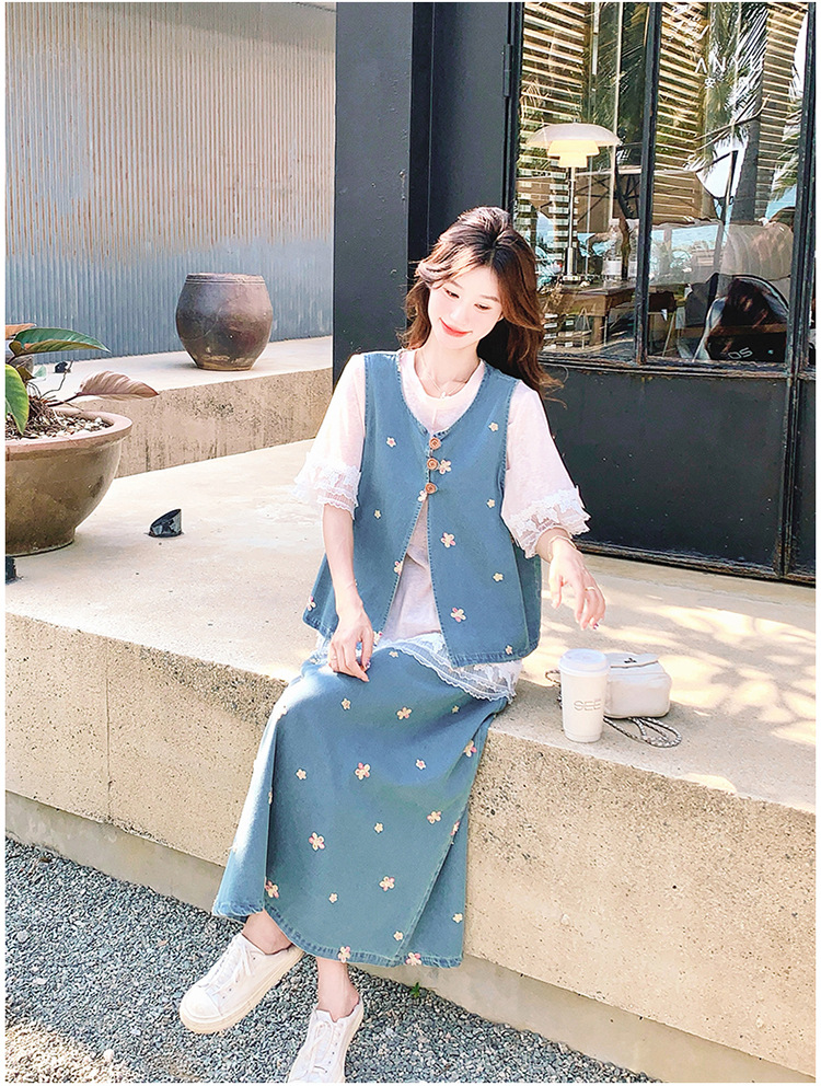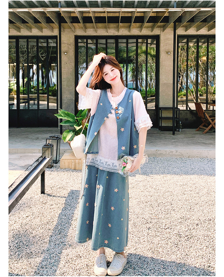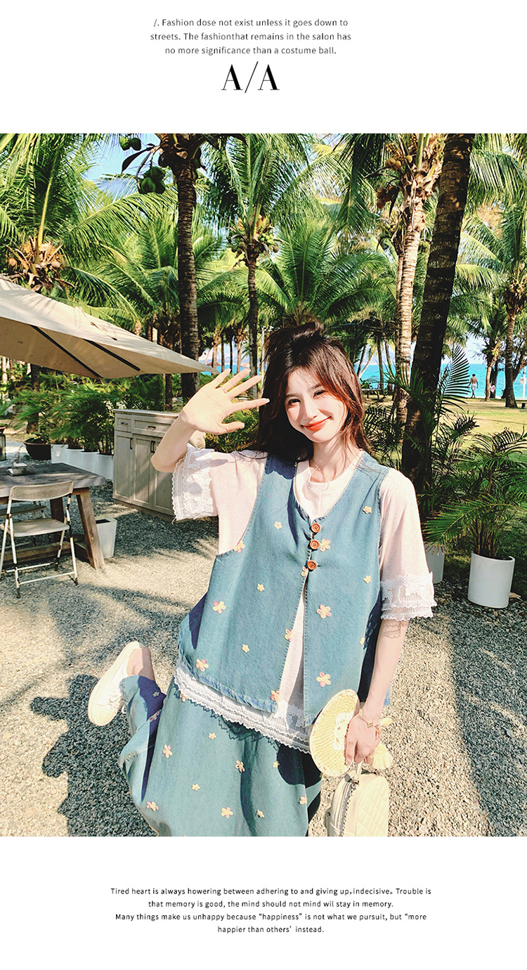 리얼 샷 소금 달콤한 데님 자수 조끼 3 피스 세트 여성 여름 새로운 레이스 티셔츠 스커트 세트 원피스스토어 가기