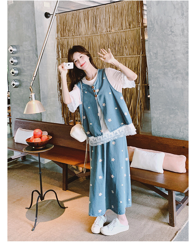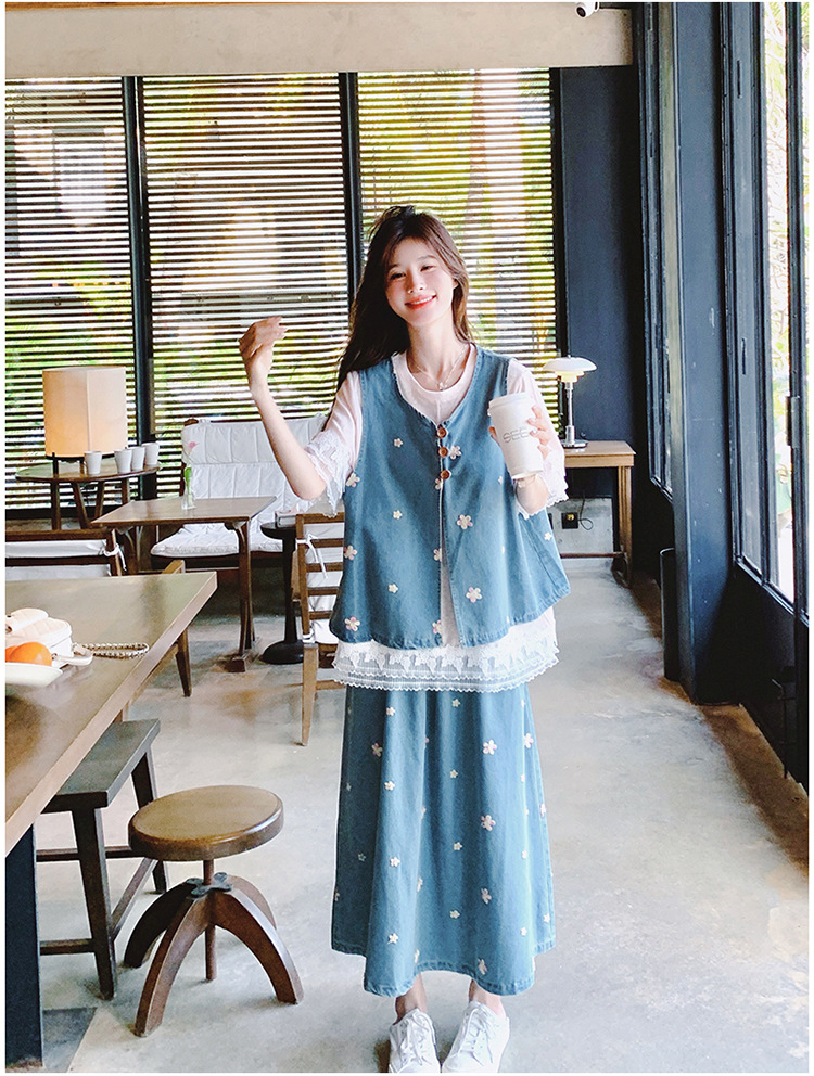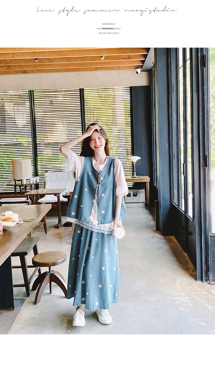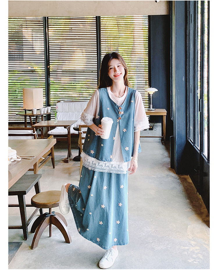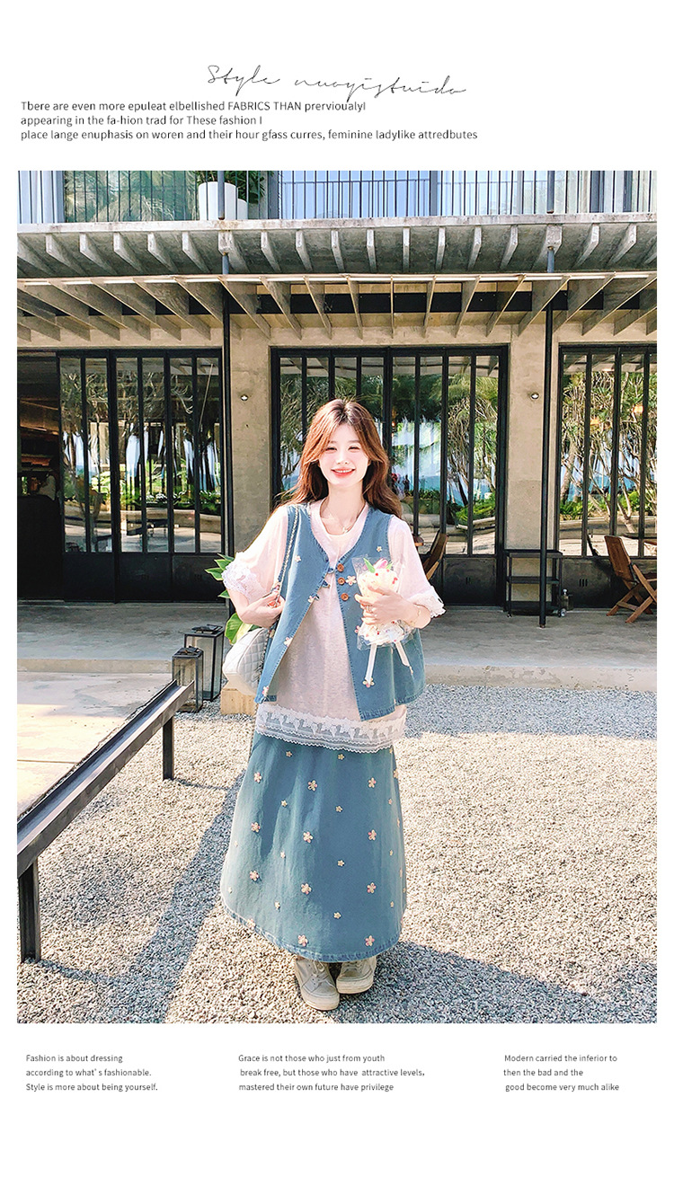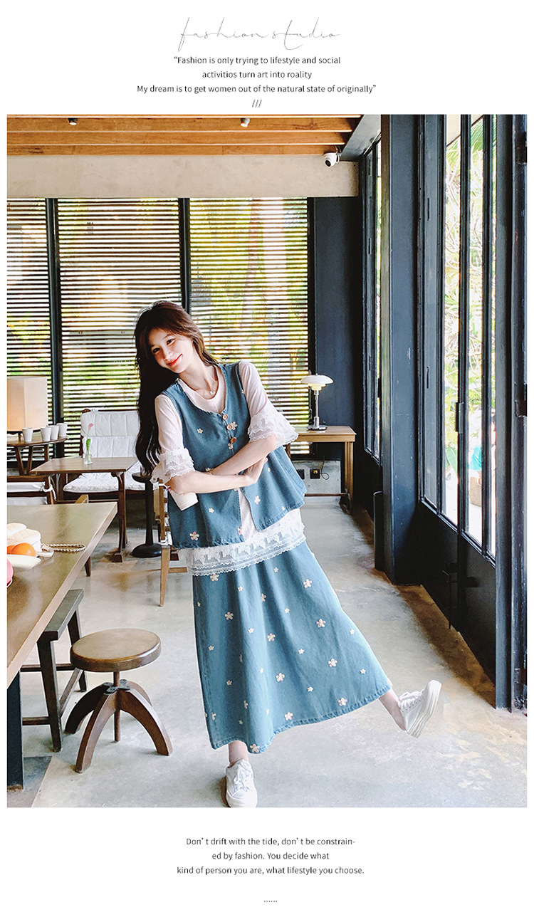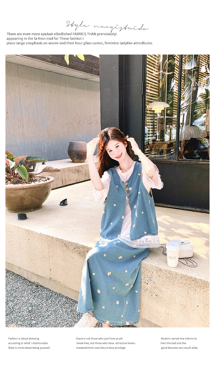 리얼 샷 소금 달콤한 데님 자수 조끼 3 피스 세트 여성 여름 새로운 레이스 티셔츠 스커트 세트 원피스스토어 가기