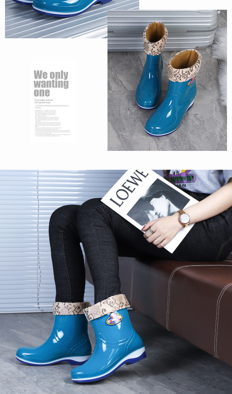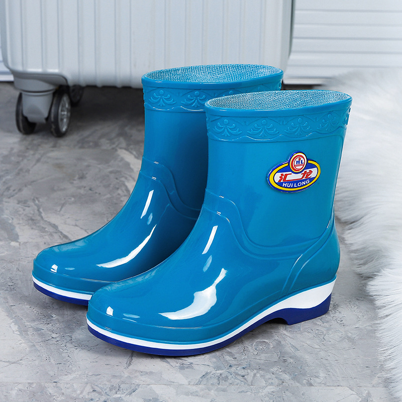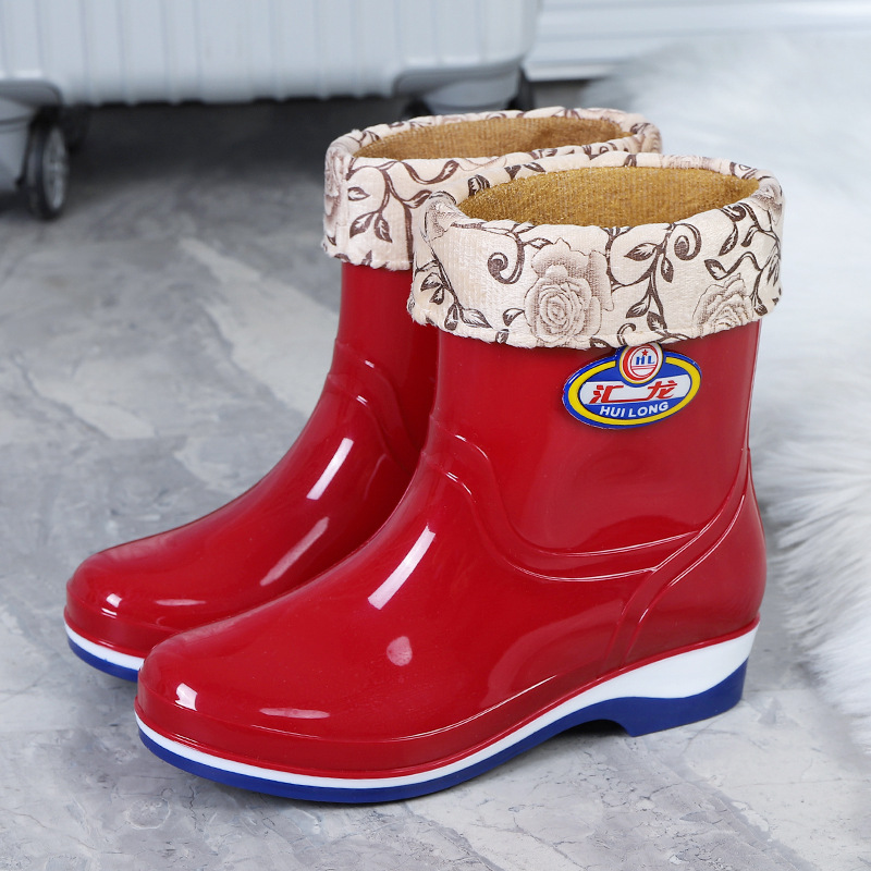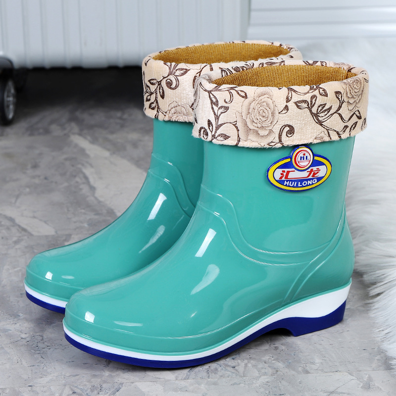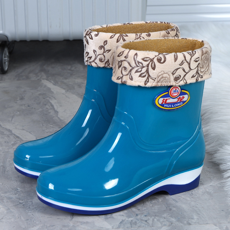 Huilong 공장 직접 판매 여성용 장화 플러스 벨벳 따뜻한 주방 산 및 알칼리 방지 고무 신발 중간 및 낮은 튜브 성인 워터 부츠 내마모성스토어 가기