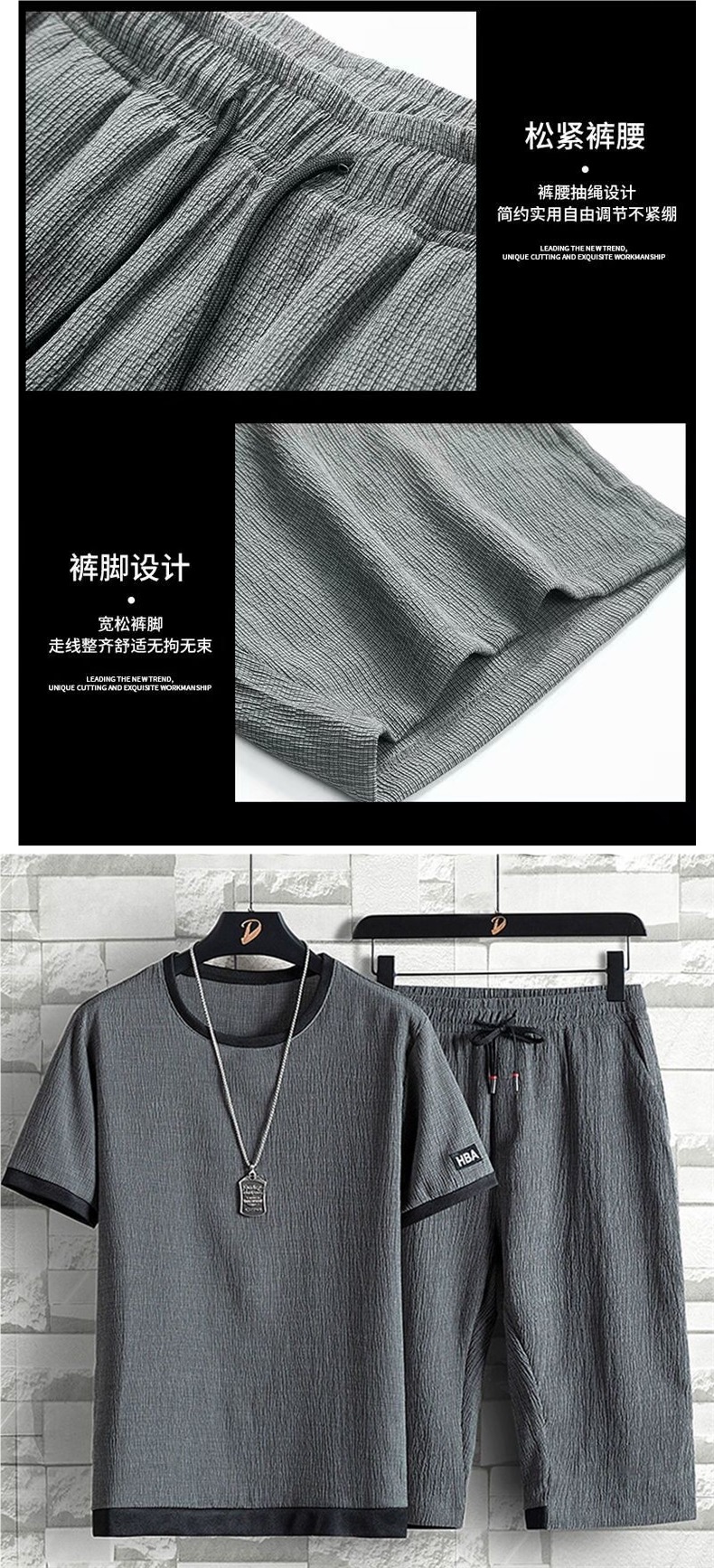 아이스 실크 정장 남성 여름 루즈 대형 캐주얼 스포츠 정장 트렌디 브랜드 린넨 남성 반팔 크롭 팬츠 투피스 세트