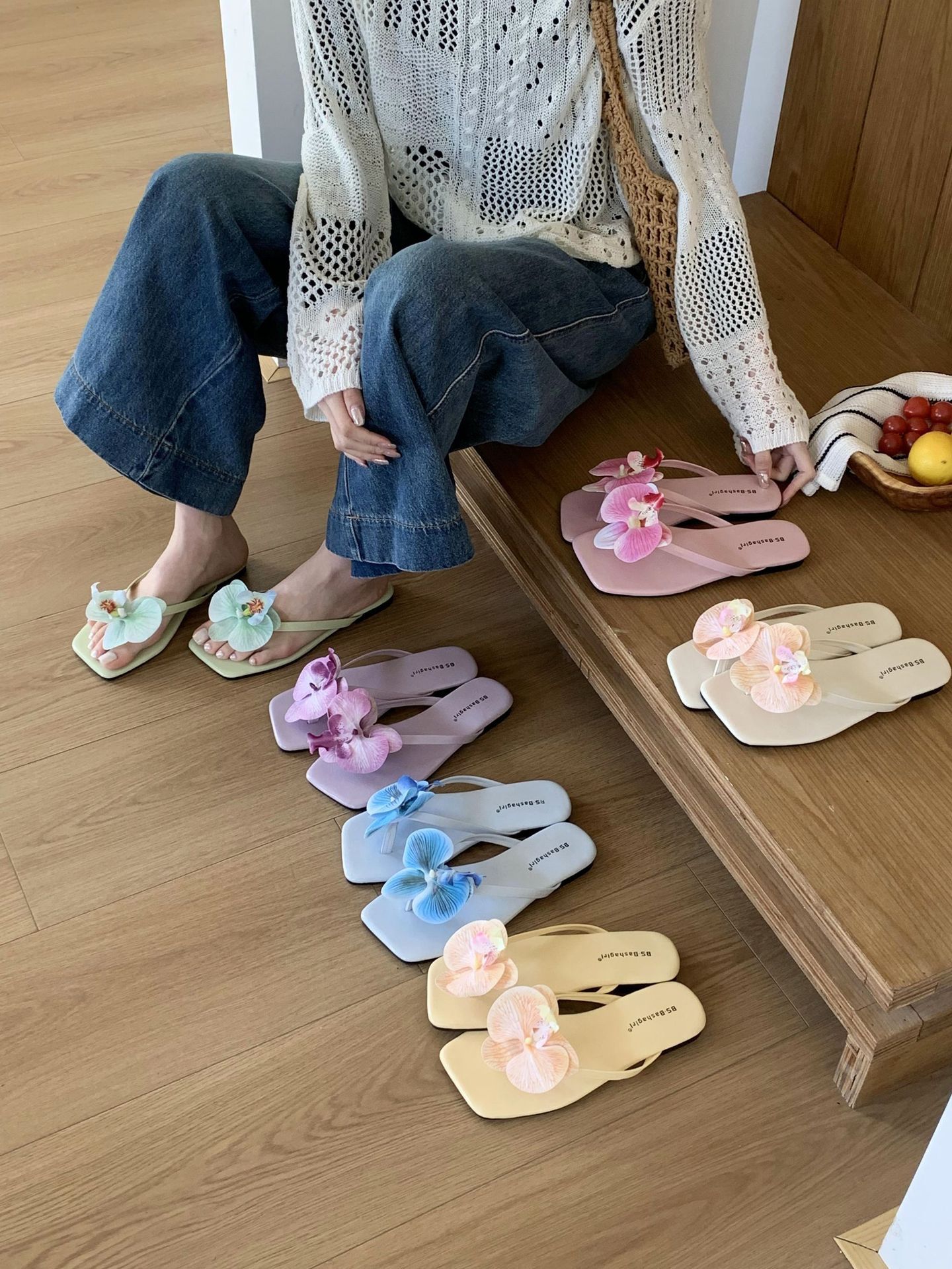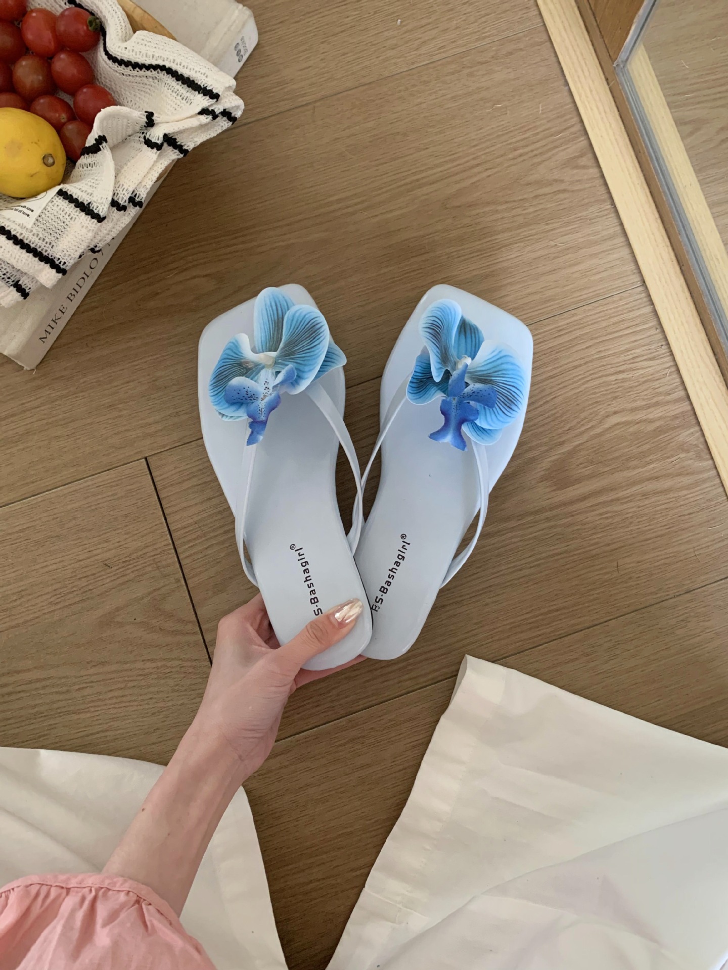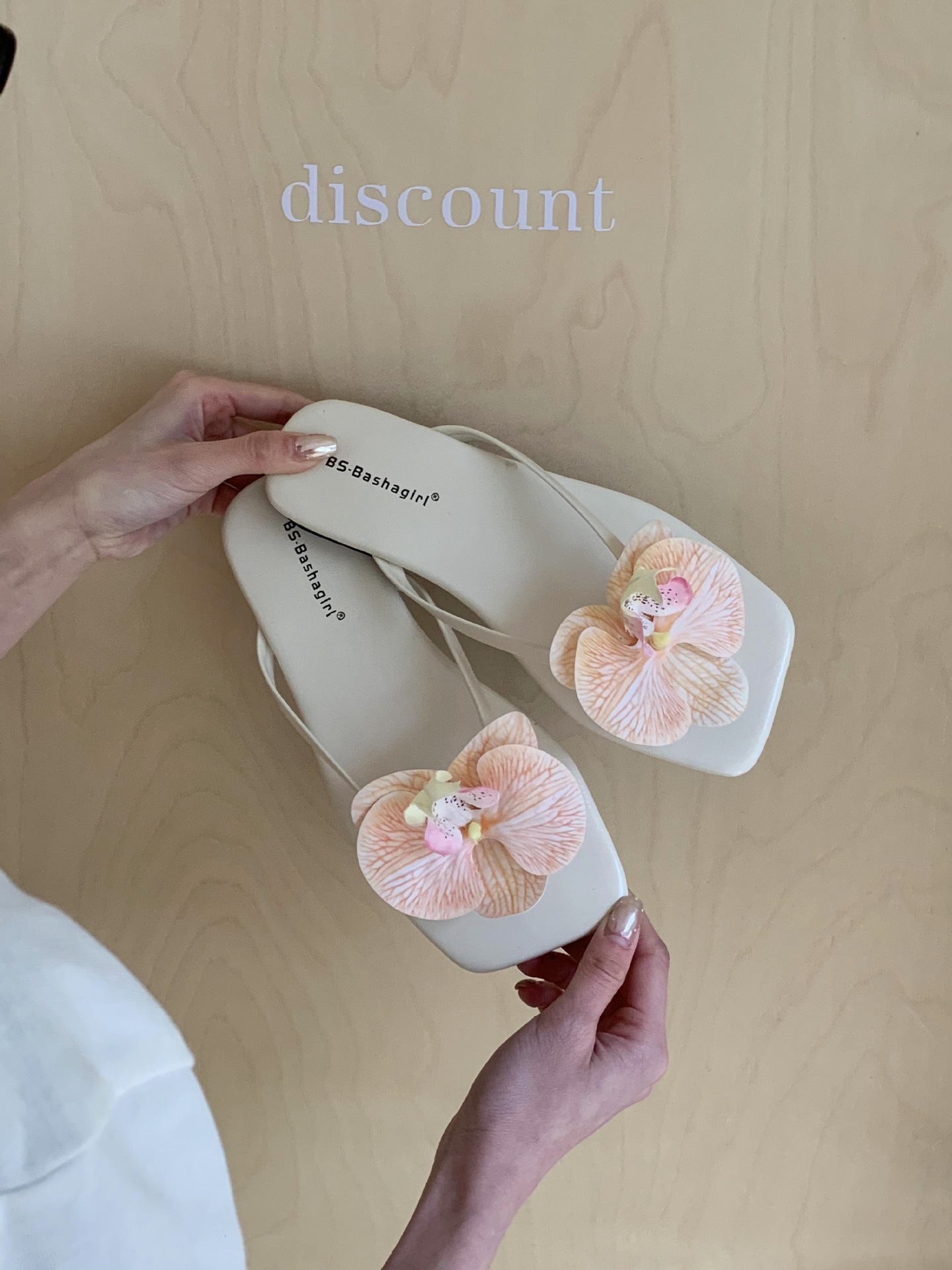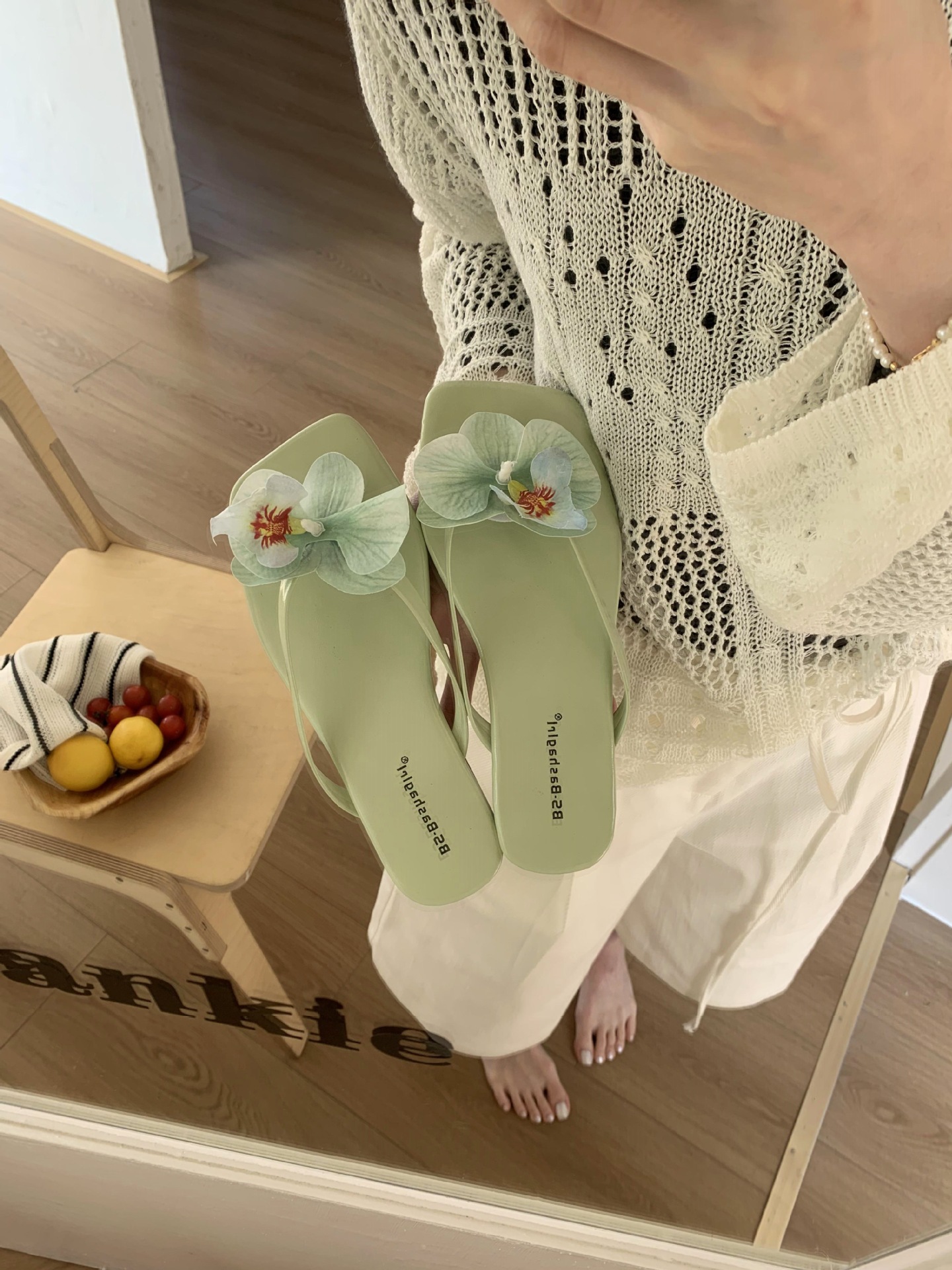 여성을위한 스퀘어 토 대형 슬리퍼 2025 여성을위한 새로운 여름 패션 꽃 헤링본 플립 플롭 캐주얼 비치 샌들
