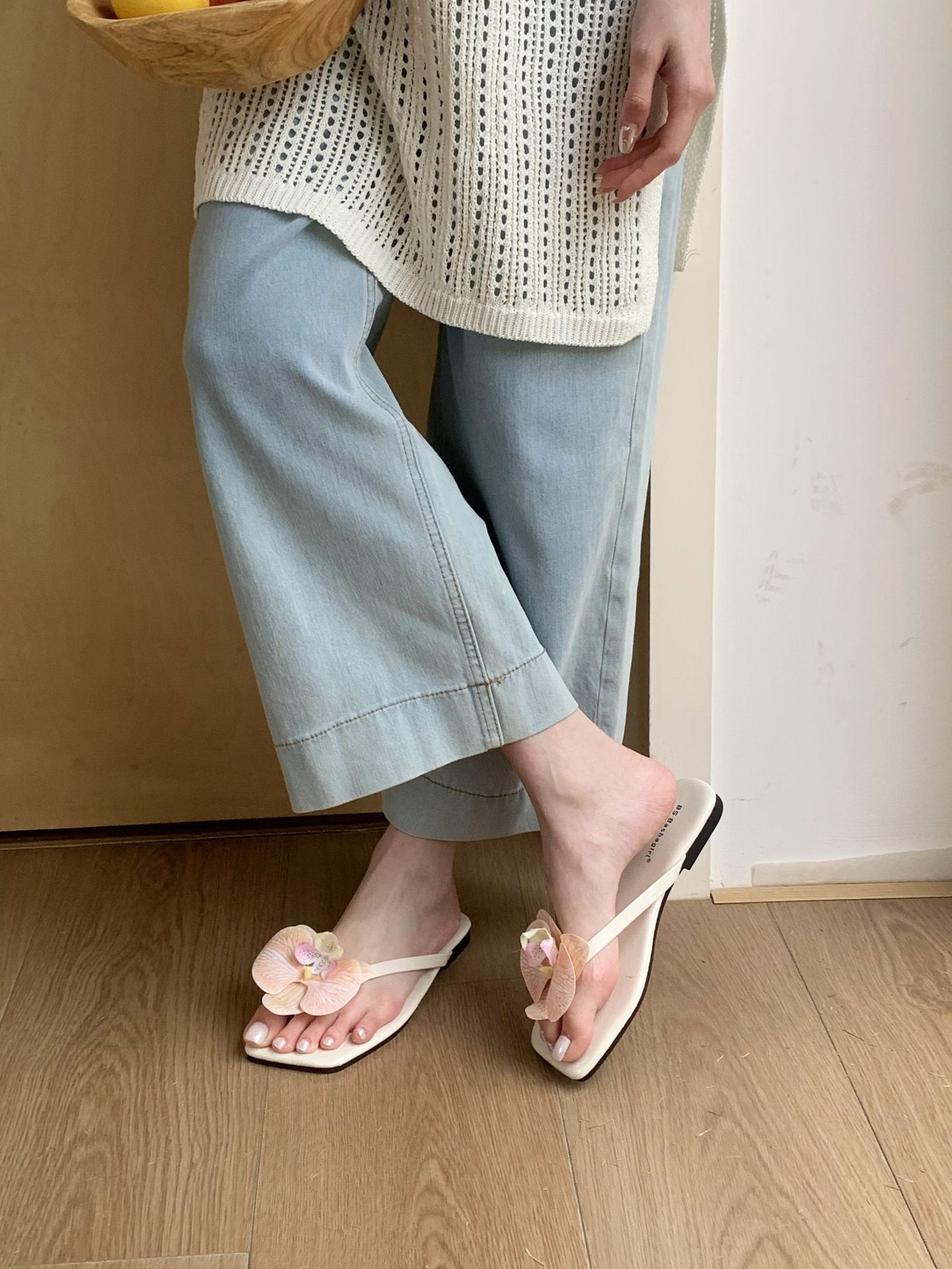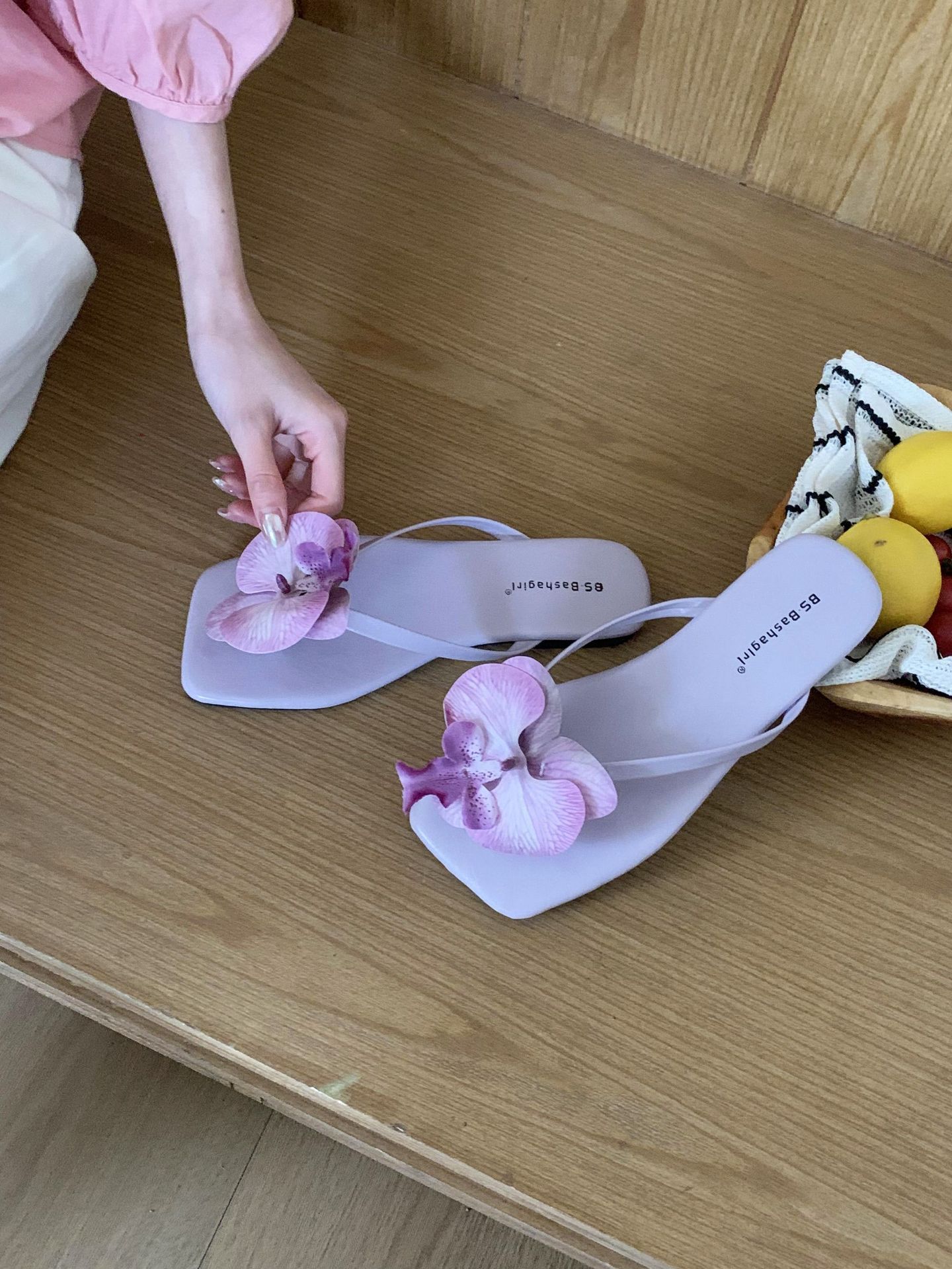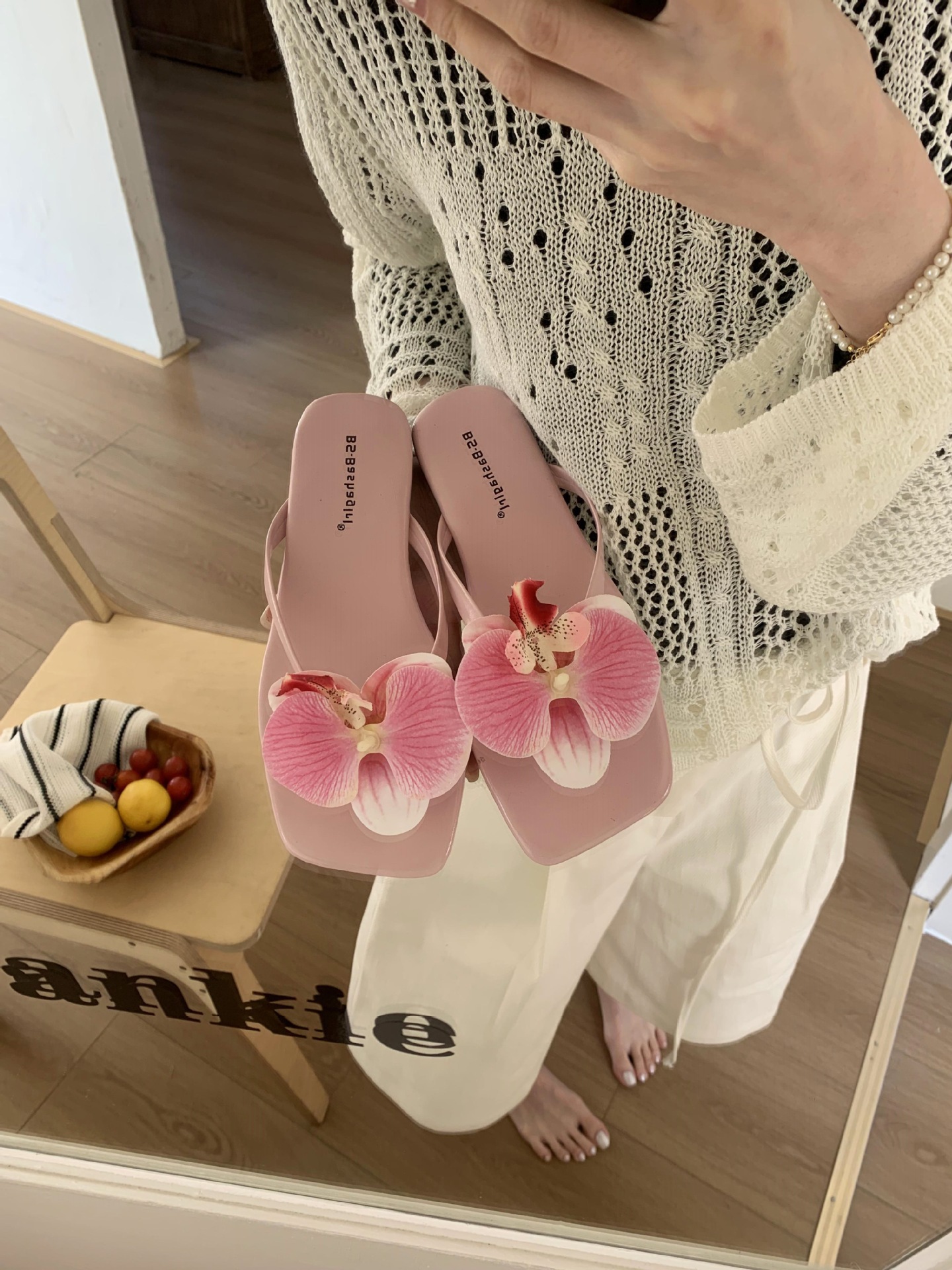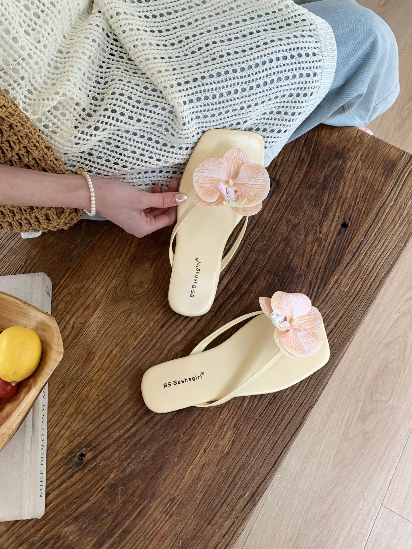 여성을위한 스퀘어 토 대형 슬리퍼 2025 여성을위한 새로운 여름 패션 꽃 헤링본 플립 플롭 캐주얼 비치 샌들