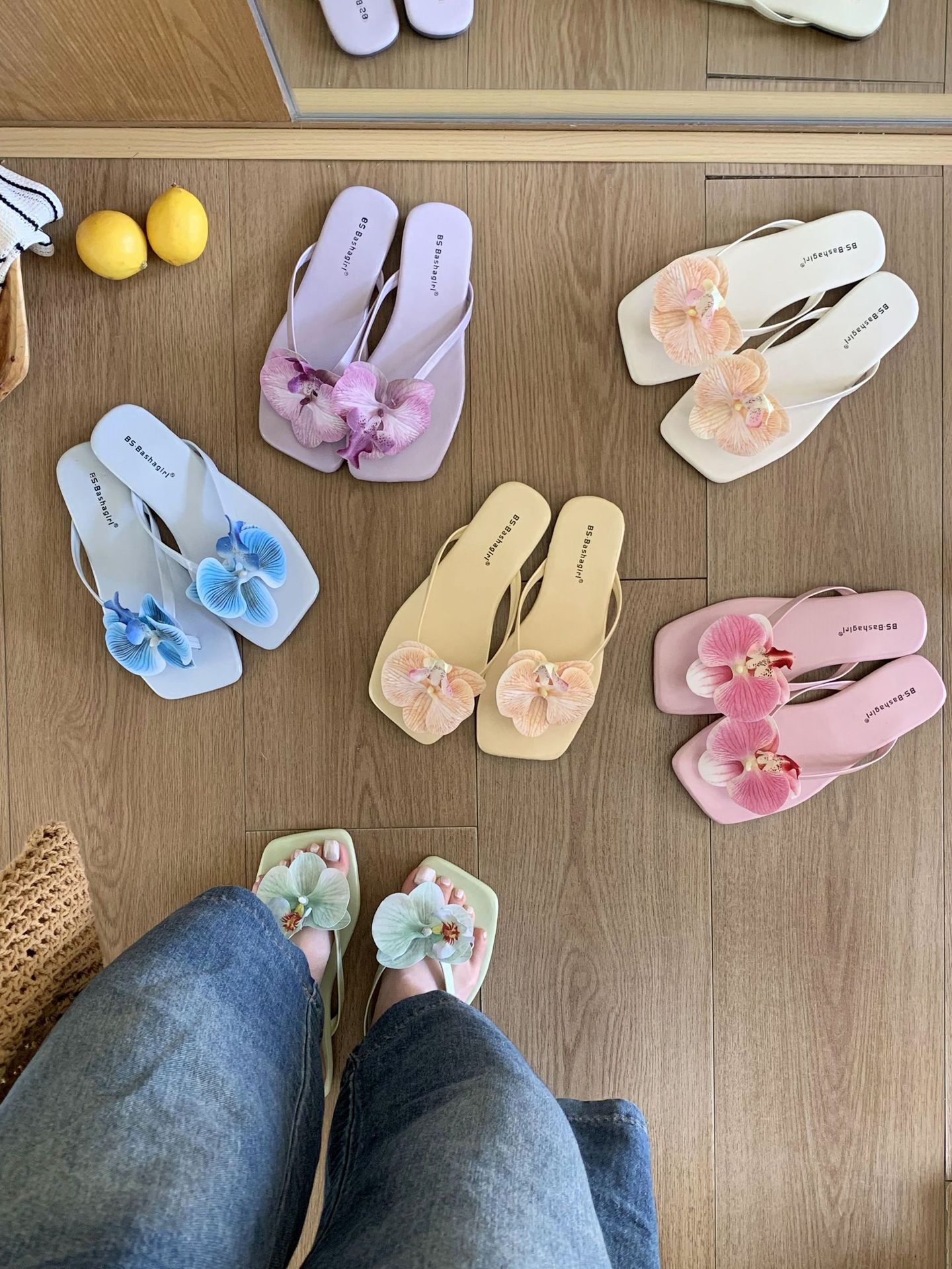 여성을위한 스퀘어 토 대형 슬리퍼 2025 여성을위한 새로운 여름 패션 꽃 헤링본 플립 플롭 캐주얼 비치 샌들스토어 가기