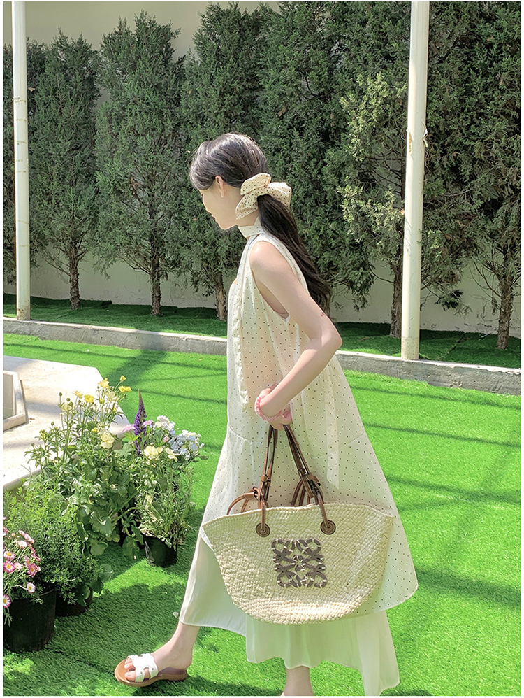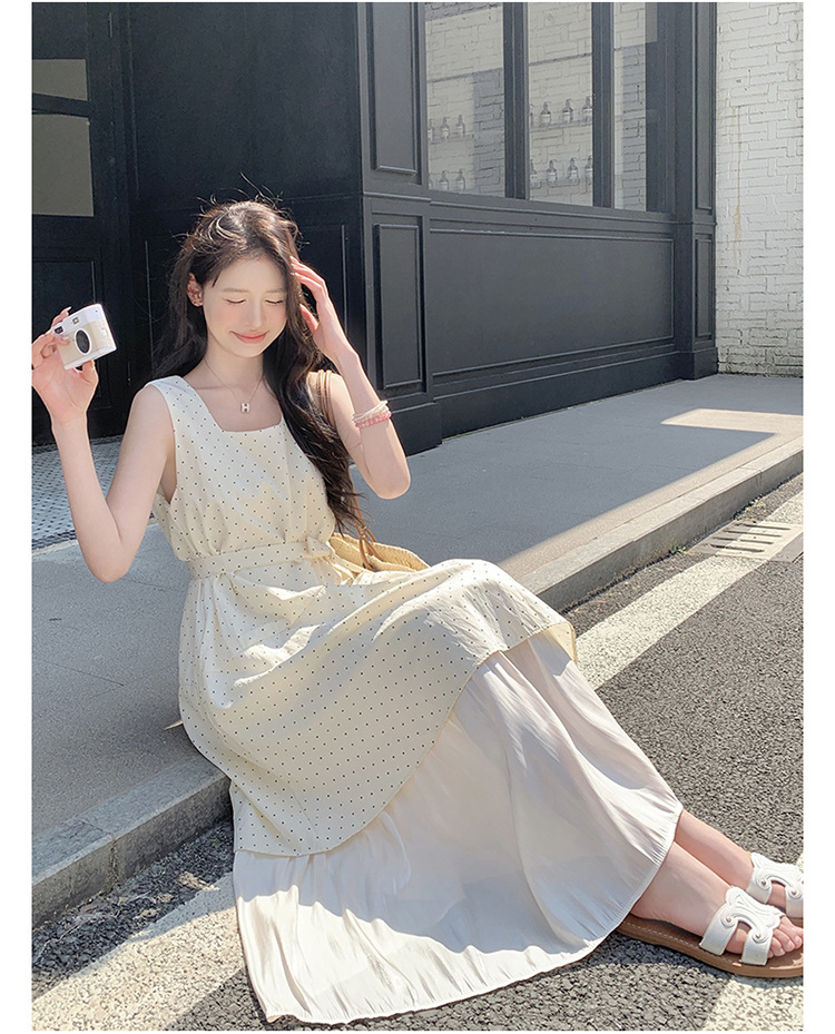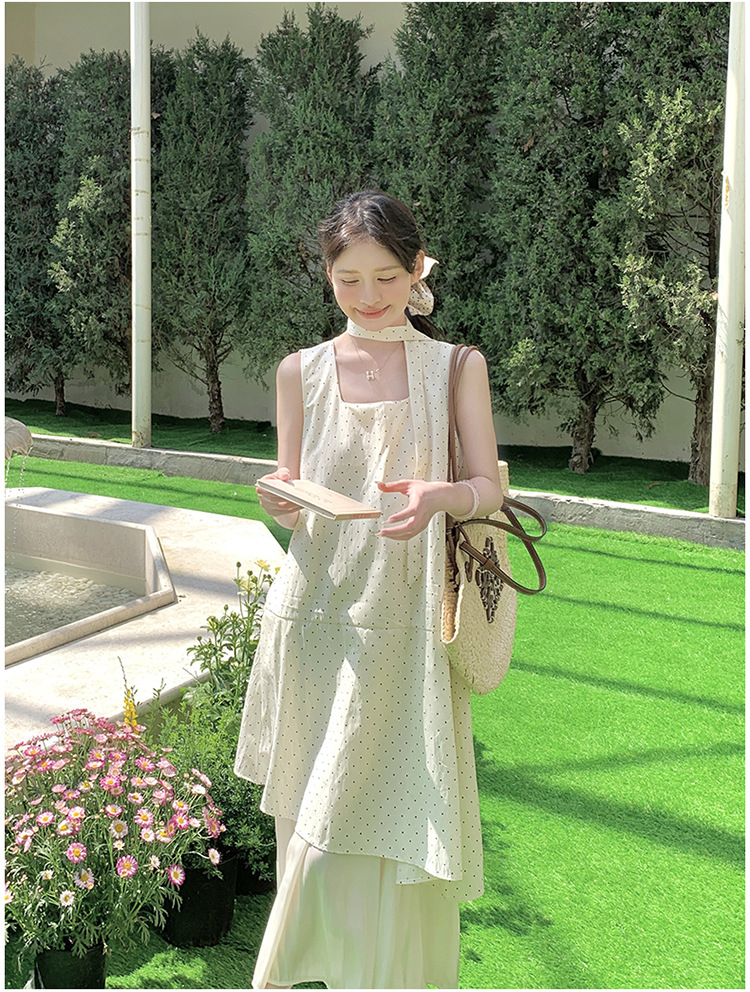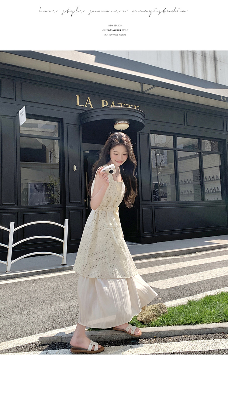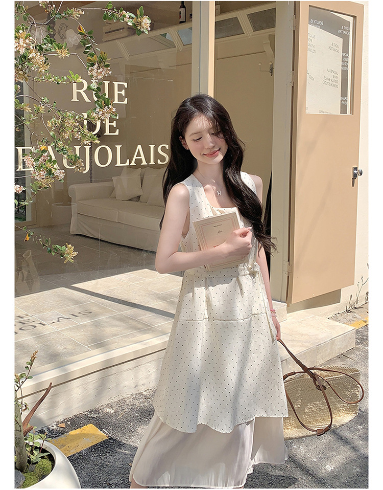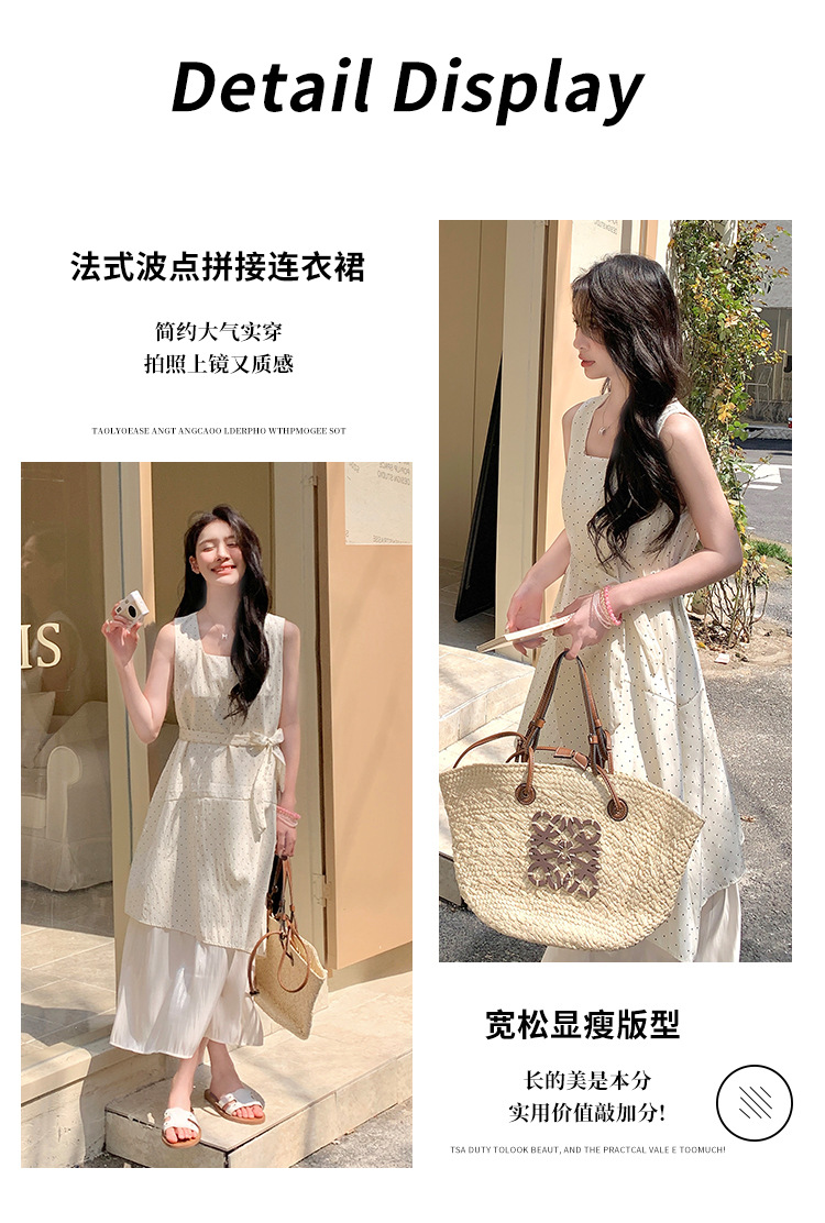 리얼 샷 가짜 2 피스 웨이브 도트 스티칭 원피스 여성 2025 년 여름 새로운 프랑스 디자인 타이트 허리 슬리밍 조끼 스커트