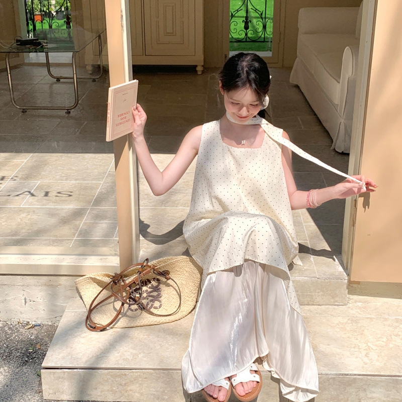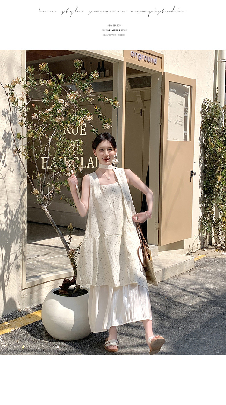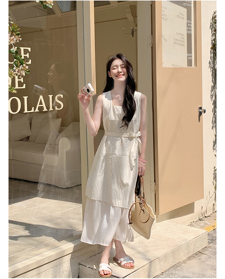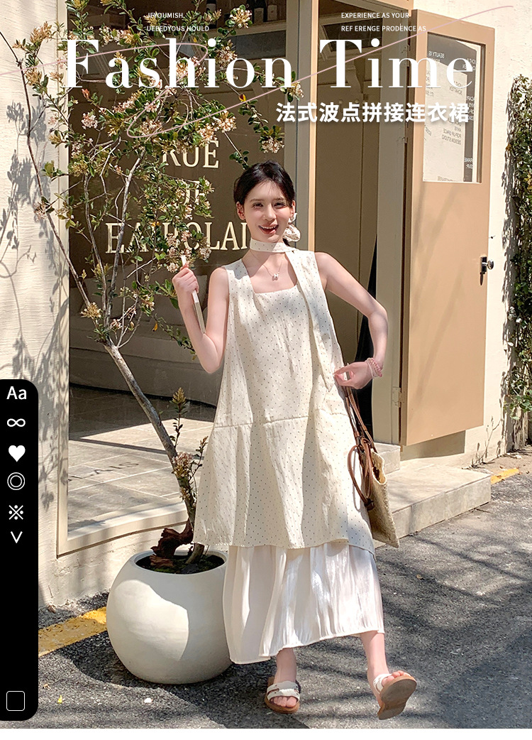 리얼 샷 가짜 2 피스 웨이브 도트 스티칭 원피스 여성 2025 년 여름 새로운 프랑스 디자인 타이트 허리 슬리밍 조끼 스커트스토어 가기