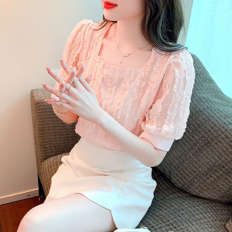 프랑스 스타일 스위트 스퀘어 칼라 레이스 탑 여성의 2024 여름 새로운 스타일의 세련된 디자인 틈새 퍼프 슬리브 셔츠스토어 가기