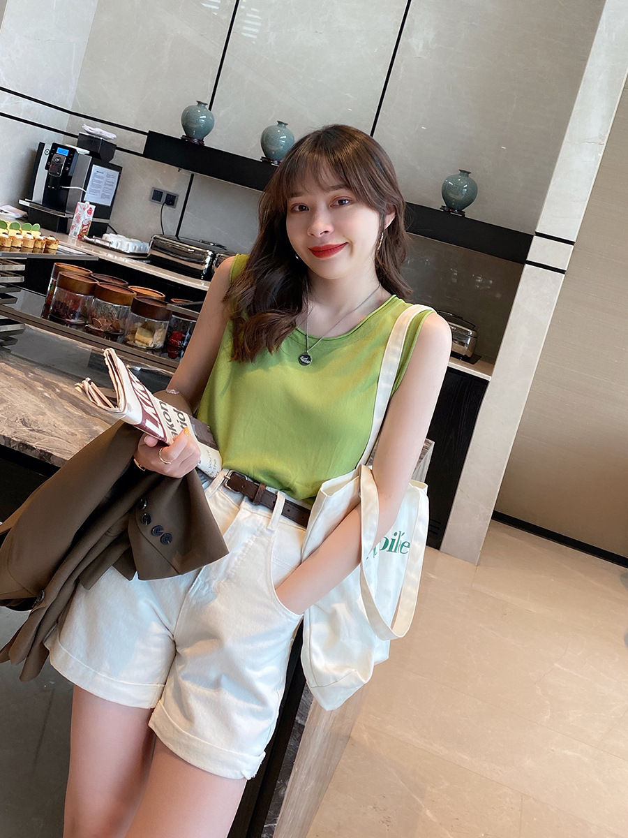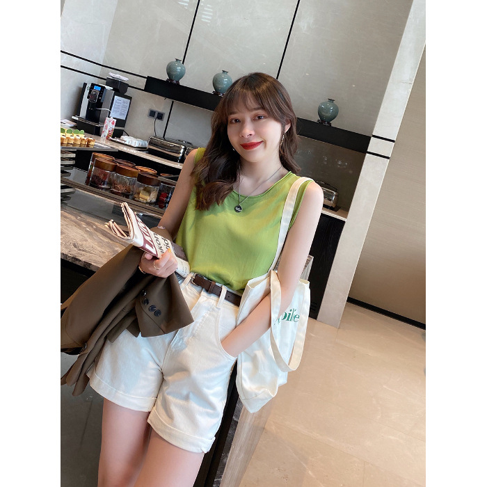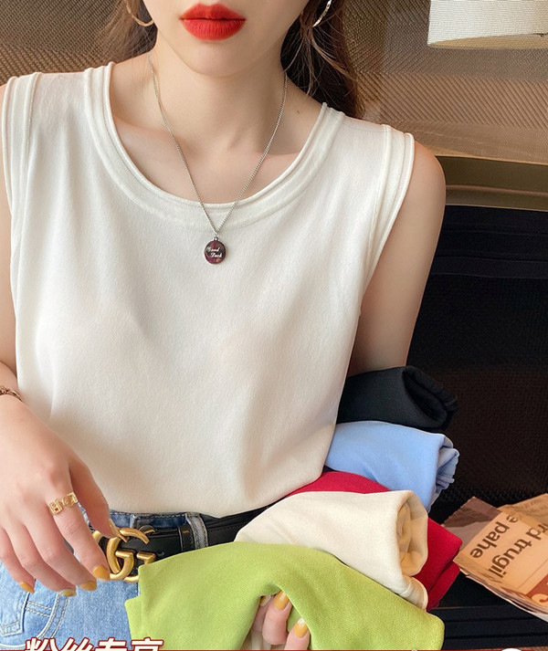 얇은 흰색 아이스 실크 니트베이스 슬링 느슨한 민소매 티셔츠 탑 착용 조끼 여자 세트스토어 가기