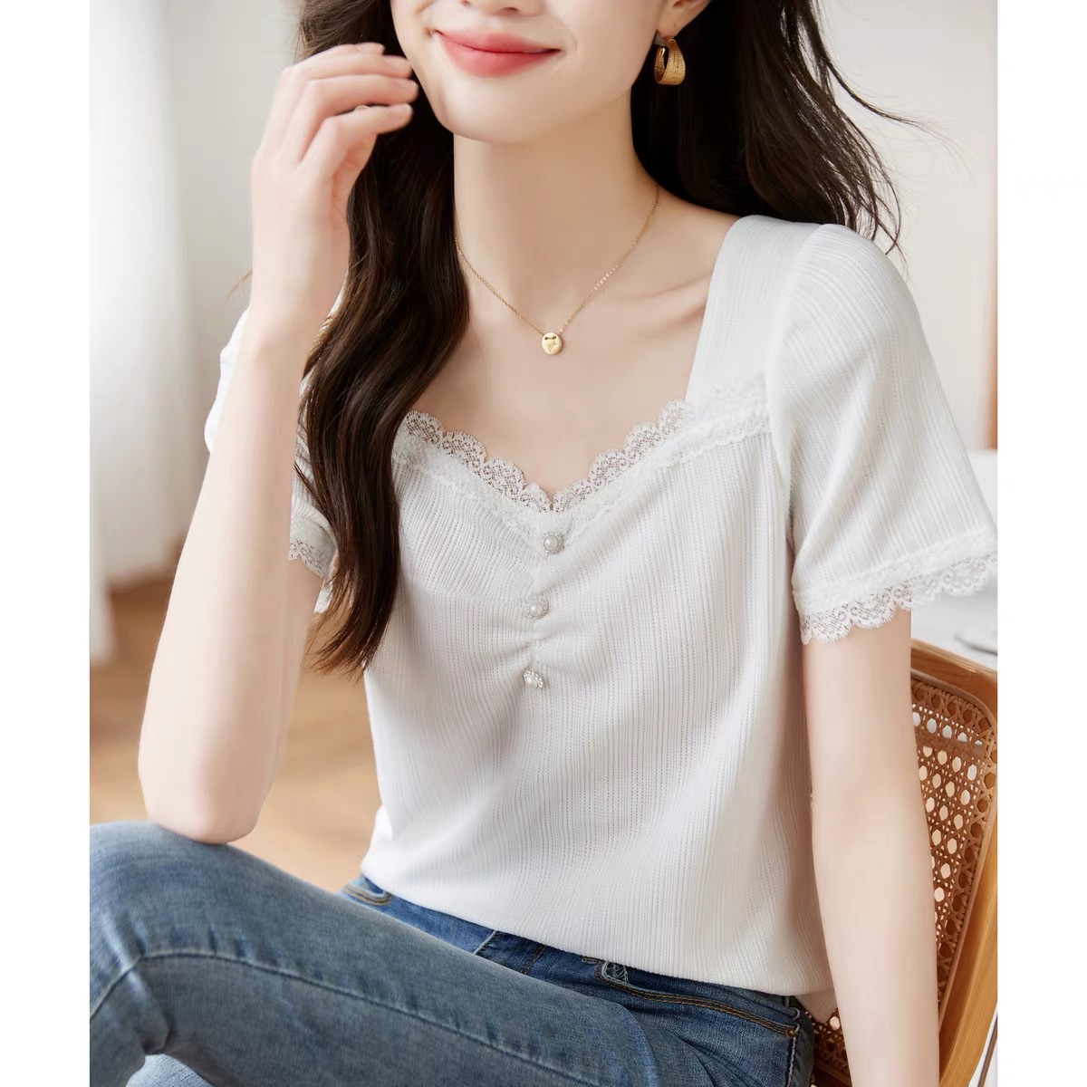 프랑스 2024 여름 새 화이트 니트 반팔 티셔츠 여성용 레이스 칼라 플리츠 슬림 핏 스트라이프 탑스토어 가기