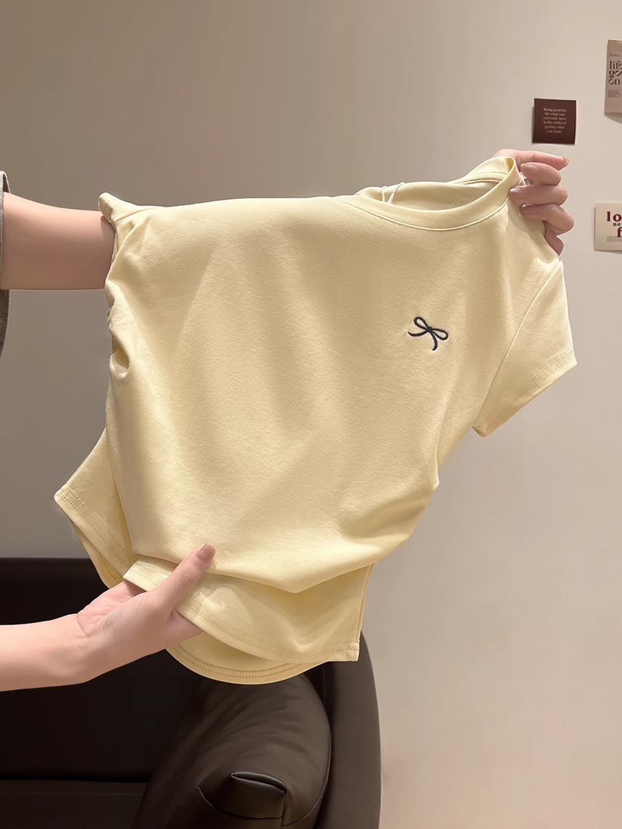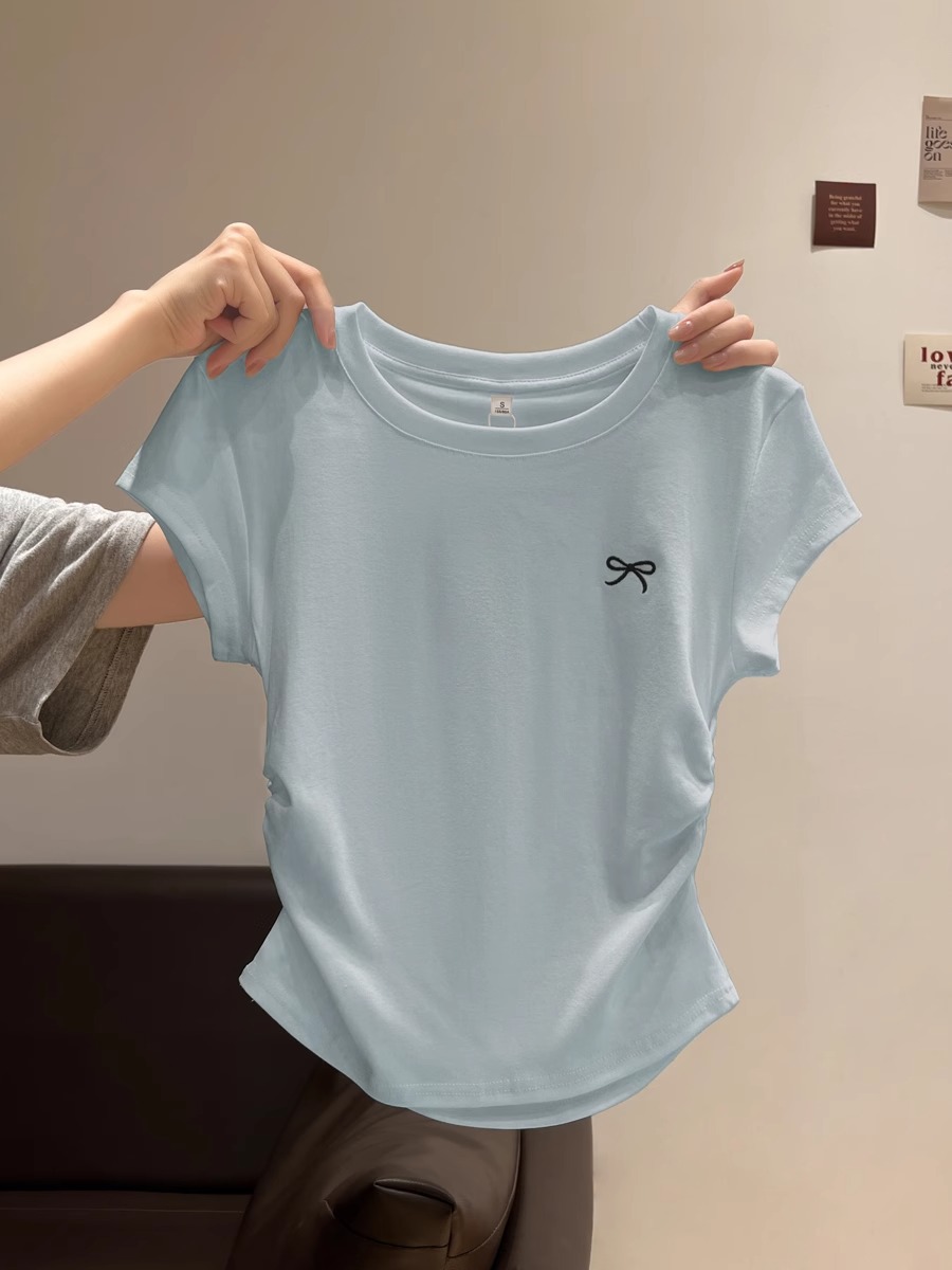 어깨 플러스 사이즈 반팔 슬림 핏 티셔츠 여성용 여름 새로운 슬리밍 어본 쇼트 디자인 센스 틈새 내부 탑