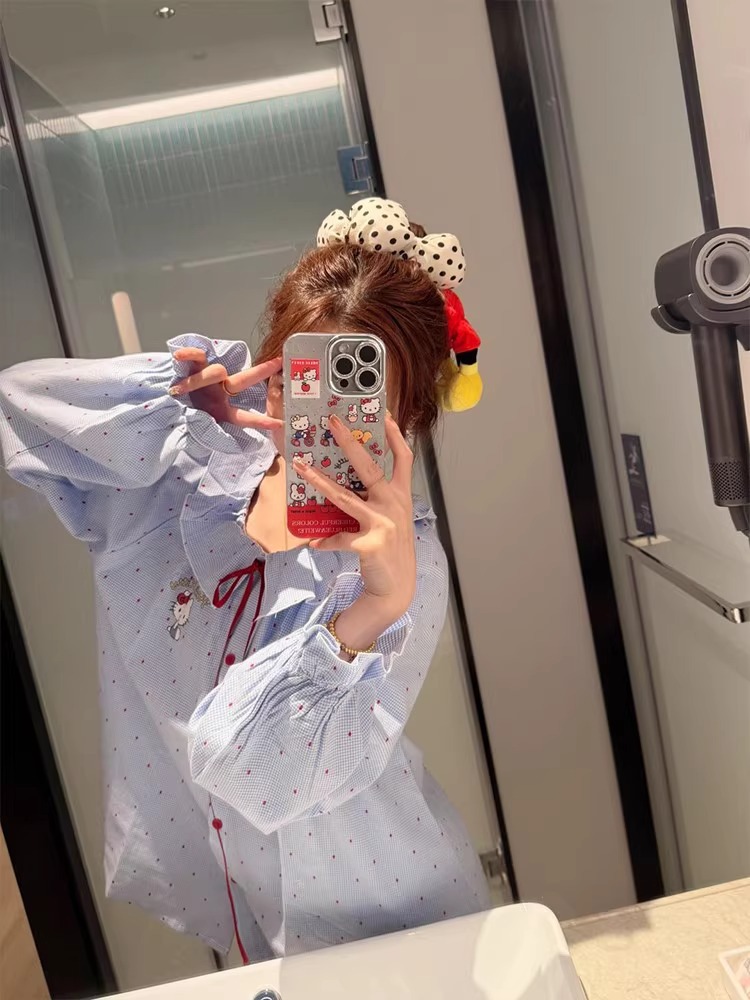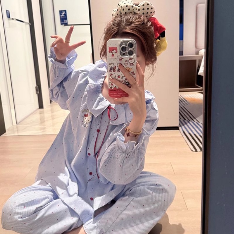 봄과 가을 긴 소매 바지 여성 달콤한 귀여운 만화 KT 고양이 학생 기숙사 홈 옷은 외부 세트 입을 수 있습니다스토어 가기