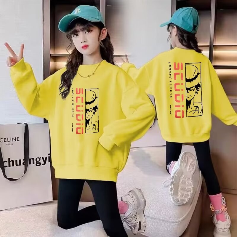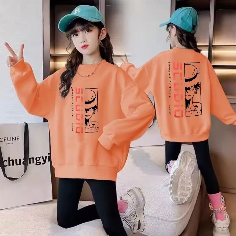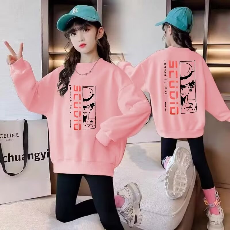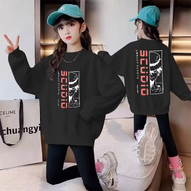 소녀 스웨트 셔츠 2024 가을 새로운 어린이 만화 탑 아기 캐주얼 긴 소매 미드 빅 어린이 올 매치 티셔츠 트렌디스토어 가기