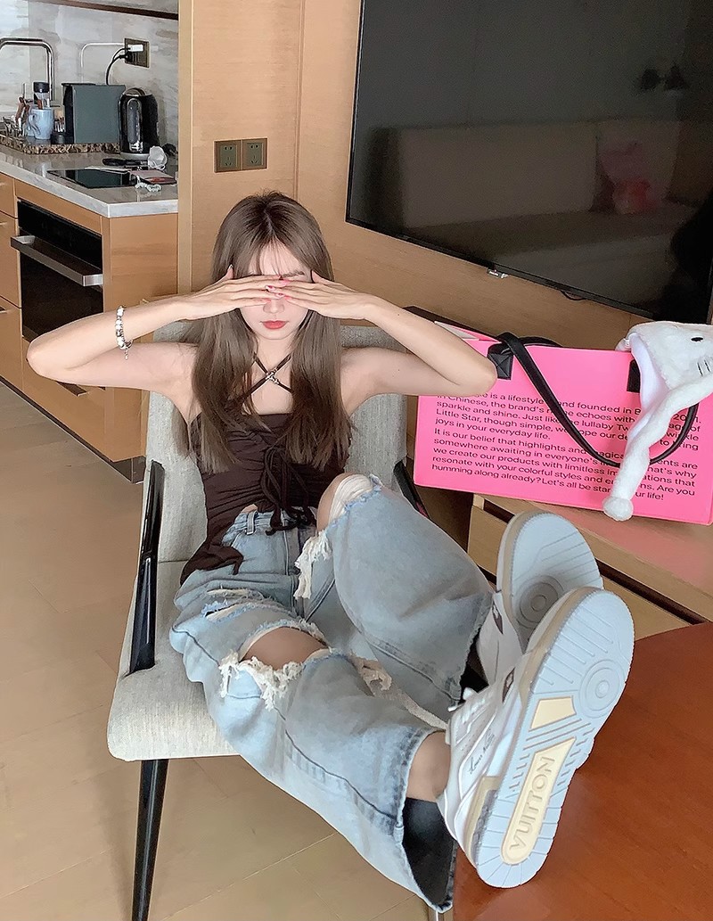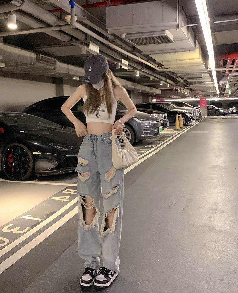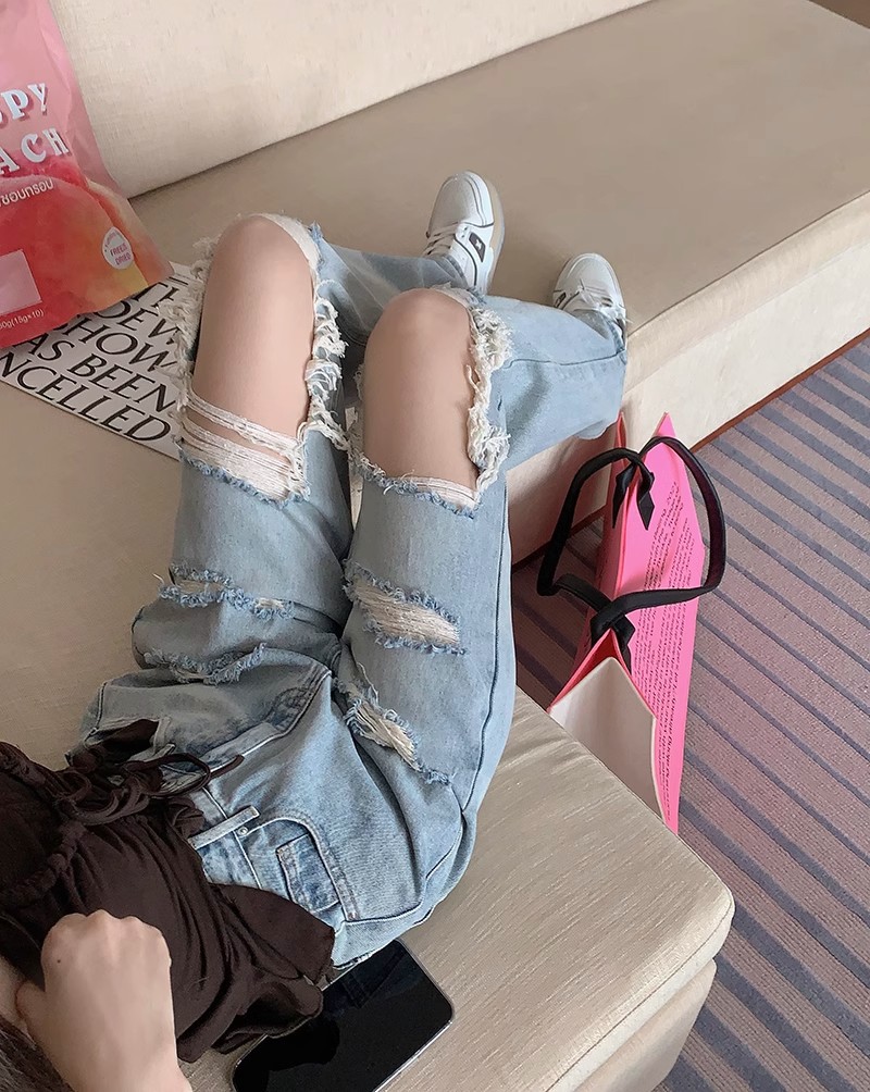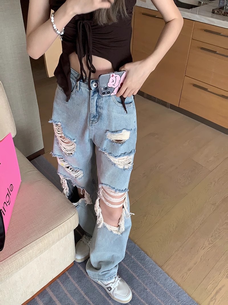 아메리칸 스타일 하이 스트리트 빅 리핑 청바지 여성 2024 년 여름 새로운 와이드 레그 스트레이트 하이 허리 느슨한 거지 바지스토어 가기