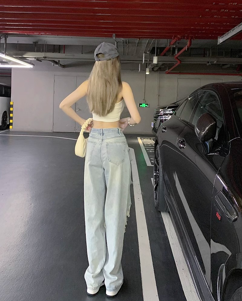 아메리칸 스타일 하이 스트리트 빅 리핑 청바지 여성 2024 년 여름 새로운 와이드 레그 스트레이트 하이 허리 느슨한 거지 바지