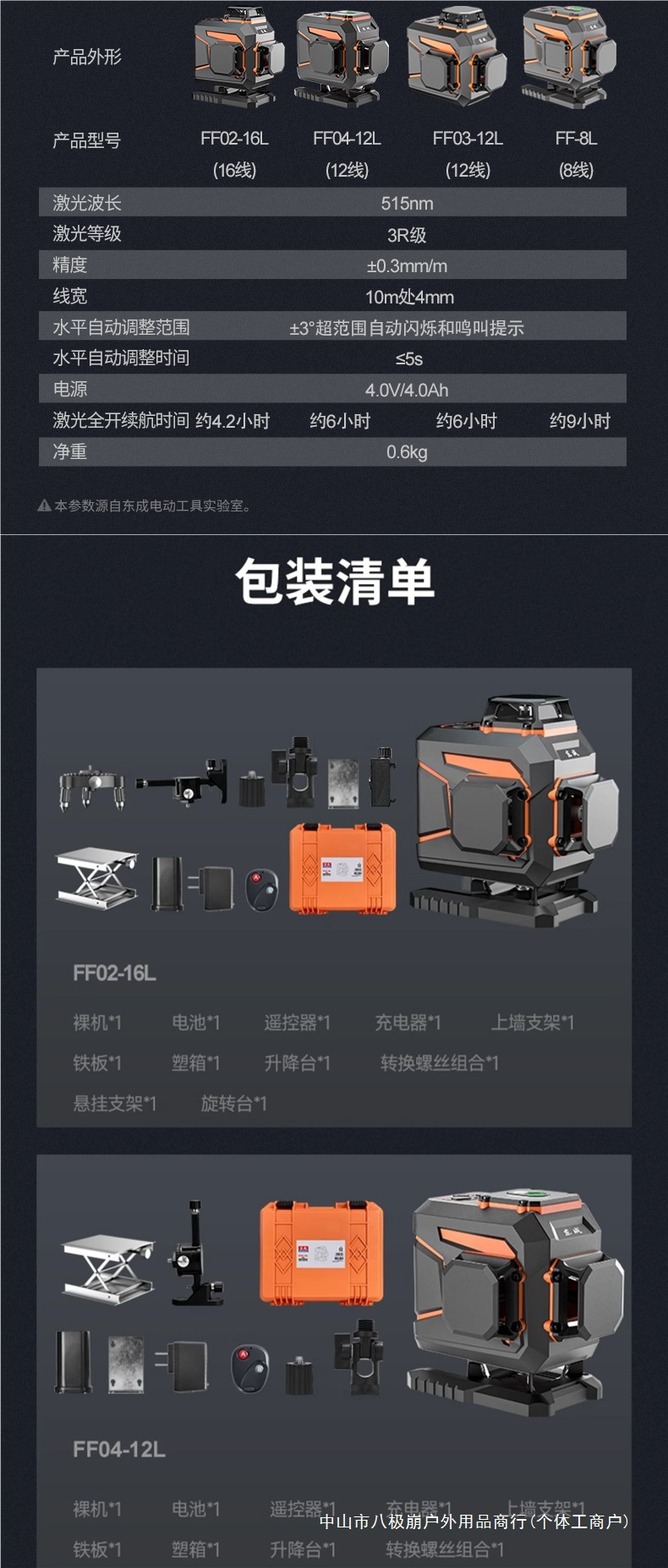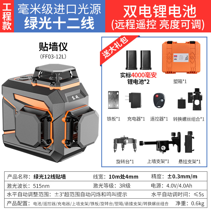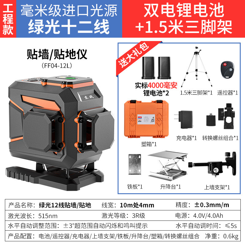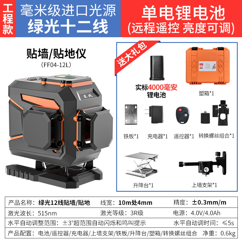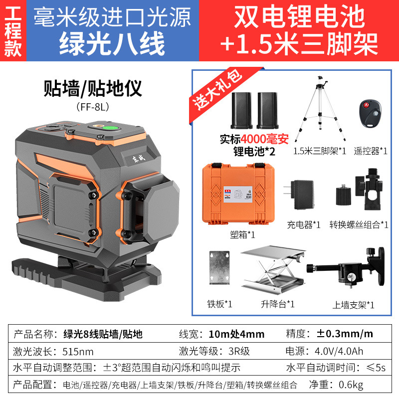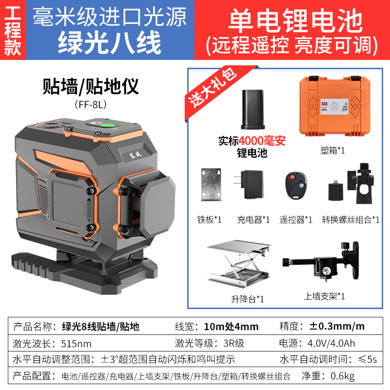 • [리모컨] 녹색등 8선 바닥/벽 장착형 [이중 전동 삼각대] + 벽걸이 [밝기 조절 가능] FF-8L