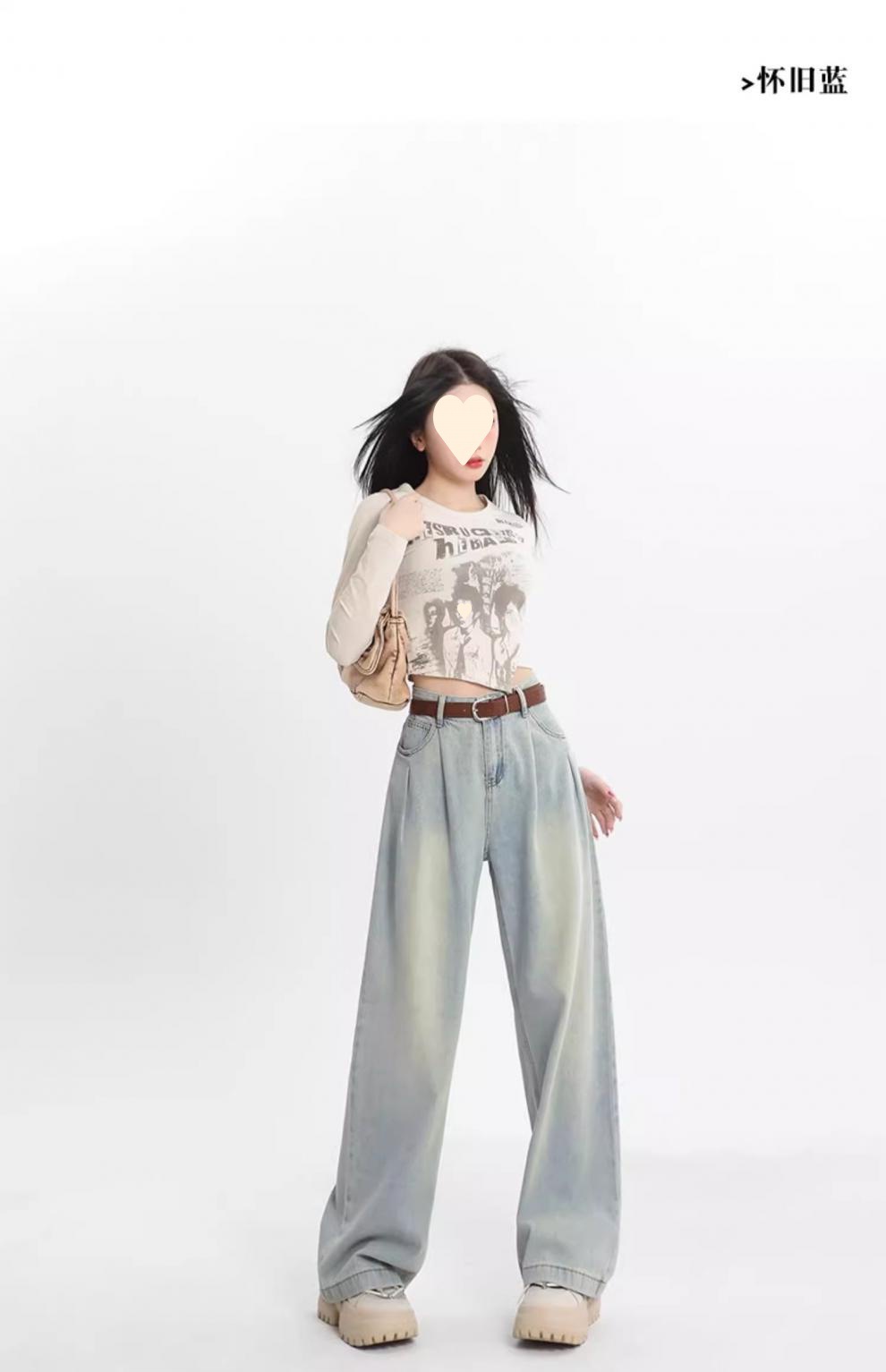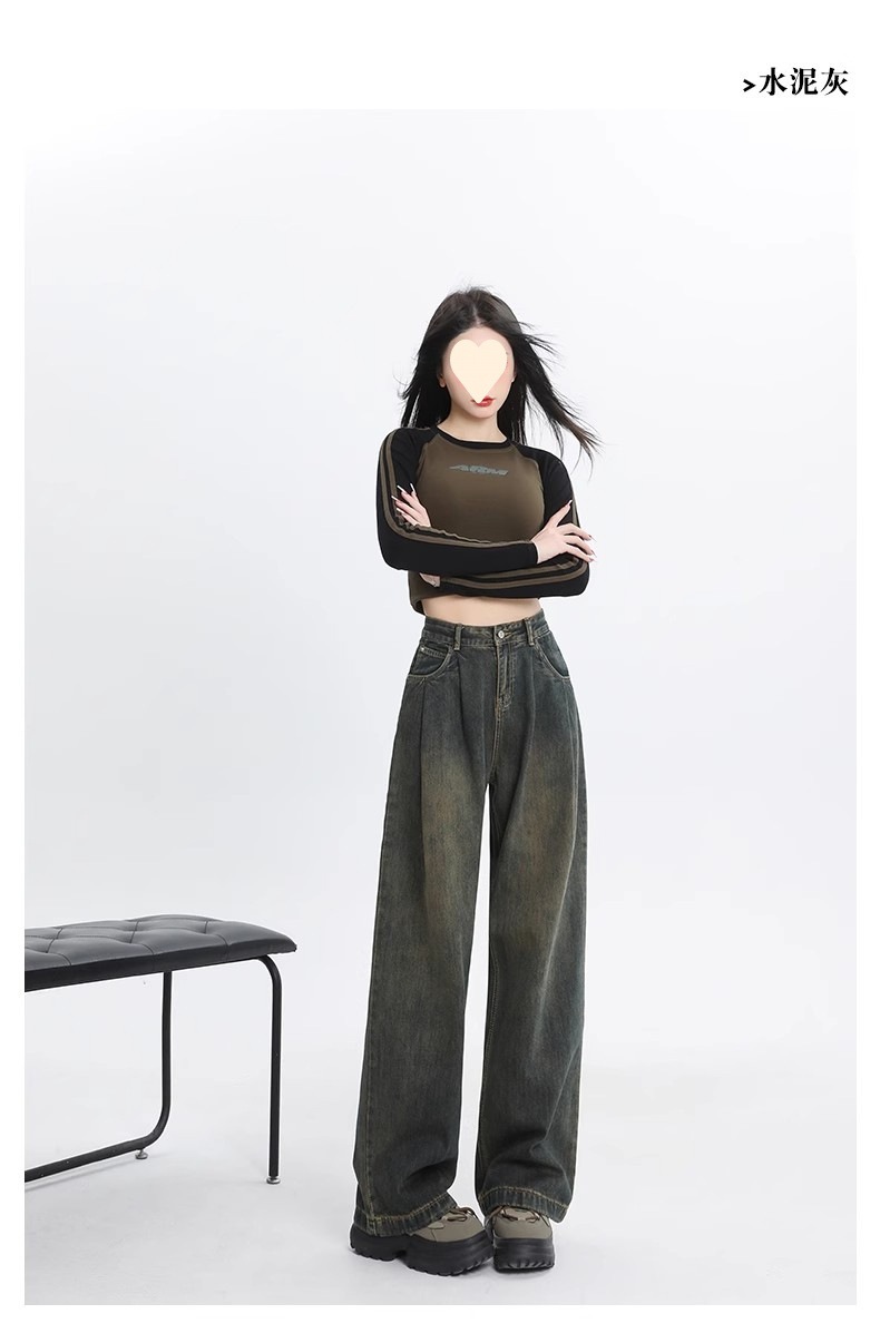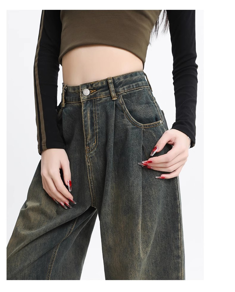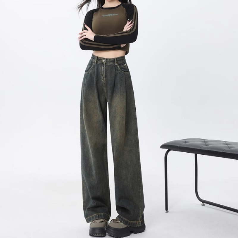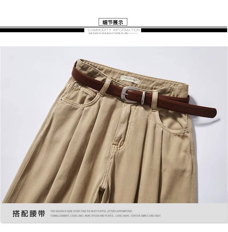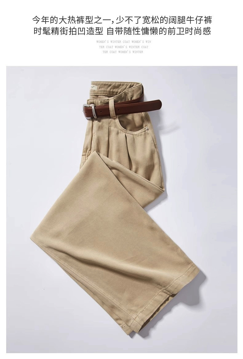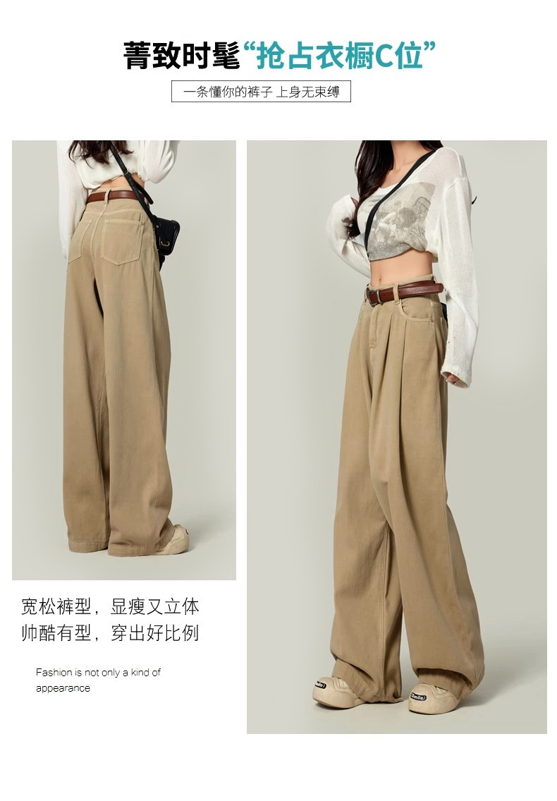 여성용 카키색 하이웨이스트 와이드 팬츠 2024 가을 신상 주름 디자인 루즈한 살을 커버하고 슬림해 보이는 스트레이트 팬츠스토어 가기
