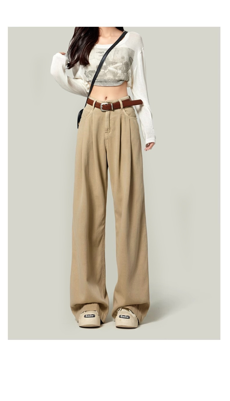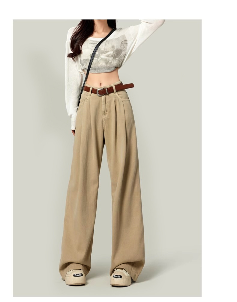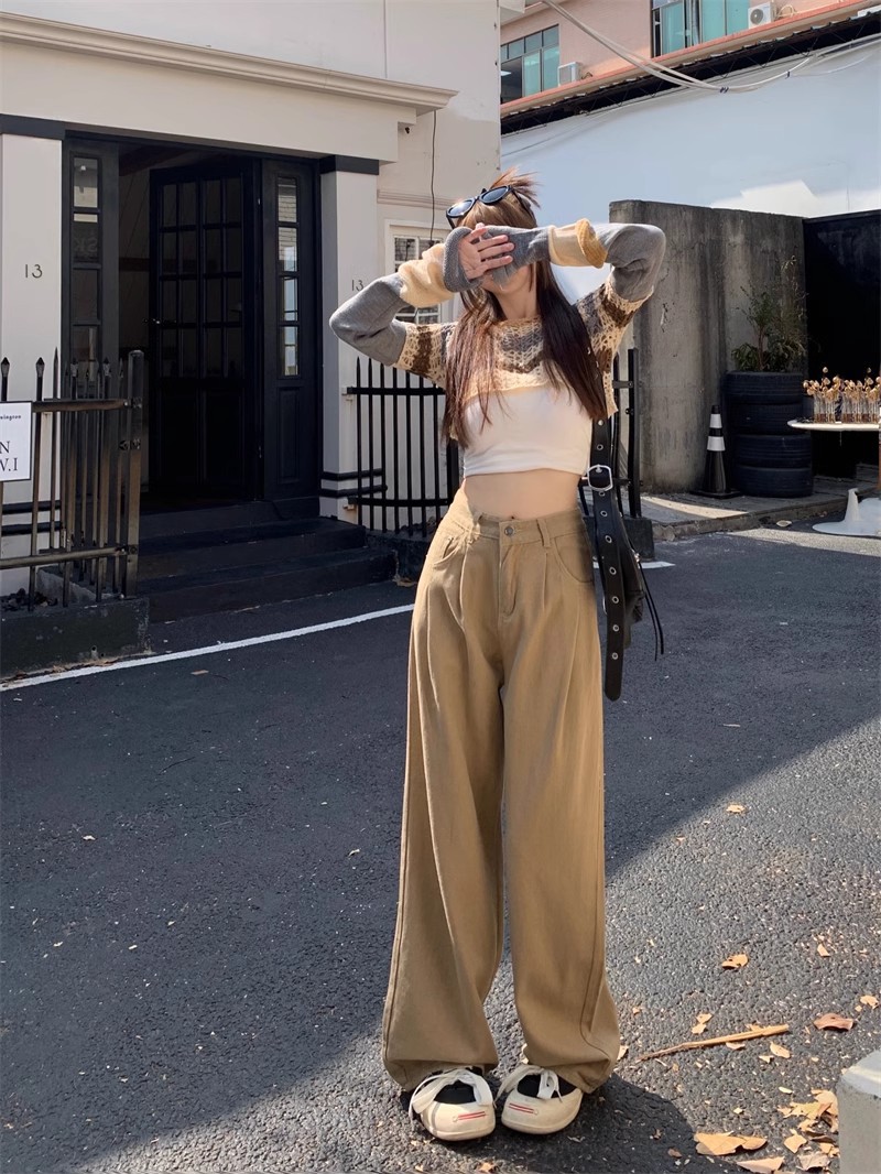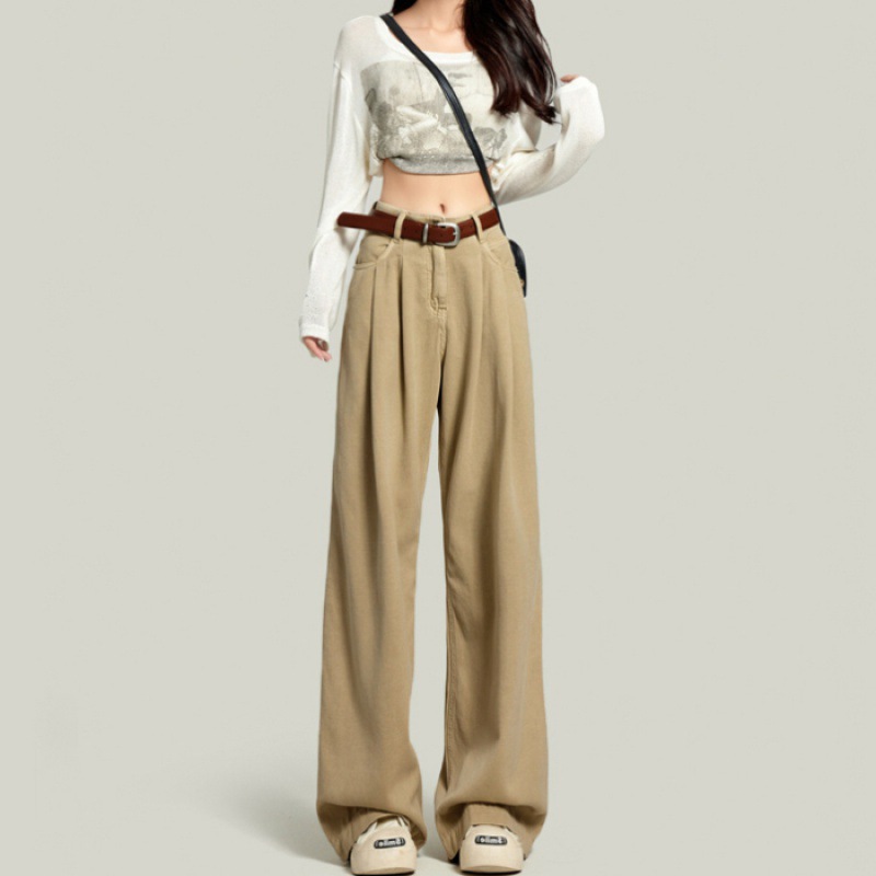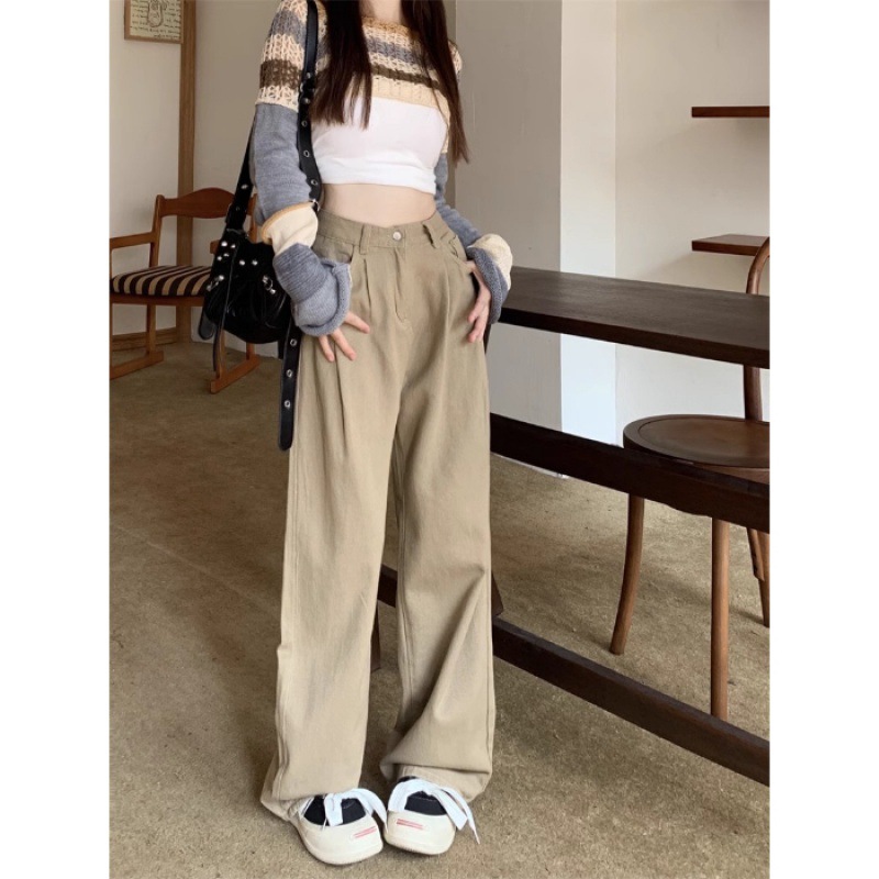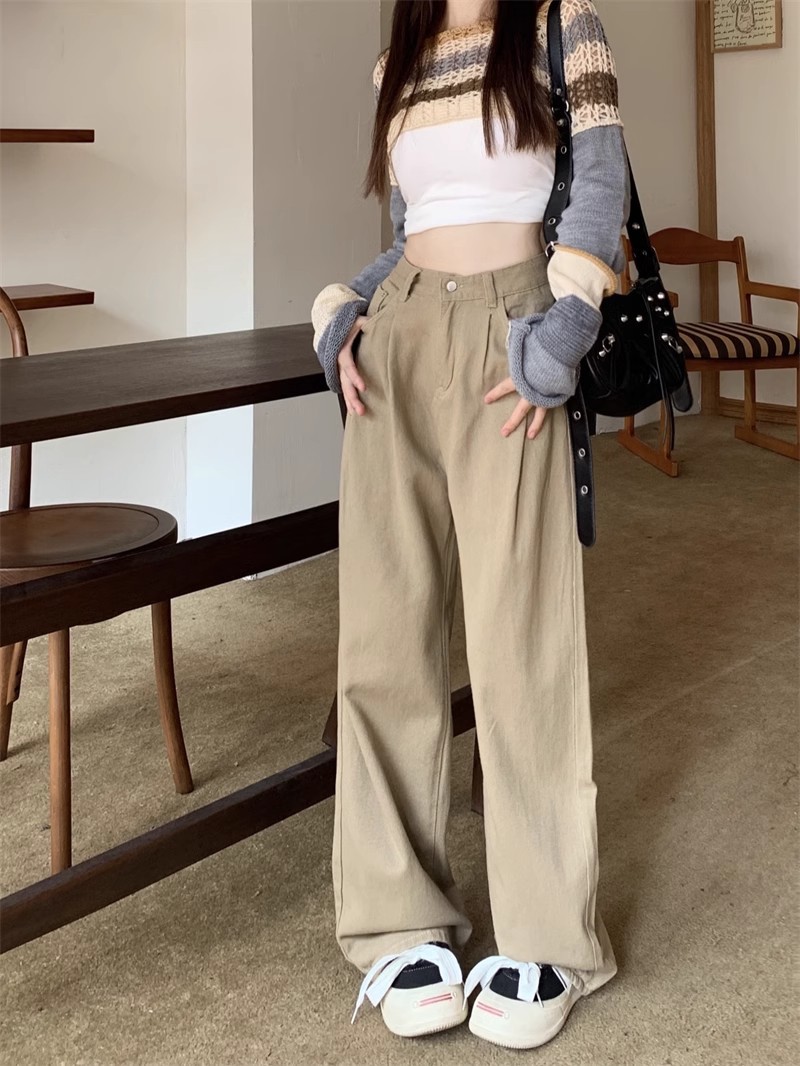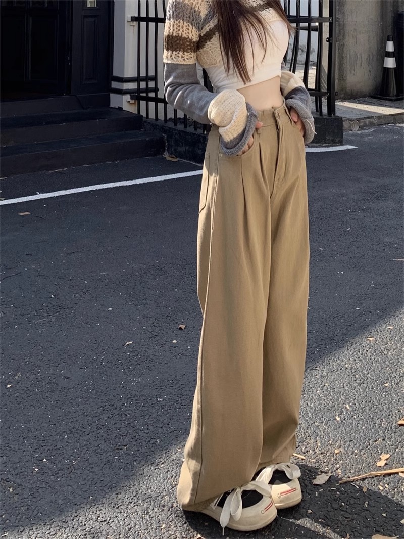 여성용 카키색 하이웨이스트 와이드 팬츠 2024 가을 신상 주름 디자인 루즈한 살을 커버하고 슬림해 보이는 스트레이트 팬츠