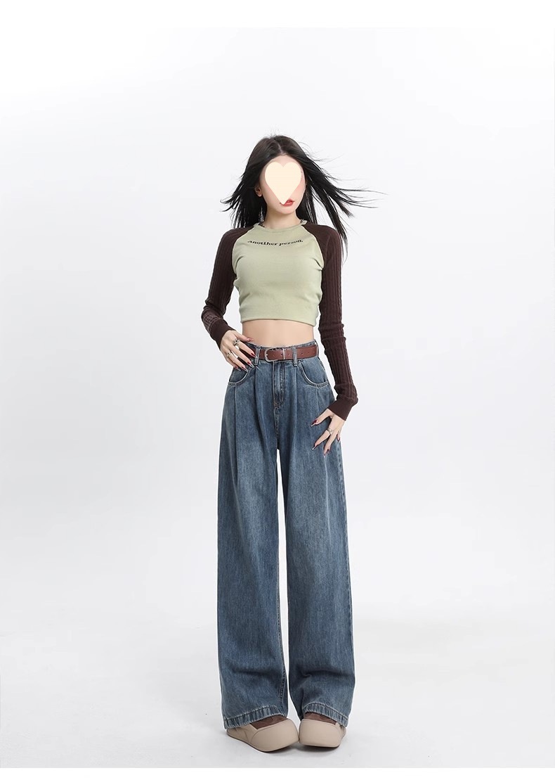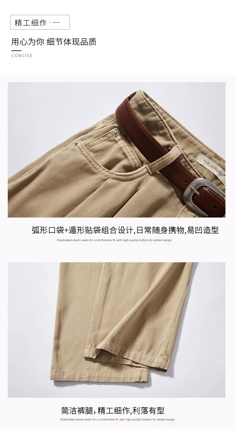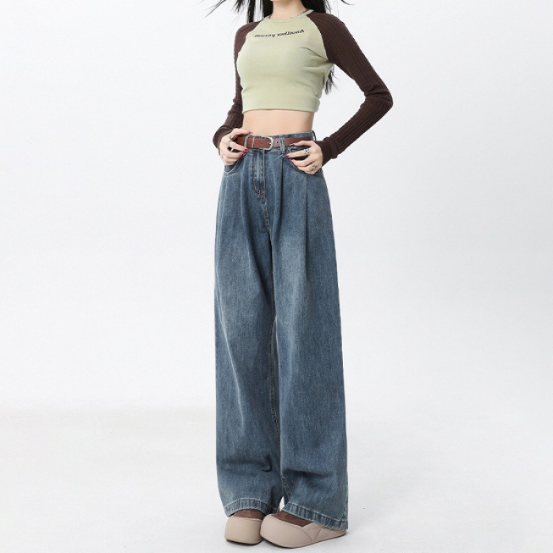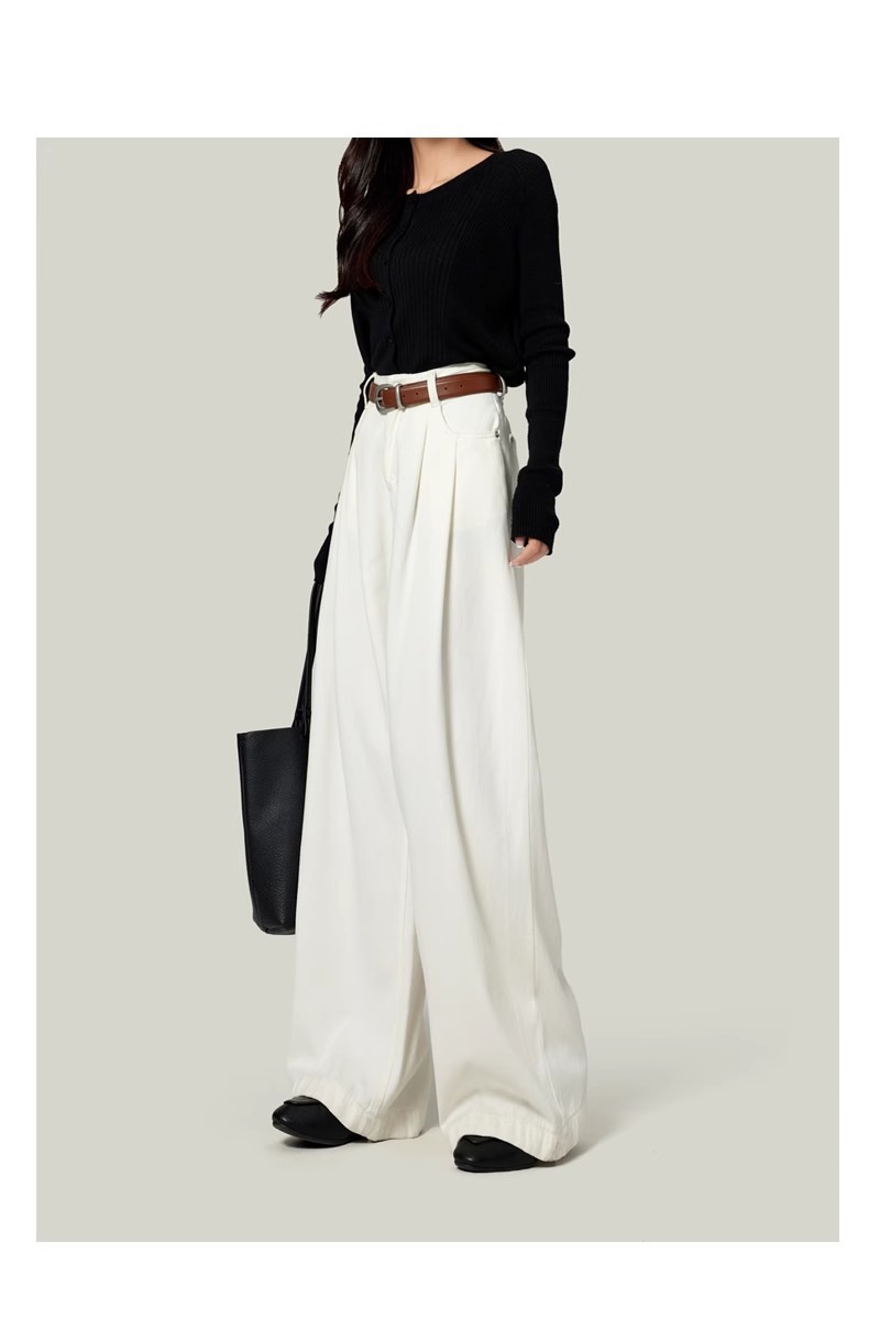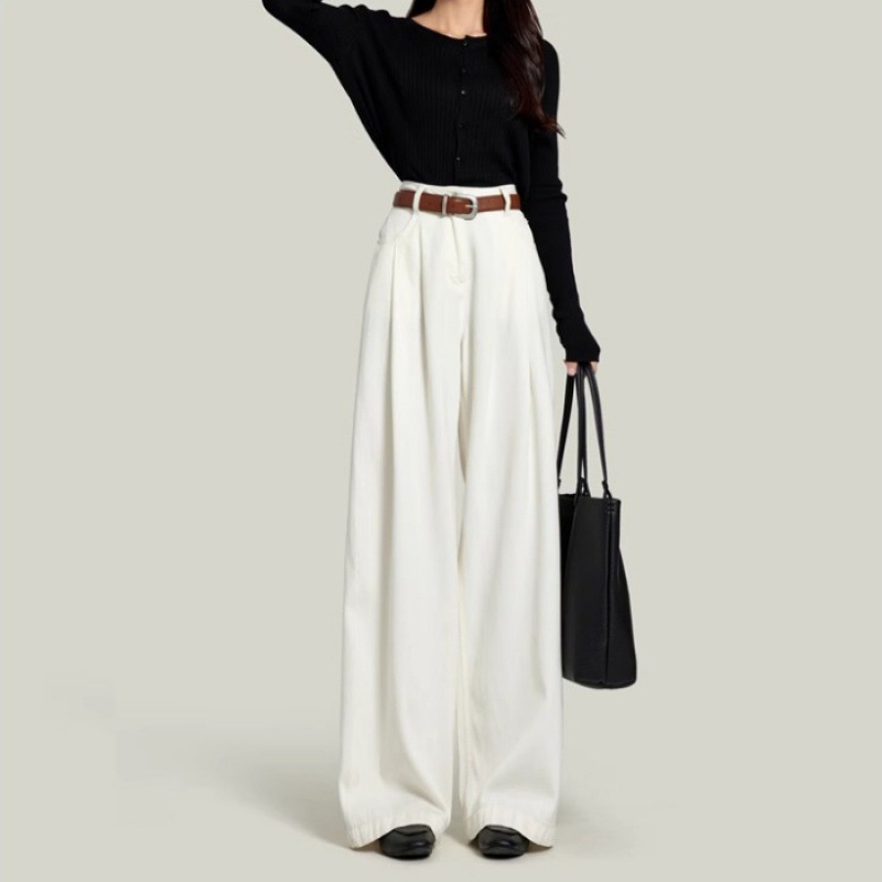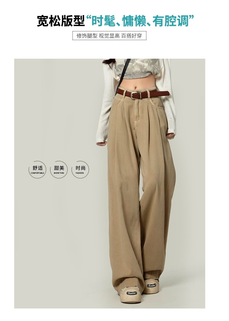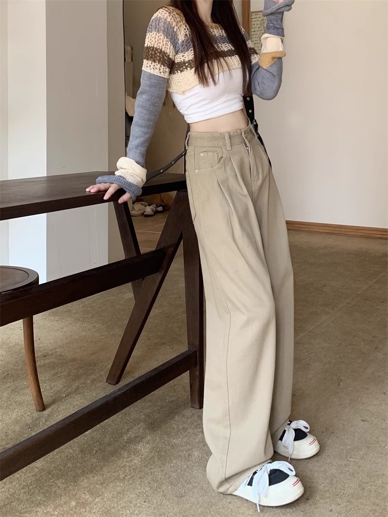 여성용 카키색 하이웨이스트 와이드 팬츠 2024 가을 신상 주름 디자인 루즈한 살을 커버하고 슬림해 보이는 스트레이트 팬츠
