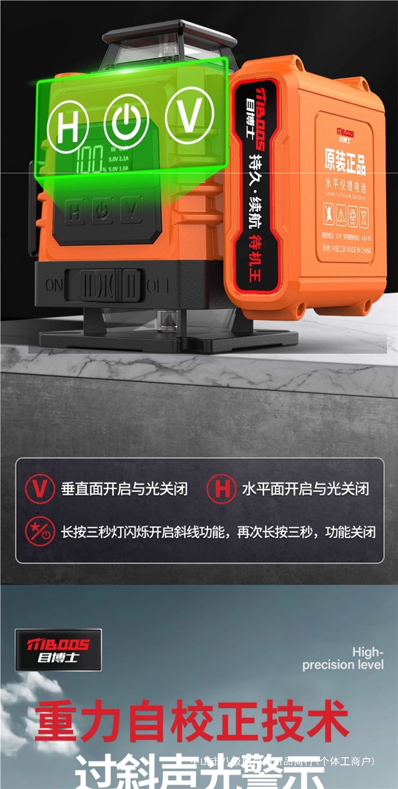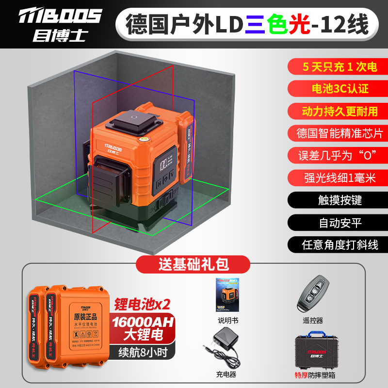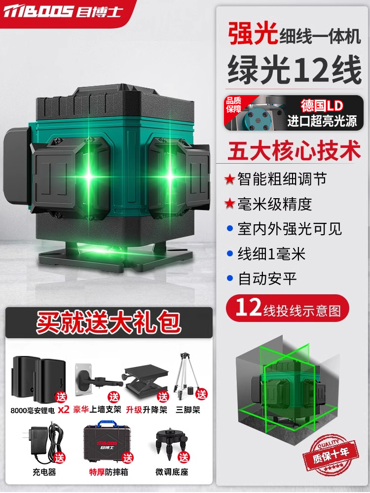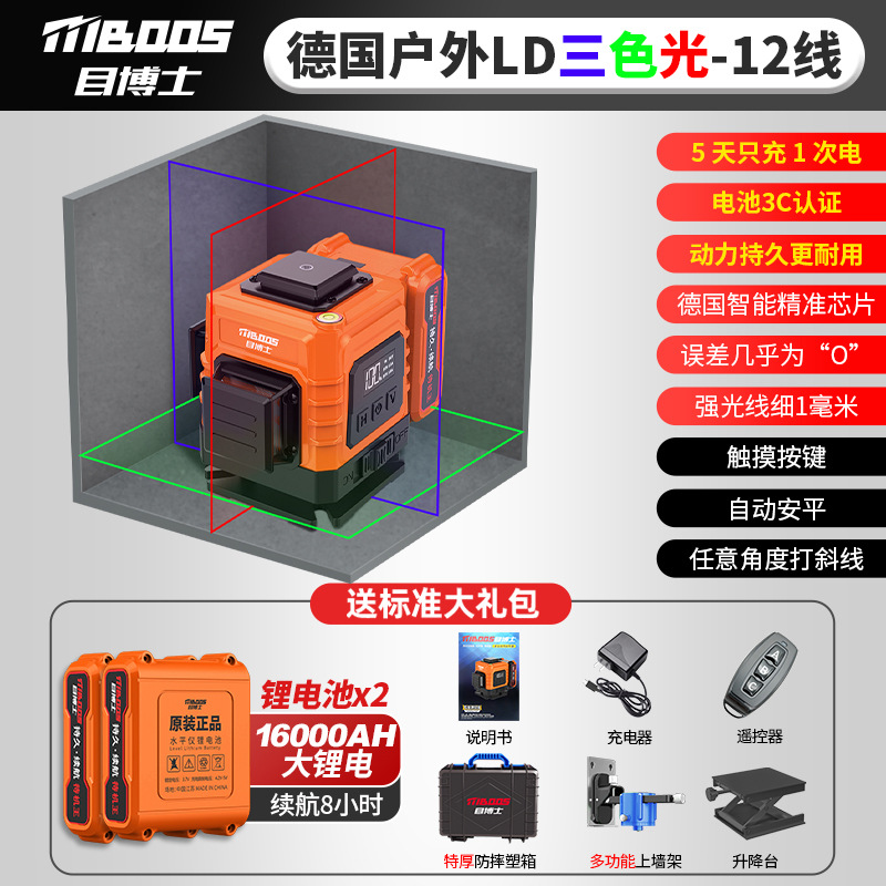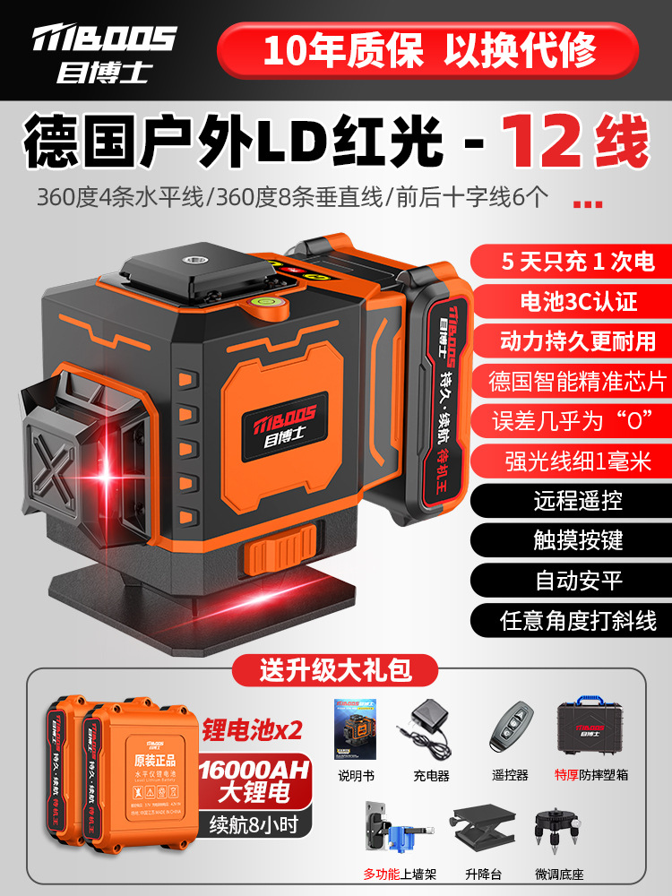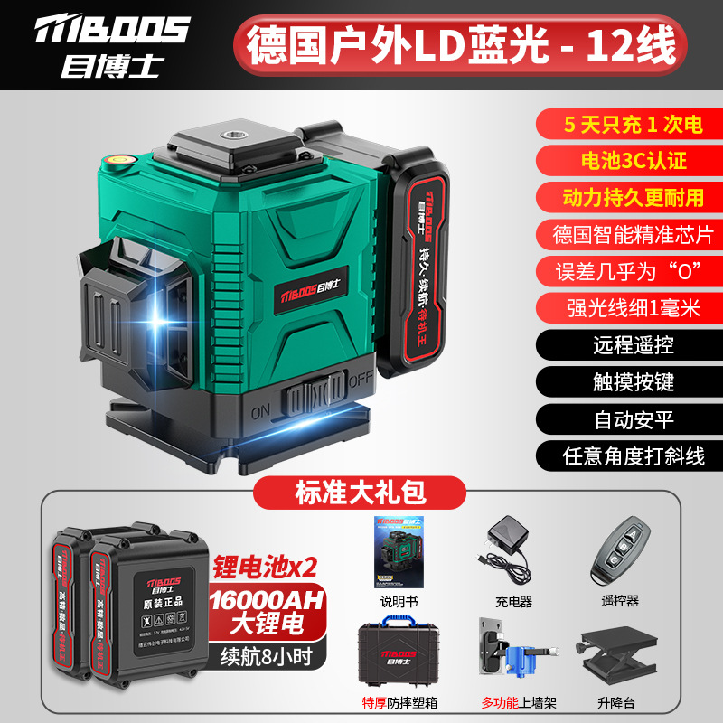 • 매우 밝은 녹색광 [수입 레이저 튜브] 12라인 듀얼 배터리 + 삼각대