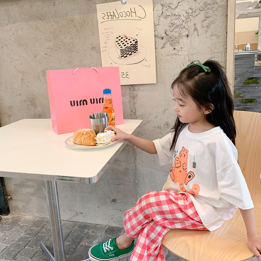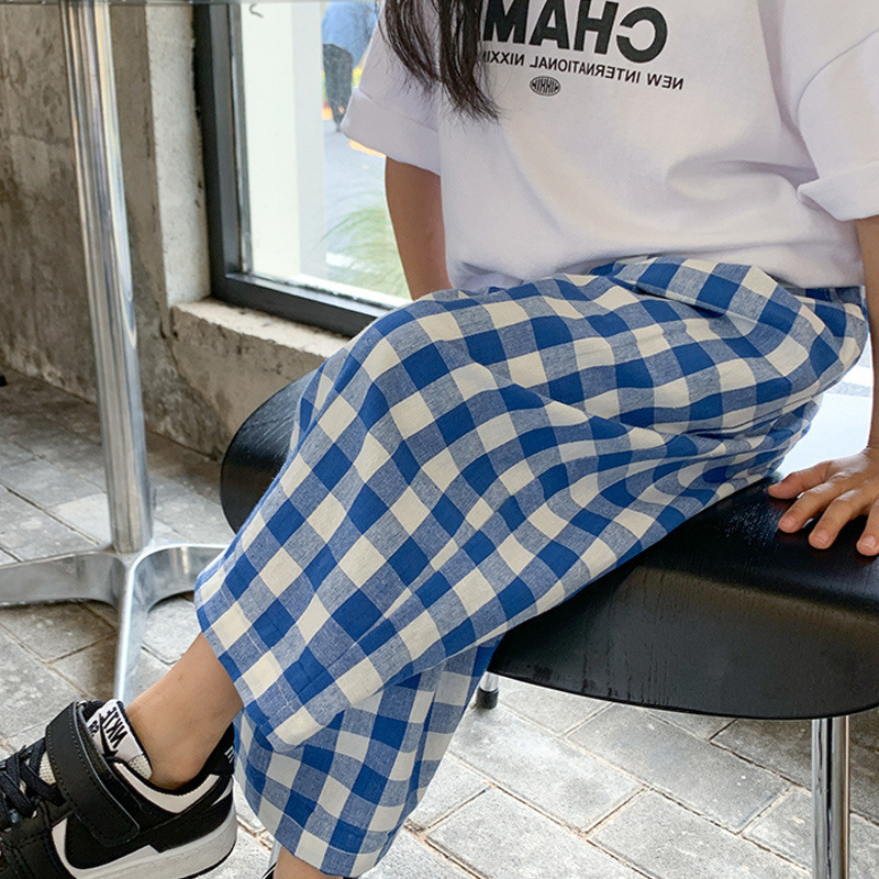 소녀의 격자 무늬 캐주얼 바지 2024 여름 새로운 어린이 유행 스포츠 캐주얼 바지 바지 바지 아기 느슨한 바지스토어 가기