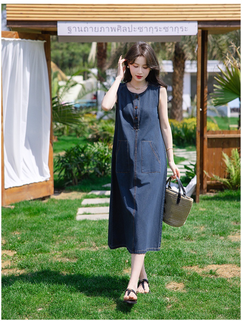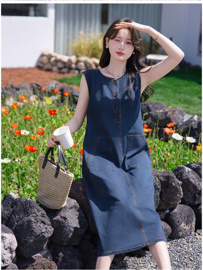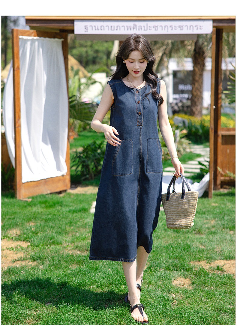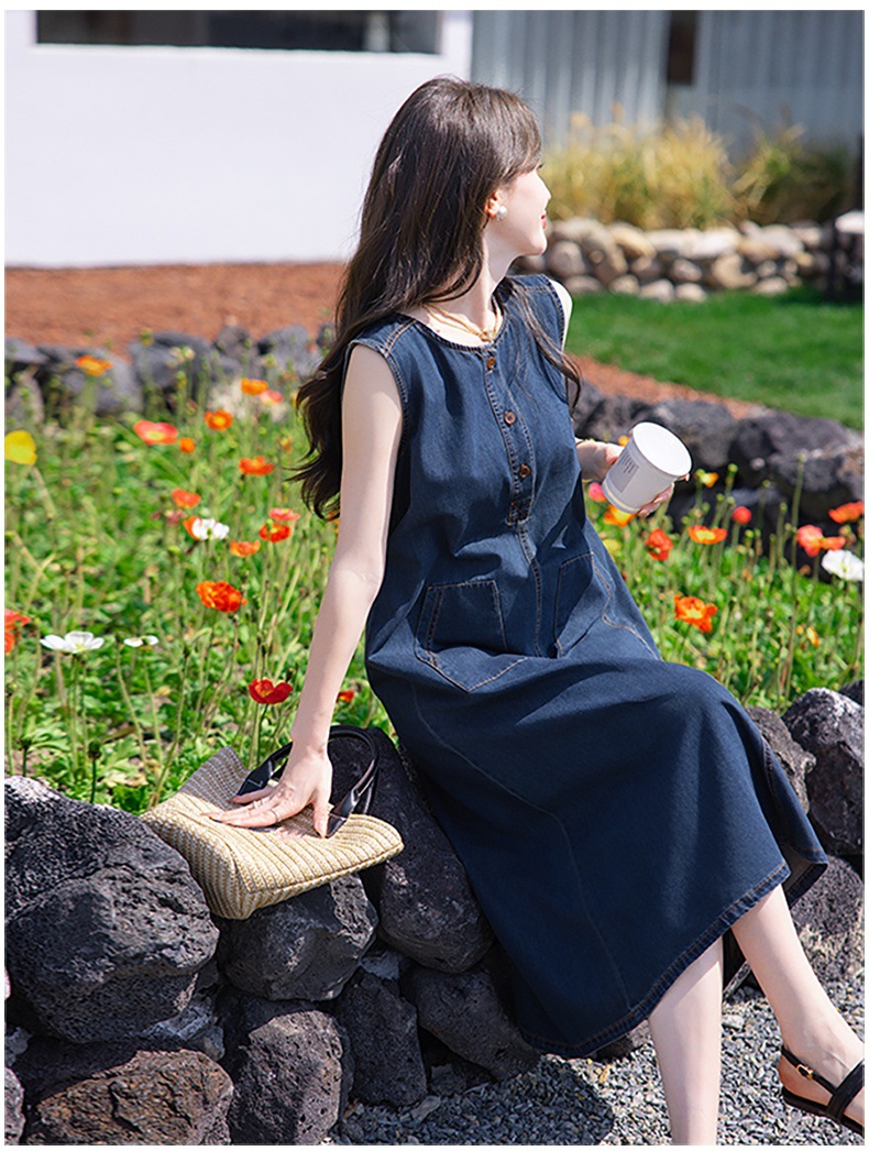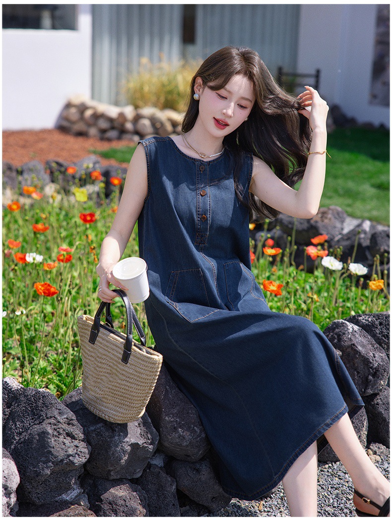 홍콩 스타일 레트로 민소매 조끼 데님 원피스 여름 느슨한 우아한 나이 감소 한국 스타일 긴 원피스