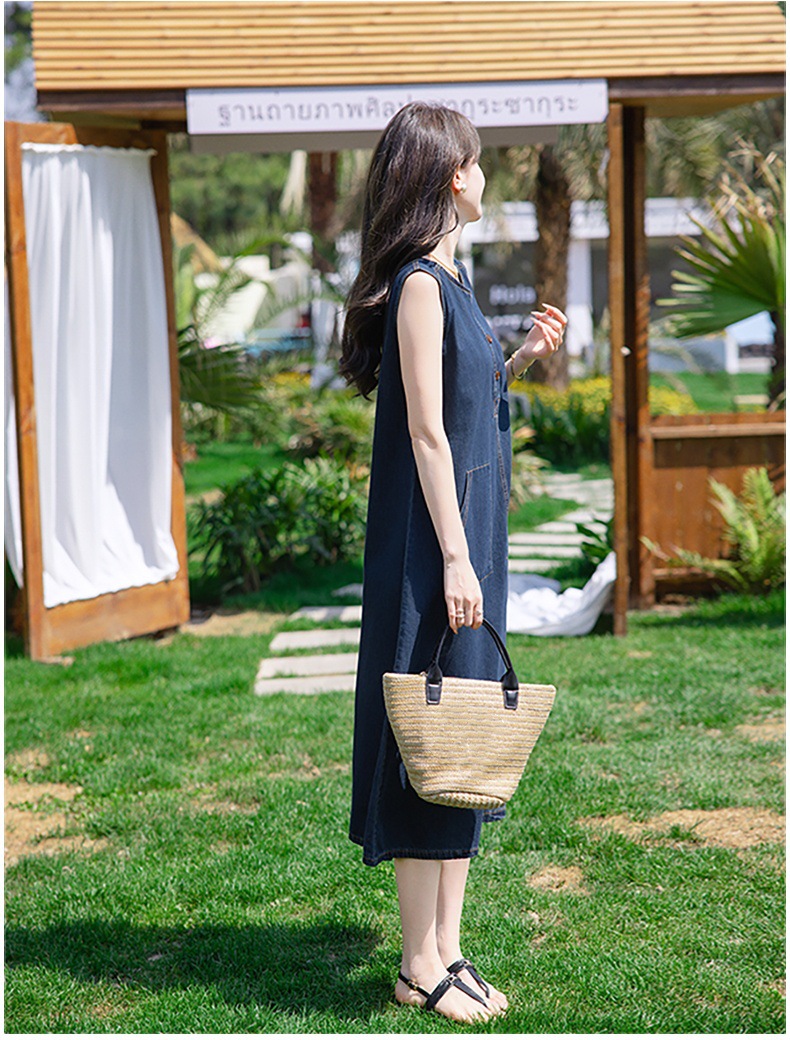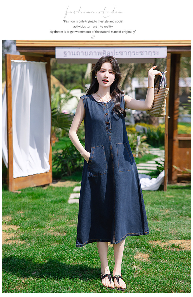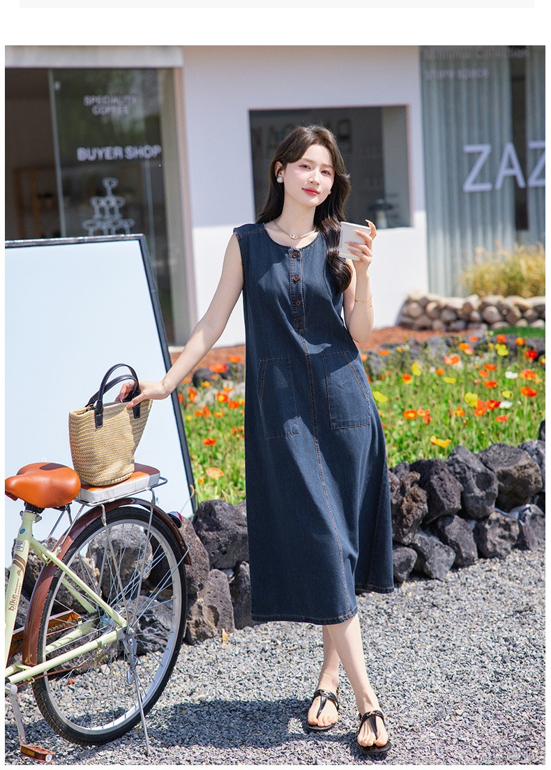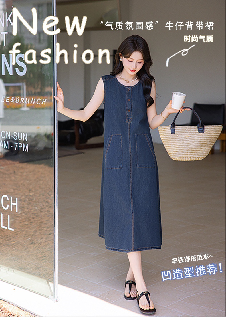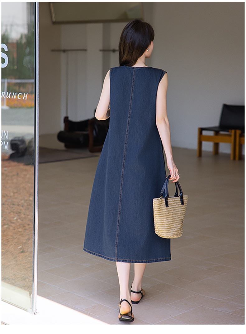 홍콩 스타일 레트로 민소매 조끼 데님 원피스 여름 느슨한 우아한 나이 감소 한국 스타일 긴 원피스