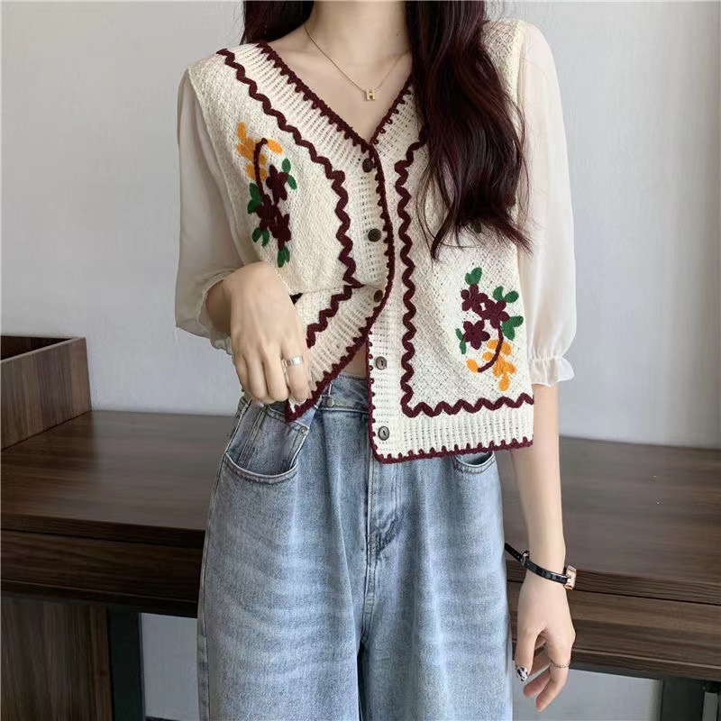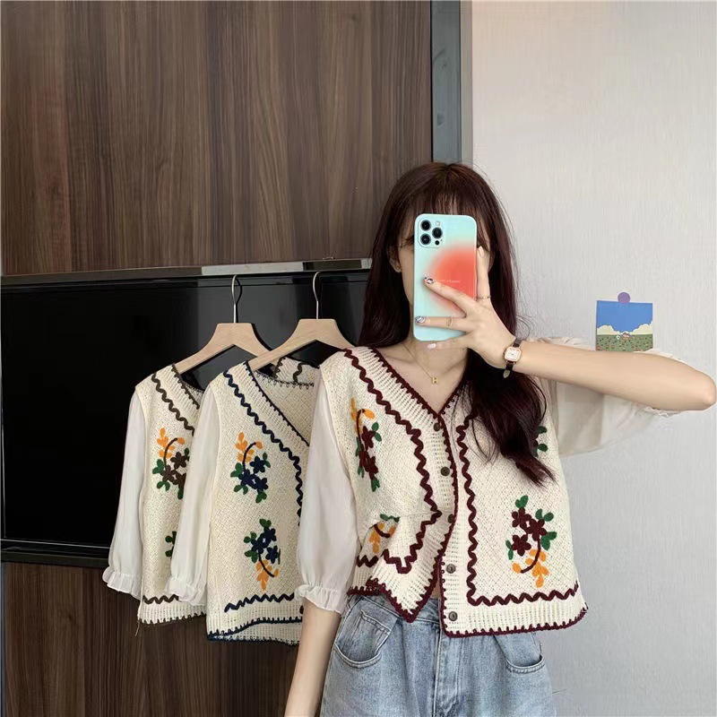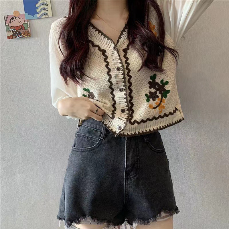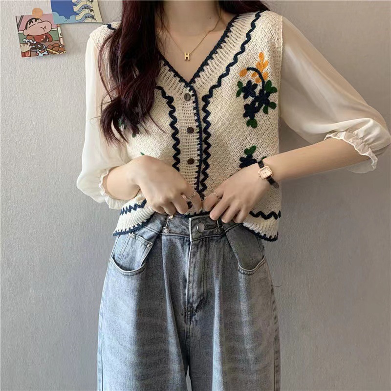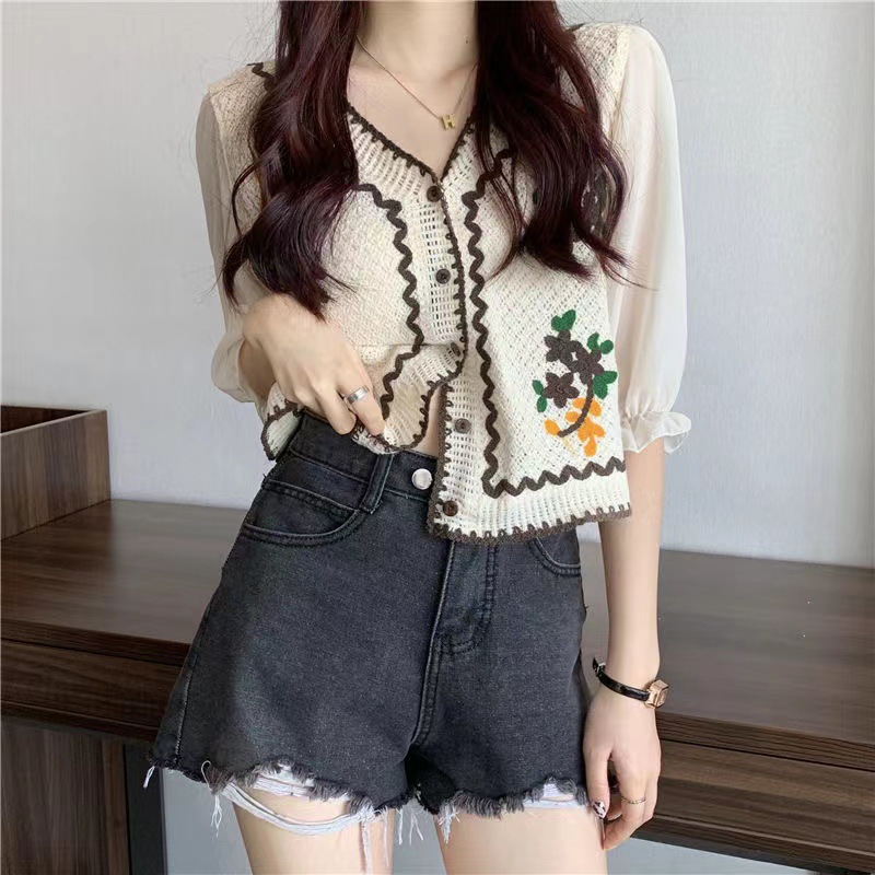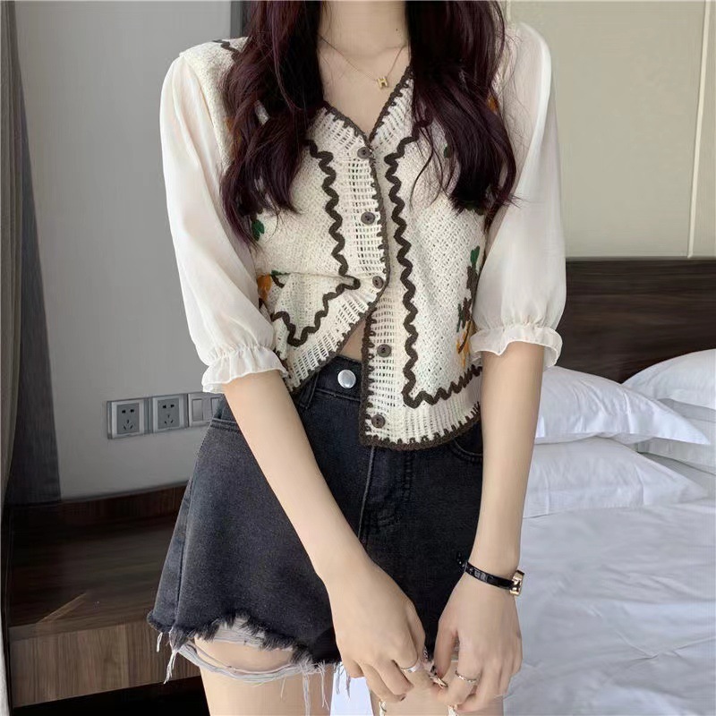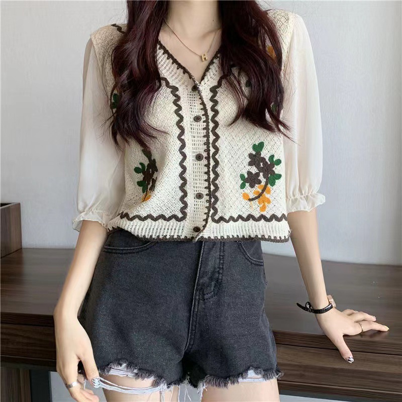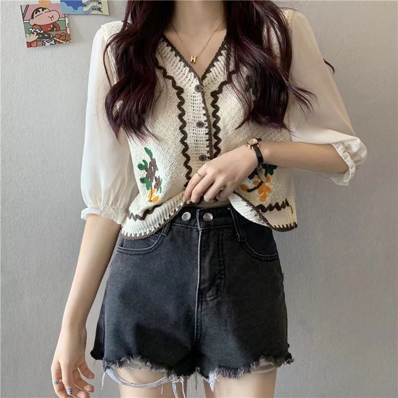 2025 여름 얇은 짧은 동남 아시아 달콤한 스플 라이스 쉬폰 미드 슬리브 니트 카디건 여성용 V 넥 대비 컬러 탑스토어 가기