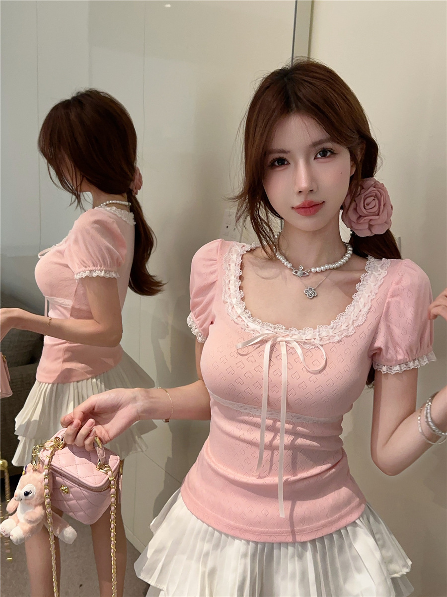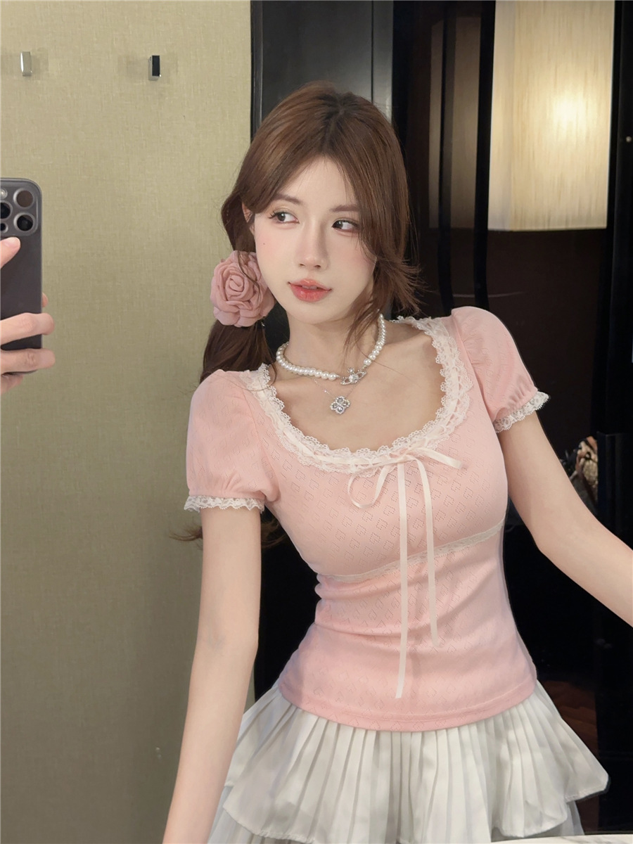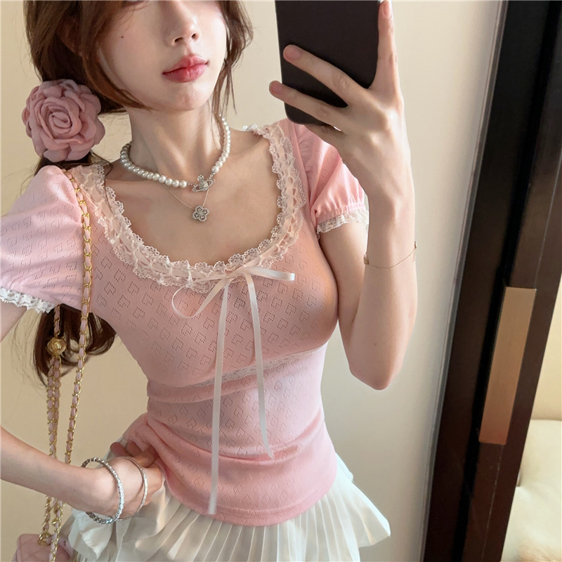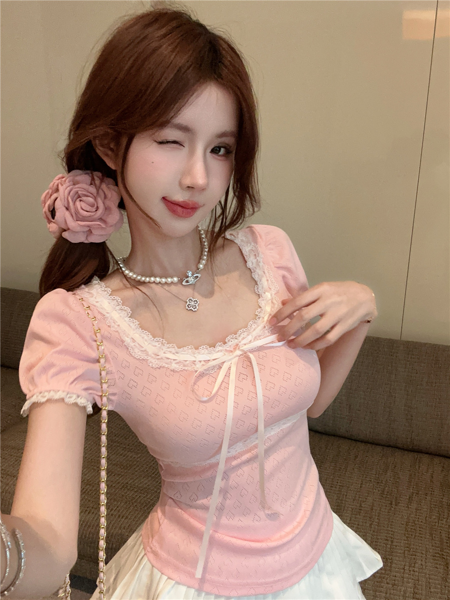 활 레이스 핑크 반팔 티셔츠 여성용 여름 순수 달콤한 스파이스 소녀 짧은 퍼프 소매 작은 탑 아름다운