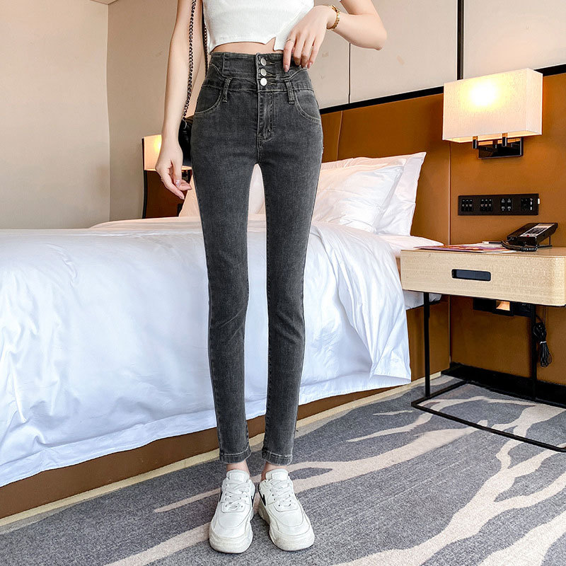3 버튼 벨리 투킨 '슈퍼 하이 허리 청바지 여성 가을 및 겨울 힙합 리프트 사이버로 유명한 꽉 끼는 스트레치 9 점 연필 바지스토어 가기