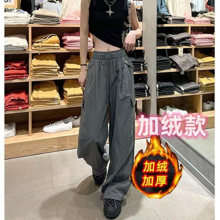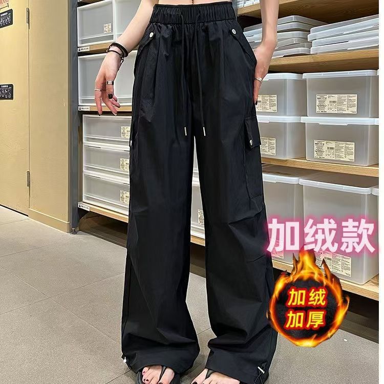 얇고 기모 미국 낙하산 바지 여성의 가을과 겨울 새로운 높은 허리 느슨한 빠른 건조 등산 와이드 레그 바지