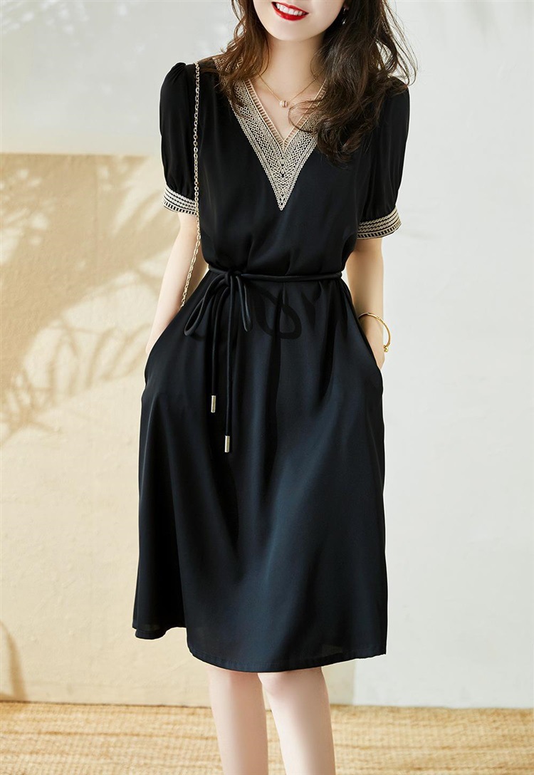 2023新款夏季短袖中长款裙子轻奢女装气质系带收腰显瘦高档连衣裙