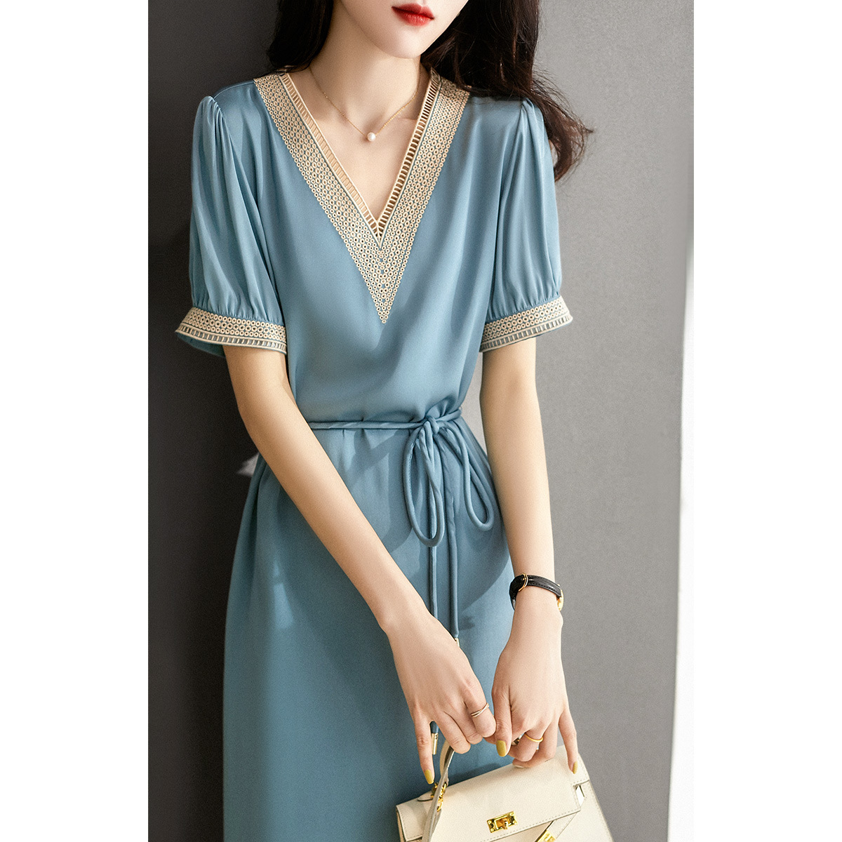 2023新款夏季短袖中长款裙子轻奢女装气质系带收腰显瘦高档连衣裙스토어 가기
