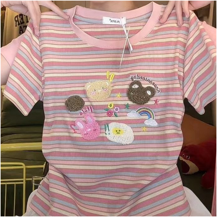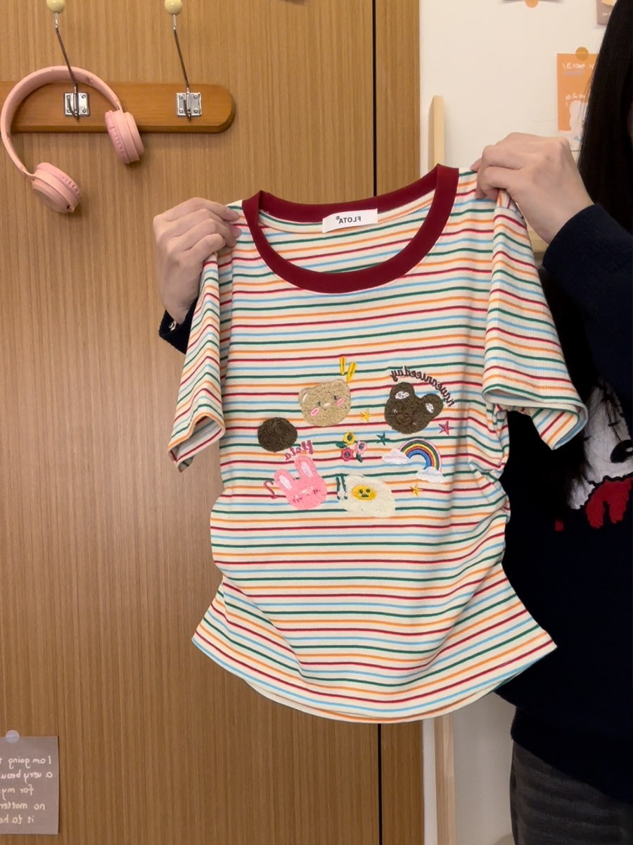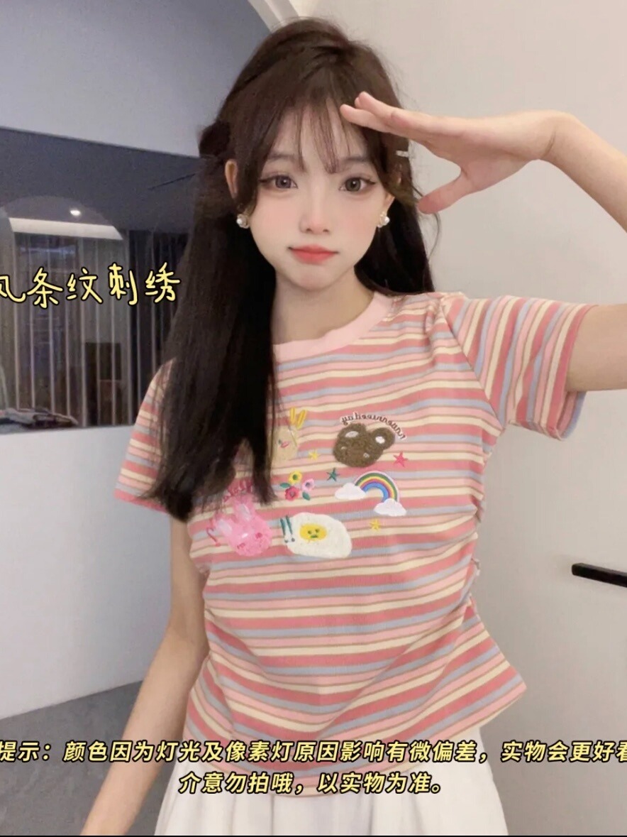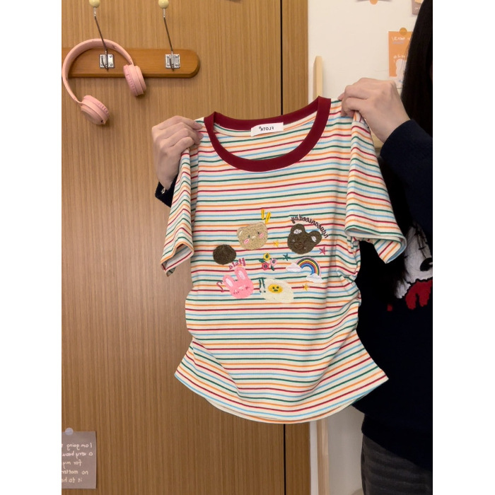 도파민 자수 레인보우 스트라이프 숄더 반팔 티셔츠 여성 여름 짧은 스위트 칼리지 스타일 연령 감소 탑인