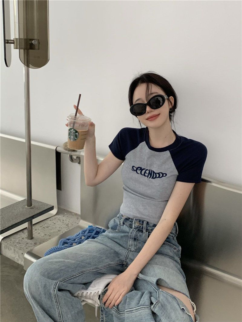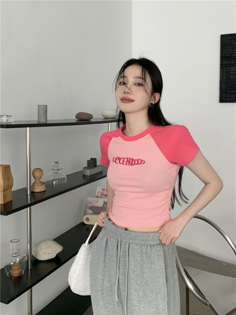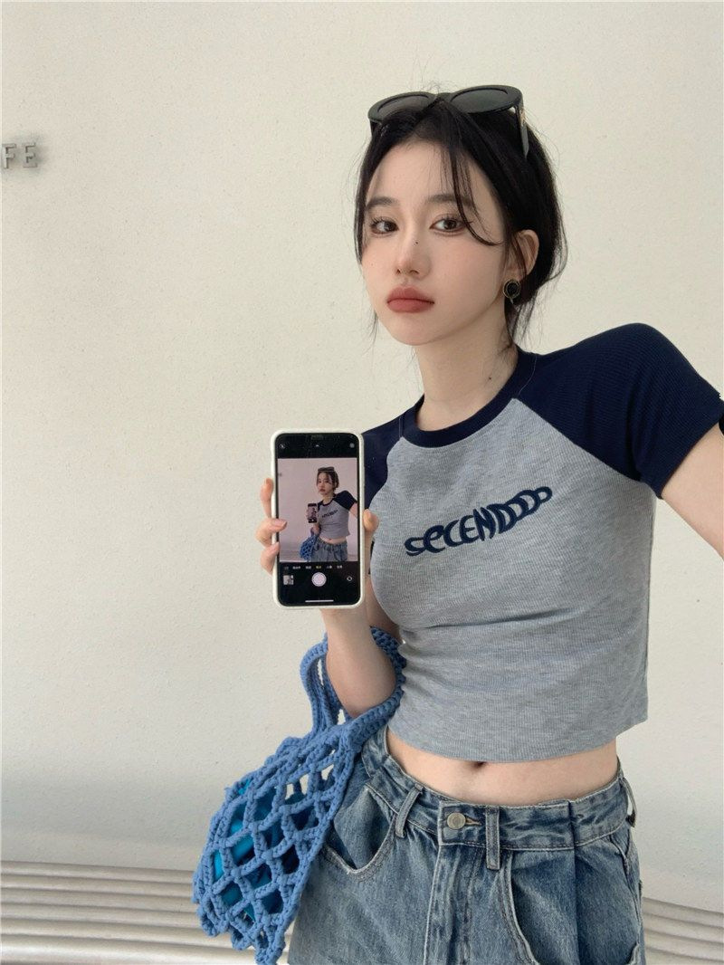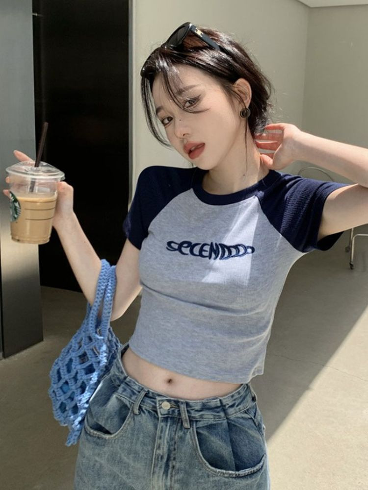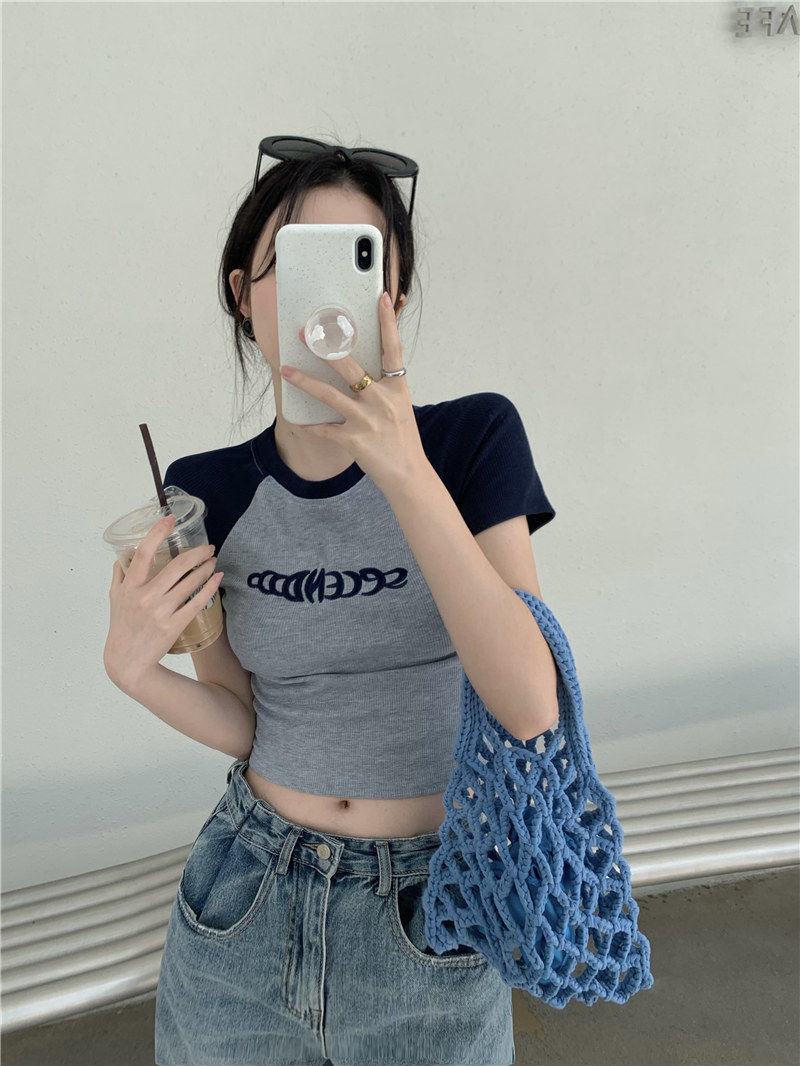 학생 슬림 셔츠 몸매를 보여주는 여름 짧은 스타일의 새로운 미국 스타일 ins pure desire 여성 2024 탑 반팔 핫 소녀스토어 가기