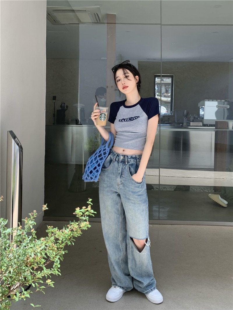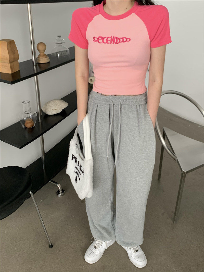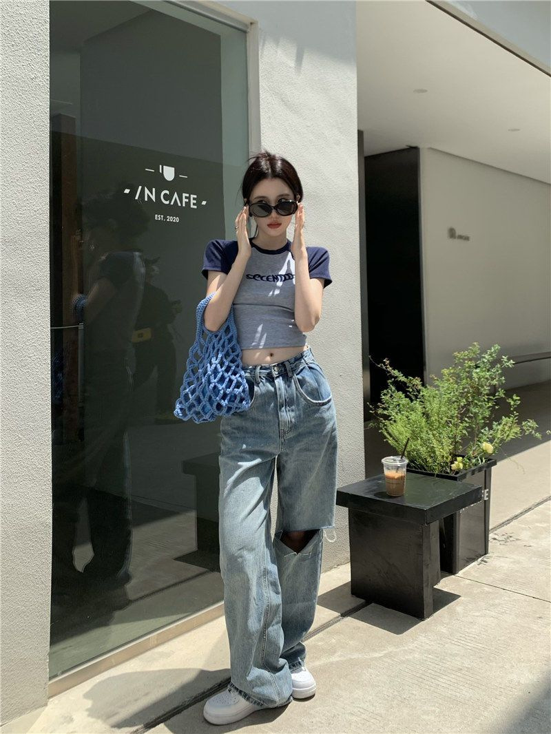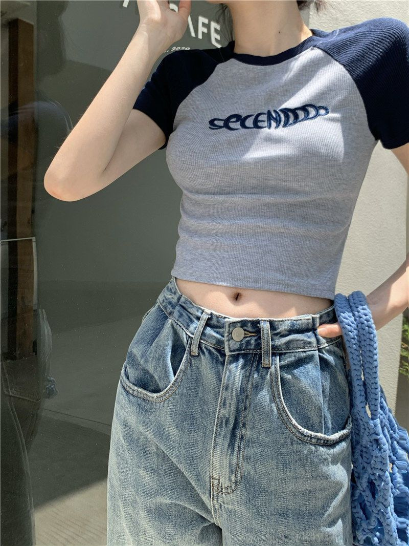 학생 슬림 셔츠 몸매를 보여주는 여름 짧은 스타일의 새로운 미국 스타일 ins pure desire 여성 2024 탑 반팔 핫 소녀스토어 가기