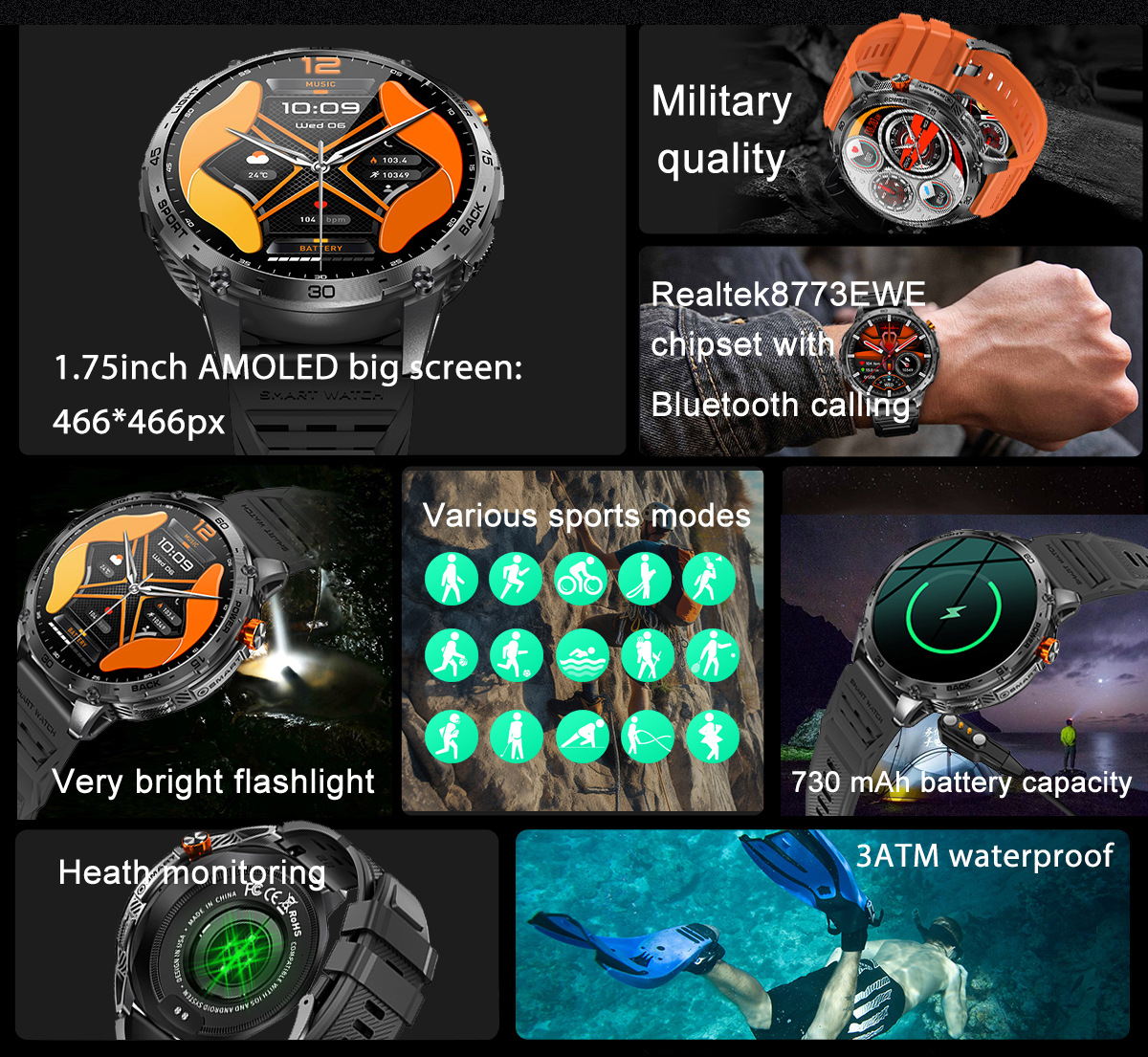 1.75寸AMOLED低功耗全圆屏易更换表带,标准22mm海量表盘推送,自定义表盘蓝牙通话/蓝牙音乐(超清晰音质),天气显示心率检测、血压检测、血氧检测,全天心率检测手电筒,时间显示,计步,卡路里,距离,心率,血压,血氧,睡眠时间,开关机显示,秒表,多运动模式睡眠监测(睡眠时间、睡眠质量)来电通知,信息提醒,多国语言推送,闹钟提醒,远程拍照,久坐提醒手环支持多国语言730毫安大电池,超长待机,屏幕显示在户外非常亮同步数据到APK/APPAPP/APK下载方式安卓和苹果应用同步FitCloudPro