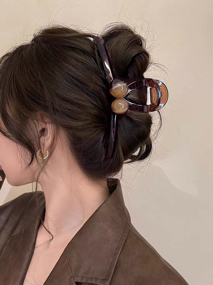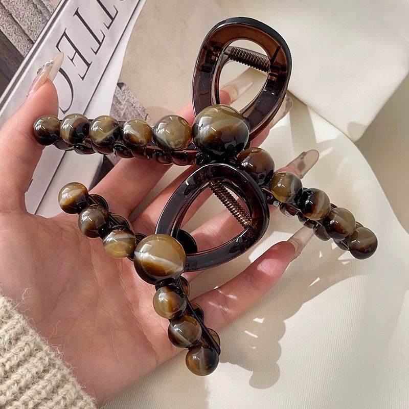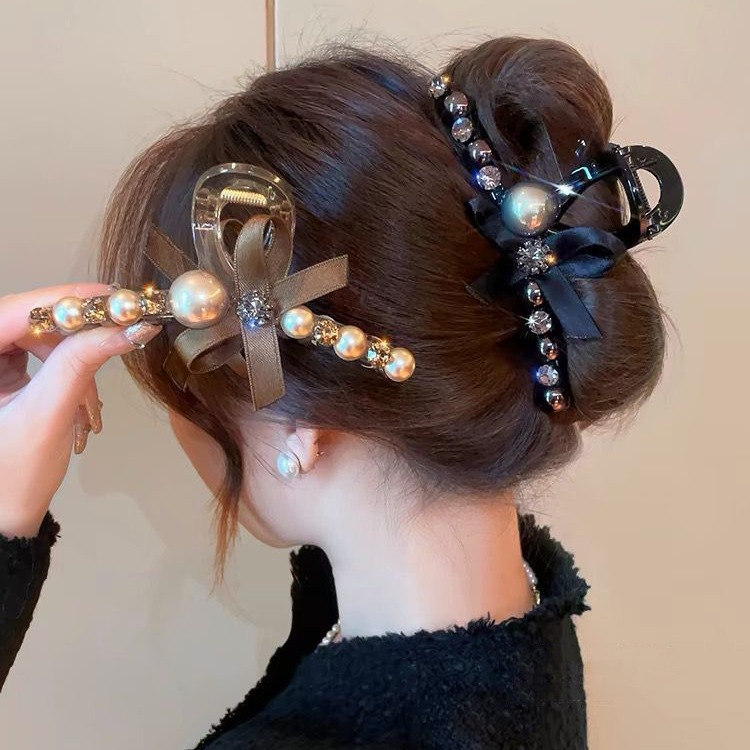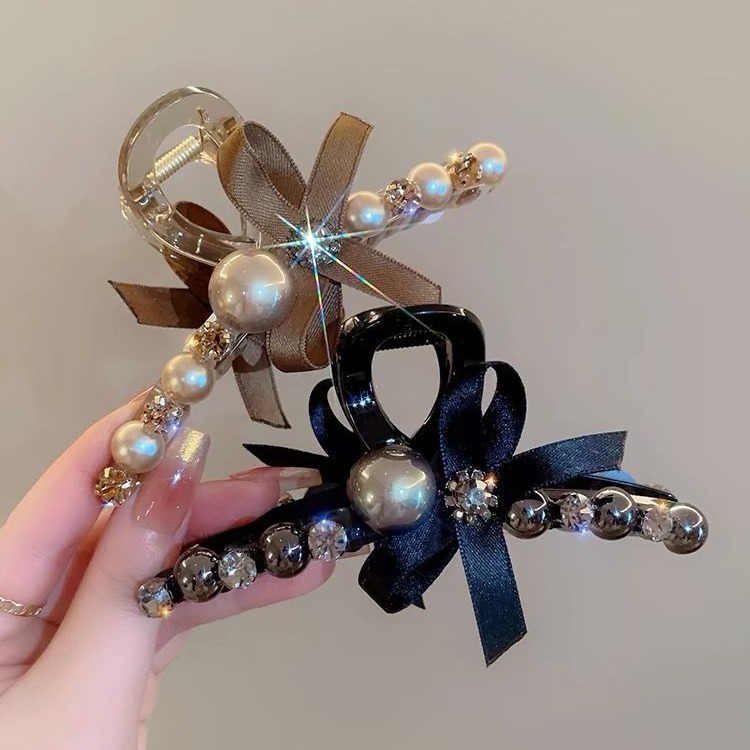轻奢高级感咖色珍珠水钻抓夹女后脑勺盘发鲨鱼夹大号发夹头饰发卡