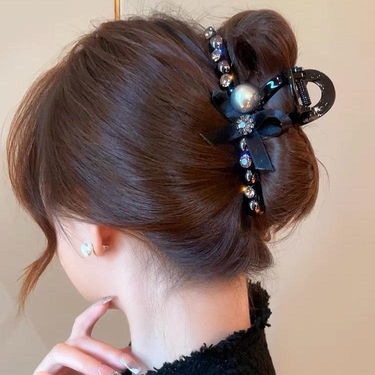 高级感缎面大号黑色蝴蝶结鲨鱼夹头饰方形钻后脑勺发夹抓夹女发卡
