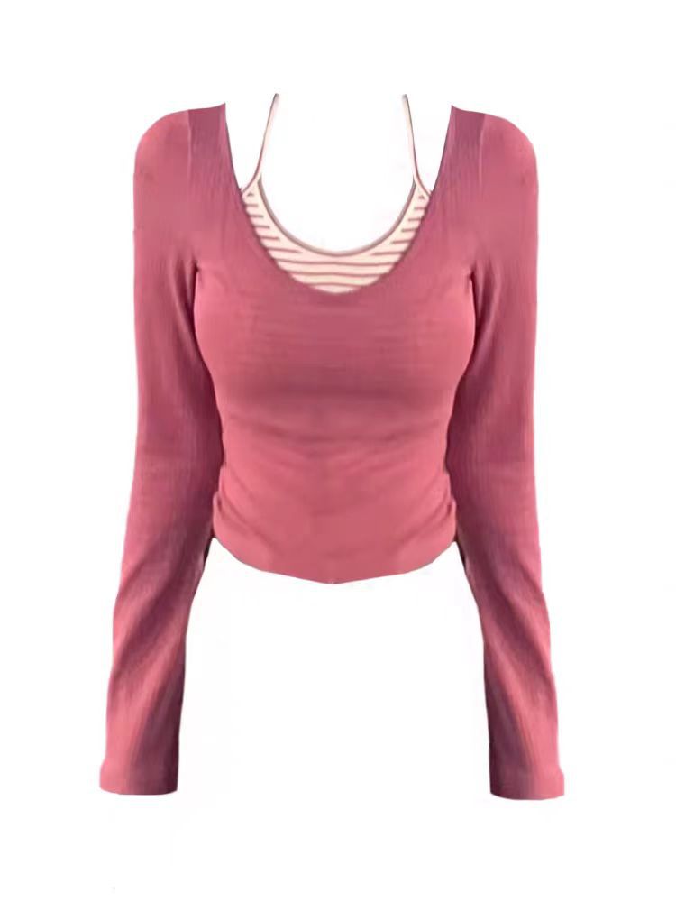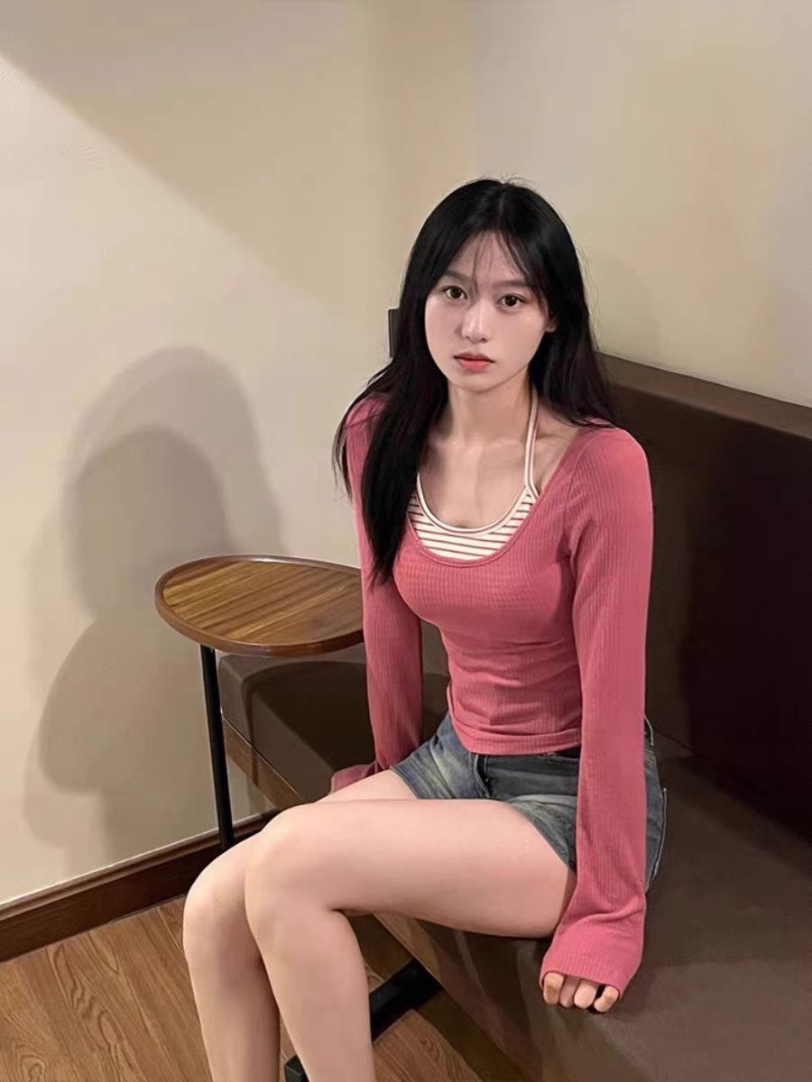 24 년 패션 초가을 슬림 핏 내베이스 셔츠 도파민 스파이스 탑 핑크 긴 소매 티셔츠 여성용 투피스 세트스토어 가기
