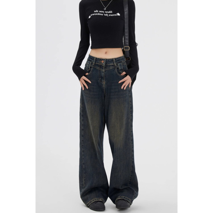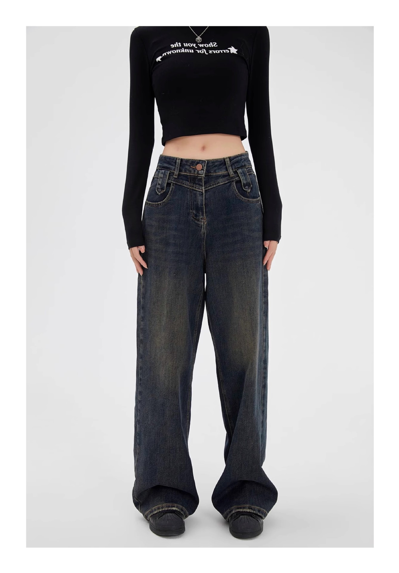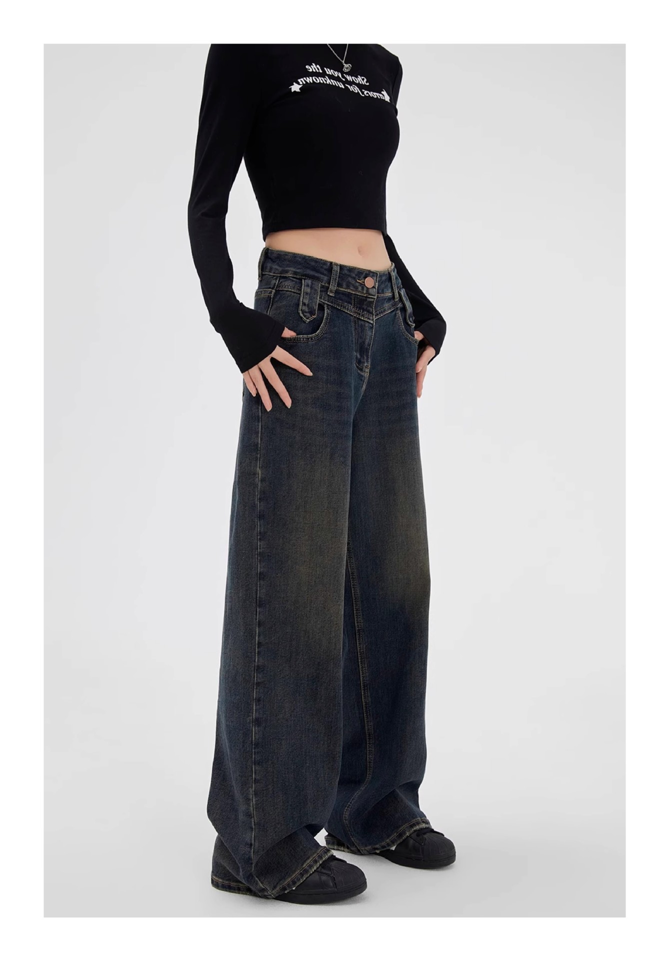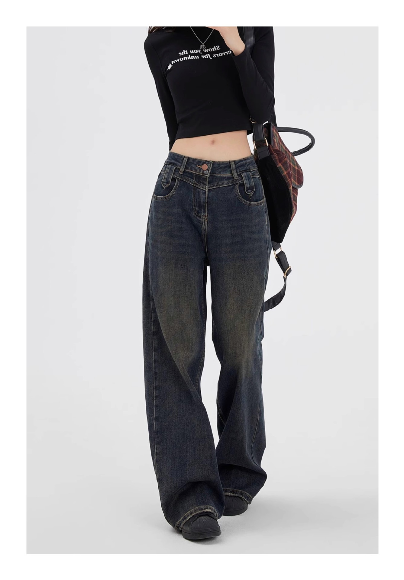 스트레치 아메리칸 레트로 스트레이트 딥 청바지 2024 가을 새로운 높은 허리 슬리밍 넓은 다리 바지