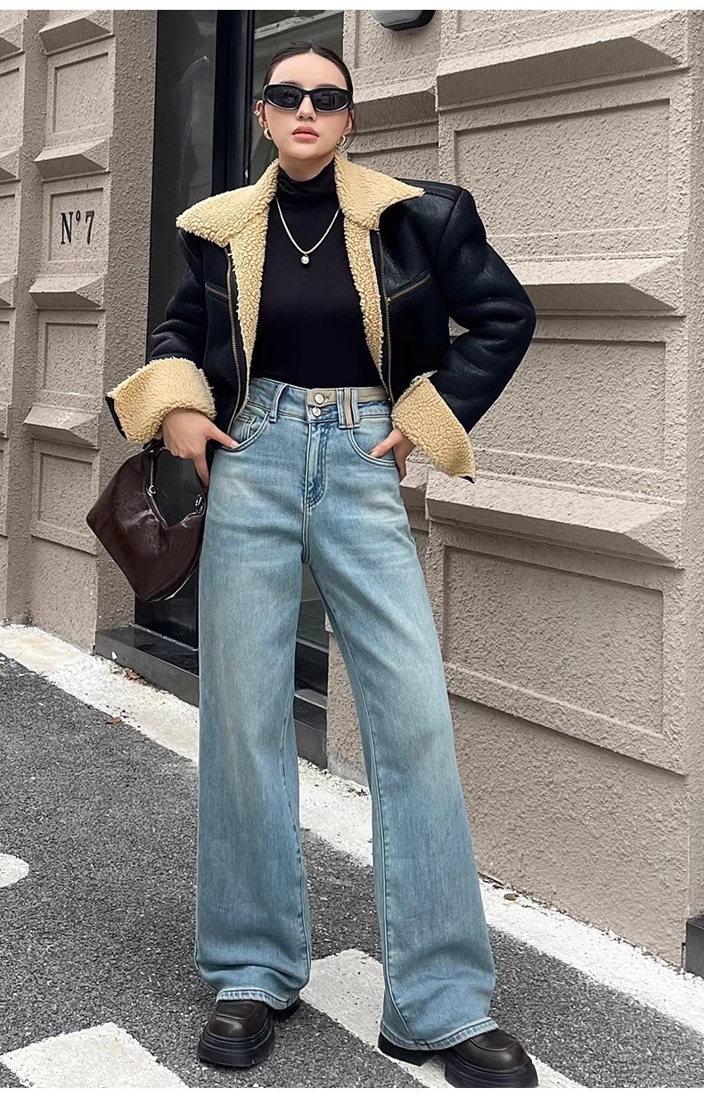 기모 두꺼운 계절 컬러 스트레이트 청바지 여성의 가을과 겨울 2023 새로운 배 모양의 높은 허리 바닥 바지스토어 가기